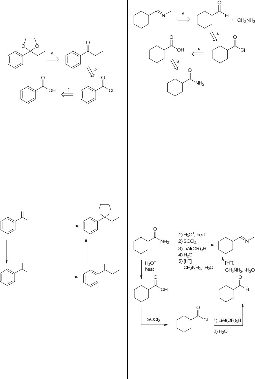 814 CHAPTER 20 \20.69. (a) There are certainly many acceptable solutions to this problem. One such solution derives from the following retrosynthetic analysis. An explanation of each of the steps (a-c) follows. a. The desired cyclic acetal can be made from the corresponding ketone (via acetal formation). b. The ketone can be made from benzoyl chloride, upon treatment with lithium diethyl cuprate. c. The acid halide can be prepared from benzoic acid. Now let’s draw the forward scheme. Benzoic acid is converted to benzoyl chloride upon treatment with thionyl chloride. Subsequent reaction with lithium diethyl cuprate installs an ethyl group, giving a ketone. An acid-catalyzed reaction with ethylene glycol (with removal of water) produces the desired cyclic acetal. OH O OO1) SOCl2 2) Et2CuLi 3) HOCH2CH2OH, [H+], -H2O Cl O SOCl2 Et2CuLi O HOCH2CH2OH, [H+], -H2O (b) There are certainly many acceptable solutions to this problem. One such solution derives from the following retrosynthetic analysis. An explanation of each of the steps (a-d) follows. a. The desired imine can be made from the corresponding aldehyde. b. The aldehyde can be made from the corresponding acid chloride, upon treatment with LiAl(OR)3H, followed by water work-up. c. The acid chloride can be prepared from the corresponding carboxylic acid, upon treatment with thionyl chloride. d. The carboxylic acid can be made via hydrolysis of the starting amide. Now let’s draw the forward scheme. Acid catalyzed hydrolysis of the amide gives a carboxylic acid which is then converted to the acid chloride upon treatment with thionyl chloride. Reaction with a lithium trialkoxyaluminum hydride, followed by water, produces the aldehyde. Subsequent treatment of the aldehyde with methylamine under acid-catalyzed conditions (with removal of water) gives the desired imine. (c) There are certainly many acceptable solutions to this problem. One such solution derives from the following retrosynthetic analysis. An explanation of each of the steps (a-d) follows. www.MyEbookNiche.eCrater.com