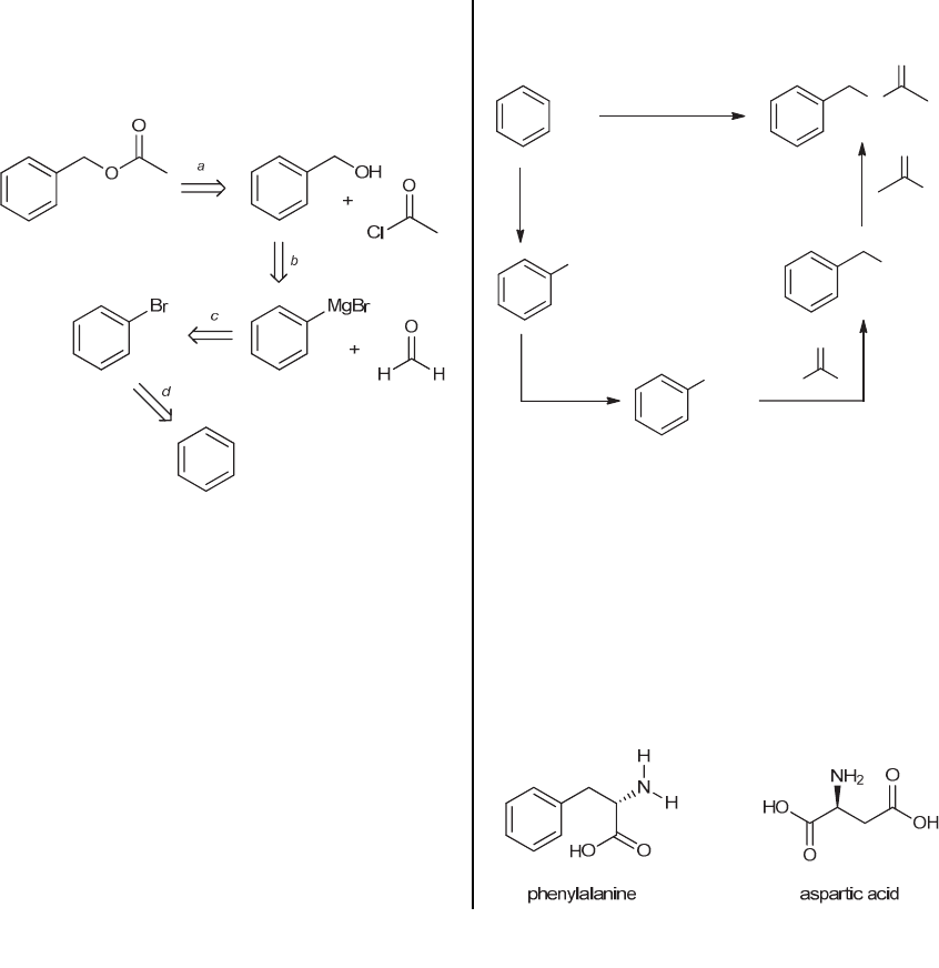 CHAPTER 20 809 20.59. There are certainly many acceptable solutions to this problem. One such solution derives from the following retrosynthetic analysis. An explanation of each of the steps (a-d) follows. a. The ester can be made via acetylation of the corresponding alcohol (benzyl alcohol). b. The alcohol can be made from the reaction between phenyl magnesium bromide and formaldehyde. c. Phenyl magnesium bromide can be made from bromobenzene, via insertion of magnesium. d. Bromobenzene can be made from benzene via bromination of the aromatic ring. Now let’s draw the forward scheme. Benzene is converted into bromobenzene upon treatment with Br2 and AlBr3 (via an electrophilic aromatic substitution reaction). Bromobenzene is then converted to phenyl magnesium bromide (a Grignard reagent), which is then treated with formaldehyde, followed by water work-up, to give benzyl alcohol. This alcohol then serves as a nucleophile in a subsequent acyl substitution reaction with acetyl chloride and pyridine to produce benzyl acetate (a process called acetylation). O O 2) Mg 3) CH2O 5) CH3COCl, pyridine 1) Br2, AlBr3 Br2, AlBr3 Br Mg MgBr H H O OH Cl O4) H2O 1) 2) H2O pyridine , 20.60. Hydrolysis of aspartame hydrolyzes both the amide group and the ester group in the molecule. Hydrolysis of the ester group produces methanol and the carboxylic acid group in phenylalanine, shown below. Hydrolysis of the amide group converts this group to an amine (shown below on phenylalanine) and a carboxylic acid (on the left side of aspartic acid below). Note that the stereochemistry at both chiral centers is retained because none of the bonds to the chiral centers are broken in this transformation. www.MyEbookNiche.eCrater.com