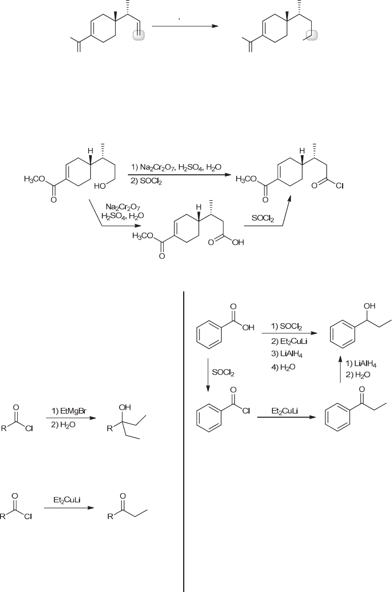792 CHAPTER 20 20.31. (a) In this transformation, an alkene is being converted into an alcohol. Since the OH group is installed at the less substituted carbon, we need an anti-Markovnikov addition. This can be accomplished using a hydroboration- oxidation reaction sequence. H H HO H3CO O H3CO O 1) BH3 THF 2) H2O2, NaOH It is reasonable to assume that the unhindered monosubstituted alkene will react more rapidly than the hindered trisubstituted alkene. In practice, the investigators enhanced the selectivity of the hydroboration process by using R2BH (where R = alkyl) in place of BH3. (b) In this transformation, a primary alcohol is being converted to an acid chloride. This can be accomplished via a two-step process. The primary alcohol is first oxidized to a carboxylic acid, so we must choose an appropriate oxidizing agent. This is followed by conversion of the carboxylic acid to the acid chloride, using SOCl2, as shown. 20.32. (a) The starting material has seven carbon atoms, and the product has nine carbon atoms. This requires installation of an ethyl group via a carbon-carbon bond-forming reaction. There are certainly several ways to achieve the installation of a single ethyl group. Let’s first consider one way that will NOT work. Specifically, we cannot install the ethyl group via the reaction between an acid chloride and a Grignard reagent, as that would install two ethyl groups: This reaction cannot be controlled to install a single ethyl group. However, a lithium dialkyl cuprate will attack an acid chloride just once, installing just one ethyl group: In order to use this method to install an ethyl group, we must first convert the starting material into an acid halide (which can be accomplished by treating the acid with thionyl chloride). Then, after installation of the ethyl group, we must convert the ketone into the final product (which can be achieved via reduction): Alternatively, a single ethyl group can be installed via the reaction between an aldehyde and a Grignard reagent. This strategy gives the following synthesis: The carboxylic acid is first converted to an acid halide, followed by subsequent treatment with LiAl(OR)3H to give an aldehyde. The aldehyde can then be treated with ethyl magnesium bromide, followed by aqueous work- up, to give the desired product. This alternative strategy demonstrates that there is rarely only one correct way to approach a synthesis problem. THIS IS TRUE FOR NEARLY ALL OF THE SYNTHESIS PROBLEMS THAT WE ENCOUNTER. www.MyEbookNiche.eCrater.com