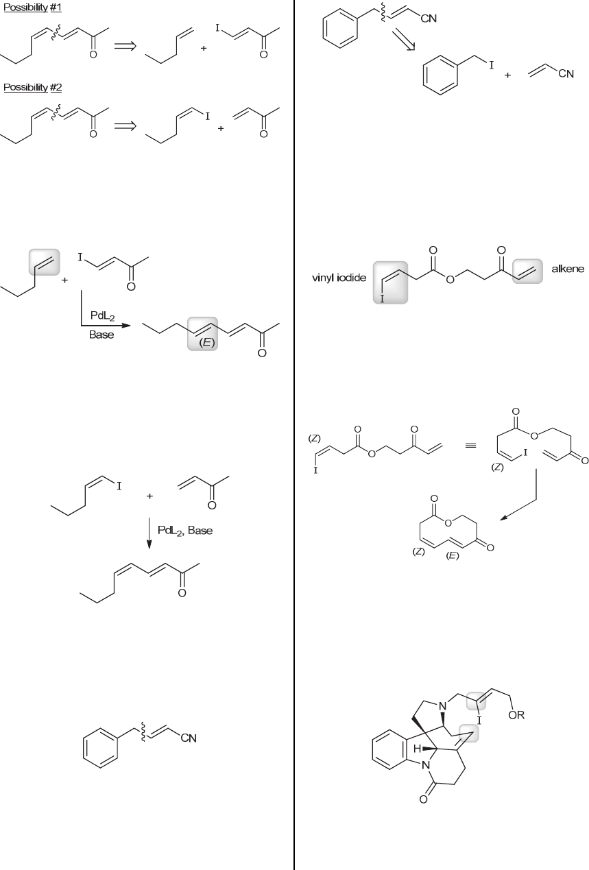 CHAPTER 23 985 The first possibility is not viable because Heck reactions are stereoselective with respect to the starting alkene, and the E isomer (rather than the Z isomer) would be expected: This is not the desired stereochemical outcome, so we turn our attention to the second possibility. This possibility works, and it has the added advantage that the starting alkene is monosubstituted, with an electron- withdrawing substituent (so we expect the reaction to be very effective). (f) Analyze the structure of the product and determine which bond(s) can be made via a Heck reaction. Recall that a Heck reaction forms a bond between a vinyl position and either an aryl, vinyl or benzyl position. In the desired compound, there is only one bond that fits this criterion: This bond, indicated with a wavy line, is between a benzyl group and a vinyl group. To make this bond via a Heck reaction, we must start with an organohalide and an alkene. Since one of the coupling partners must be an alkene, the other partner (in this case) must be a benzyl halide, as shown: Notice that the alkene is monosubstituted, with an electron-withdrawing substituent, so we expect the reaction to be very effective. 23.25. In a Heck reaction, an alkene is coupled with an organohalide. In this case, the two coupling partners are tethered together in the same compound: Upon treatment with a base and a suitable palladium catalyst, an intramolecular Heck reaction can occur. Notice that the Z configuration of the vinyl iodide is preserved. The new C-C bond is formed regioselectively and stereoselectively, with the E configuration being formed: 23.26. Begin by identifying the carbon atoms that will be joined. The carbon atom connected to the iodide will be joined directly to the proximal carbon of the alkene (a bond will be formed between the two highlighted positions): Next, consider the intermediate that forms when the palladium catalyst interacts with compound 1. www.MyEbookNiche.eCrater.com