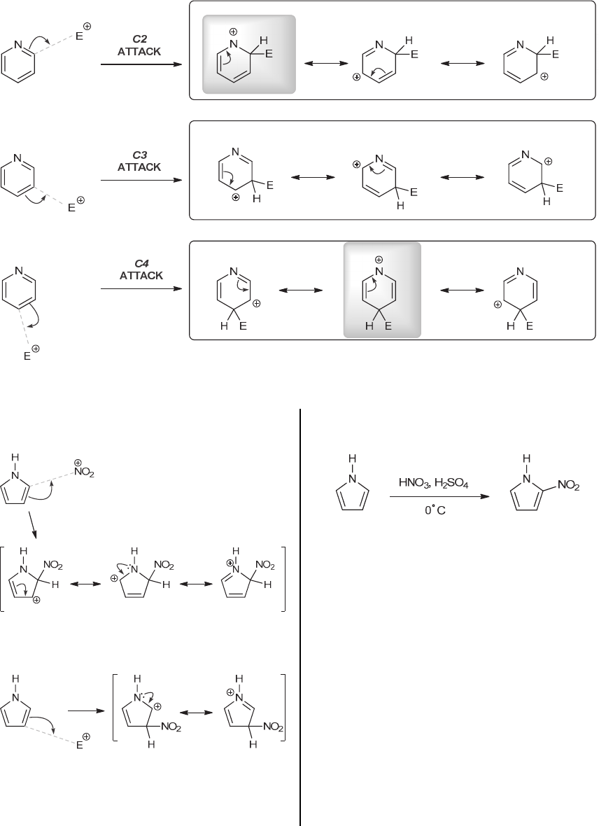 CHAPTER 22 931 22.29. Attack at either C2 or C4 generates an intermediate that exhibits a resonance structure with a nitrogen atom that bears a positive charge and lacks an octet (highlighted below). Attack at C3 generates a more stable intermediate (carbon is more electropositive than nitrogen so a carbon atom can better stabilize a positive charge associated with an unfilled octet): 22.30. Attack at the C2 position proceeds via an intermediate with three resonance structures: In contrast, attack at the C3 position proceeds via an intermediate with only two resonance structures: The intermediate for C2 attack is lower in energy than the intermediate for C3 attack. The transition state leading to the intermediate of C2 attack will therefore be lower in energy than the transition state leading to the intermediate of C3 attack. As a result, C2 attack occurs more rapidly, giving the following product: 22.31. (a) The second compound will have an N-H stretching signal between 3300 and 3500 cm-1. The first compound will not have such a signal. (b) When treated with HCl, the first compound will be protonated to form an ammonium salt that will produce an IR signal between 2200 and 3000 cm-1. The second compound is not an amine and will not exhibit the same behavior. 22.32. (a) The 1H NMR spectrum of the first compound will have a singlet resulting from the N-methyl group. The 1H NMR spectrum of the second compound is not expected to exhibit any singlets. (b) The 1H NMR spectrum of the first compound will have six signals, while the 1H NMR spectrum of the second compound will have only three signals. 22.33. The designation “primary” indicates that two hydrogen atoms are attached to the nitrogen atom, while www.MyEbookNiche.eCrater.com