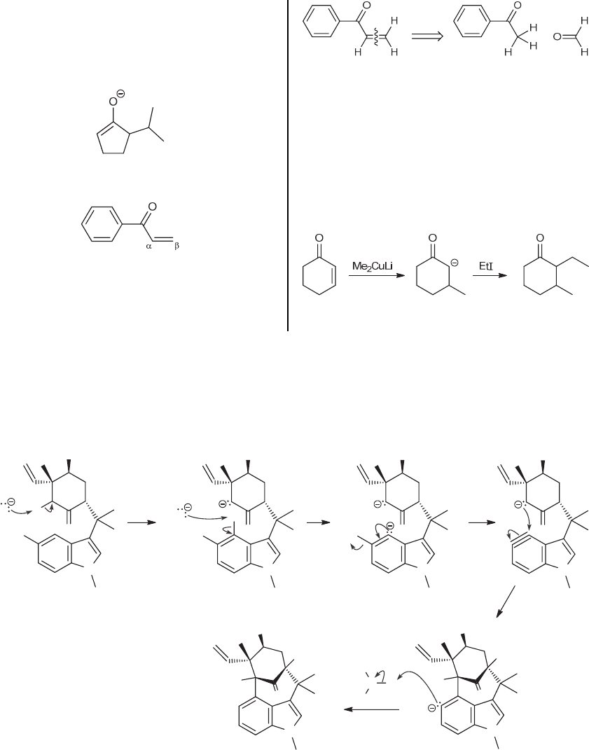 904 CHAPTER 21 21.113. Options (c) and (d) are enols, not enolates, so they can be ruled out. The base (diisopropylamide) is sterically hindered, so we expect formation of the less substituted (kinetic) enolate, which corresponds with option (b). 21.114. The product is an ,-unsaturated ketone: Therefore, it can be prepared via an aldol condensation, using the following starting materials: These compounds correspond with option (c). 21.115. This process involves the installation of two alkyl groups bear a carbonyl group: an ethyl group at the alpha position and a methyl group at the beta position. This can be achieved by first installing the methyl group at the beta position, by treating the starting compound with Me2CuLi, to give an enolate, followed by alkylation with ethyl iodide to give the desired product: Therefore, the answer is (d). 21.116. (a) Under strongly basic conditions, an enolate is formed. Then, under these conditions, an elimination-addition reaction can occur (Section 18.14), in which the nucleophilic enolate attacks the tethered benzyne in a ring-forming reaction, followed by protonation. N O OR Br H Y H2N N O OR Br HH2N N O OR N O H H RO N H H H N O H H RO N O OR Br www.MyEbookNiche.eCrater.com