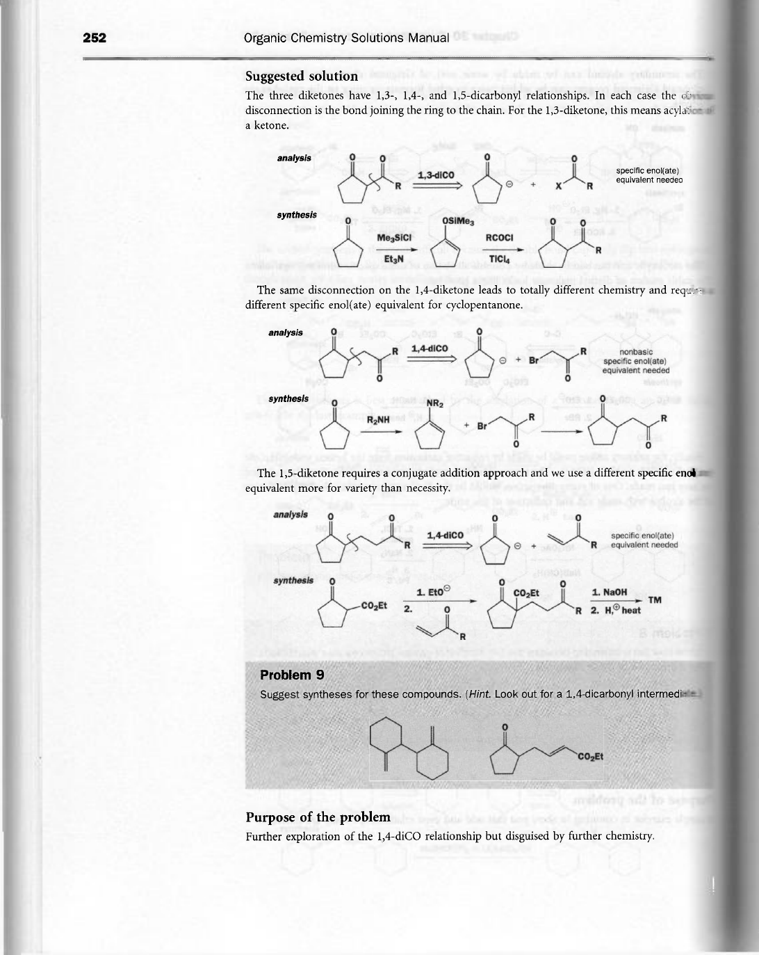 252 Organic Chemistry Solutions Manual Suggested solution The three diketones have 1,3-, 1,4-, and 1,5-dicarbonyl relationships. In each case the disconnection is the bond joining the ring to the chain. For the 1,3-diketone, this means acylation a ketone. analysis 0 0 0 0 1,3-dico specific enol(ate) equivalent needeo R + R synthesis 0 0 Me₃SiCI RCOCI R Et3N The same disconnection on the 1,4-diketone leads to totally different chemistry and require different specific enol(ate) equivalent for cyclopentanone. analysis 0 0 R R nonbasic + Br specific enol(ate) equivalent needed 0 0 synthesis 0 NR₂ R₂NH R R + Br 0 0 The 1,5-diketone requires a conjugate addition approach and we use a different specific equivalent more for variety than necessity. analysis 0 0 0 specific enol(ate) R + R equivalent needed synthesis 0 0 0 1. CO₂Et 1. NaOH TM CO₂Et 2. 0 R 2. heat R Problem 9 Suggest syntheses for these compounds. (Hint. Look out for a 1,4-dicarbonyl 0 CO₂Et Purpose of the problem Further exploration of the 1,4-diCO relationship but disguised by further chemistry.