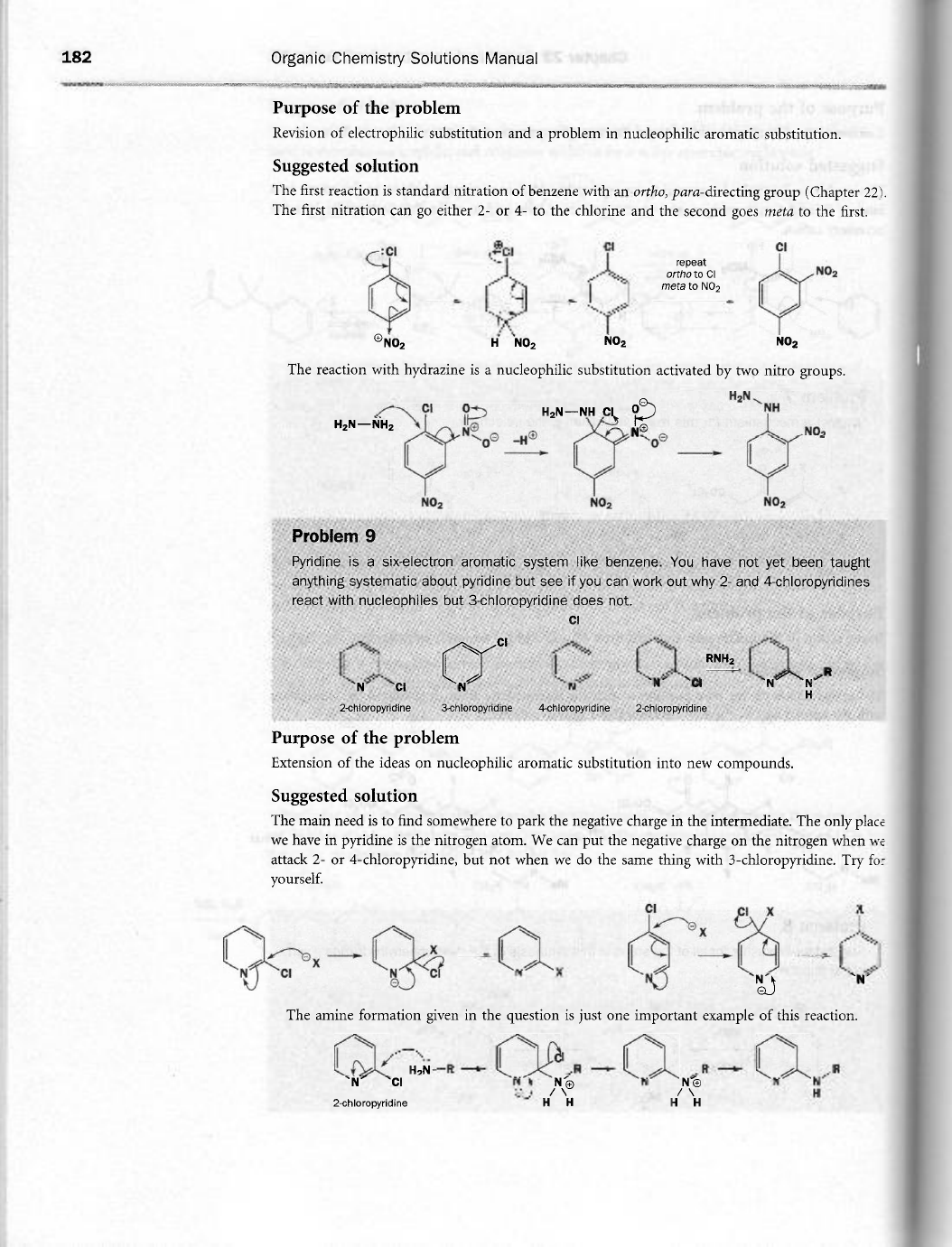 182 Organic Chemistry Solutions Manual Purpose of the problem Revision of electrophilic substitution and a problem in nucleophilic aromatic substitution. Suggested solution The first reaction is standard nitration of benzene with an ortho, para-directing group (Chapter 22). The first nitration can go either 2- or 4- to the chlorine and the second goes meta to the first. CI CI CI repeat ortho to CI NO₂ meta to NO₂ NO₂ H NO₂ NO₂ NO₂ The reaction with hydrazine is a nucleophilic substitution activated by two nitro groups. 1 CI NH CI 0 NH N + H NO₂ 0 NO₂ NO₂ NO₂ Problem 9 Pyridine is a six-electron aromatic system like benzene. You have not yet been taught anything systematic about pyridine but see if you can work out why 2- and 4-chloropyridines react with nucleophiles but 3-chloropyridine does not. CI CI RNH₂ R N CI N N N CI N N H 2-chloropyridine 3-chloropyridine 4-chloropyridine 2-chloropyridine Purpose of the problem Extension of the ideas on nucleophilic aromatic substitution into new compounds. Suggested solution The main need is to find somewhere to park the negative charge in the intermediate. The only place we have in pyridine is the nitrogen atom. We can put the negative charge on the nitrogen when attack 2- or 4-chloropyridine, but not when we do the same thing with 3-chloropyridine. Try for yourself. CI X X X N CI N N N N N The amine formation given in the question is just one important example of this reaction. CI R R N CI N No N H 2-chloropyridine H H H H