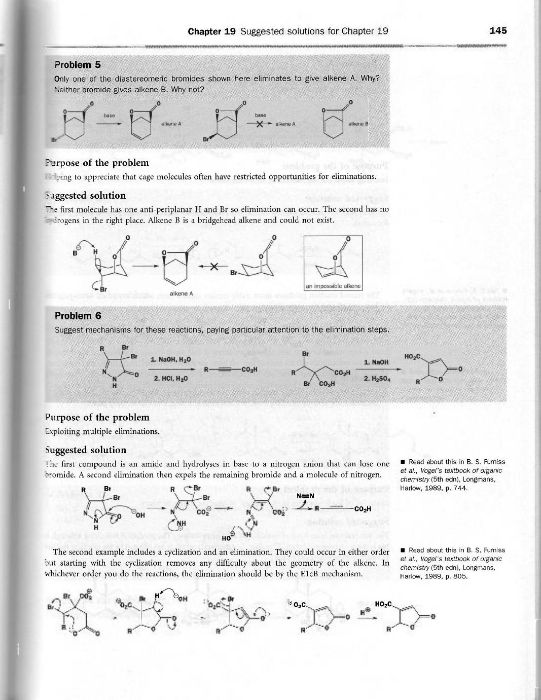 Chapter 19 Suggested solutions for Chapter 19 145 Problem 5 Only one of the diastereomeric bromides shown here eliminates to give alkene A. Why? Neither bromide gives alkene B. Why not? 0 0 0 0 0 0 0 0 base base alkene A alkene A alkene B Br Purpose of the problem Helping to appreciate that cage molecules often have restricted opportunities for eliminations. Suggested solution The first molecule has one anti-periplanar H and Br so elimination can occur. The second has no drogens in the right place. Alkene B is a bridgehead alkene and could not exist. 0 0 0 B H 0 0 0 0 Br Br an impossible alkene alkene A Problem 6 Suggest mechanisms for these reactions, paying particular attention to the elimination steps. R Br Br Br 1. NaOH, H2O 1. NaOH N R 0 0 R N 2. HCI, 2. Br R 0 H Purpose of the problem Exploiting multiple eliminations. Suggested solution The first compound is an amide and hydrolyses in base to a nitrogen anion that can lose one Read about this in B. S. Furniss A second elimination then expels the remaining bromide and a molecule of nitrogen. et al., Vogel's textbook of organic chemistry (5th edn), Longmans, R Br R Br R Br Harlow, 1989, p. 744. Br Br R N N CO OH 2 N N NH N H Ho The second example includes a cyclization and an elimination. They could occur in either order Read about this in B. S. Furniss but starting with the cyclization removes any difficulty about the geometry of the alkene. In et al., Vogel's textbook of organic chemistry (5th edn), Longmans, whichever order you do the reactions, the elimination should be by the mechanism. Harlow, 1989, p. 805. e Br H OH Br 0,0 HO₂C 0 R R R R