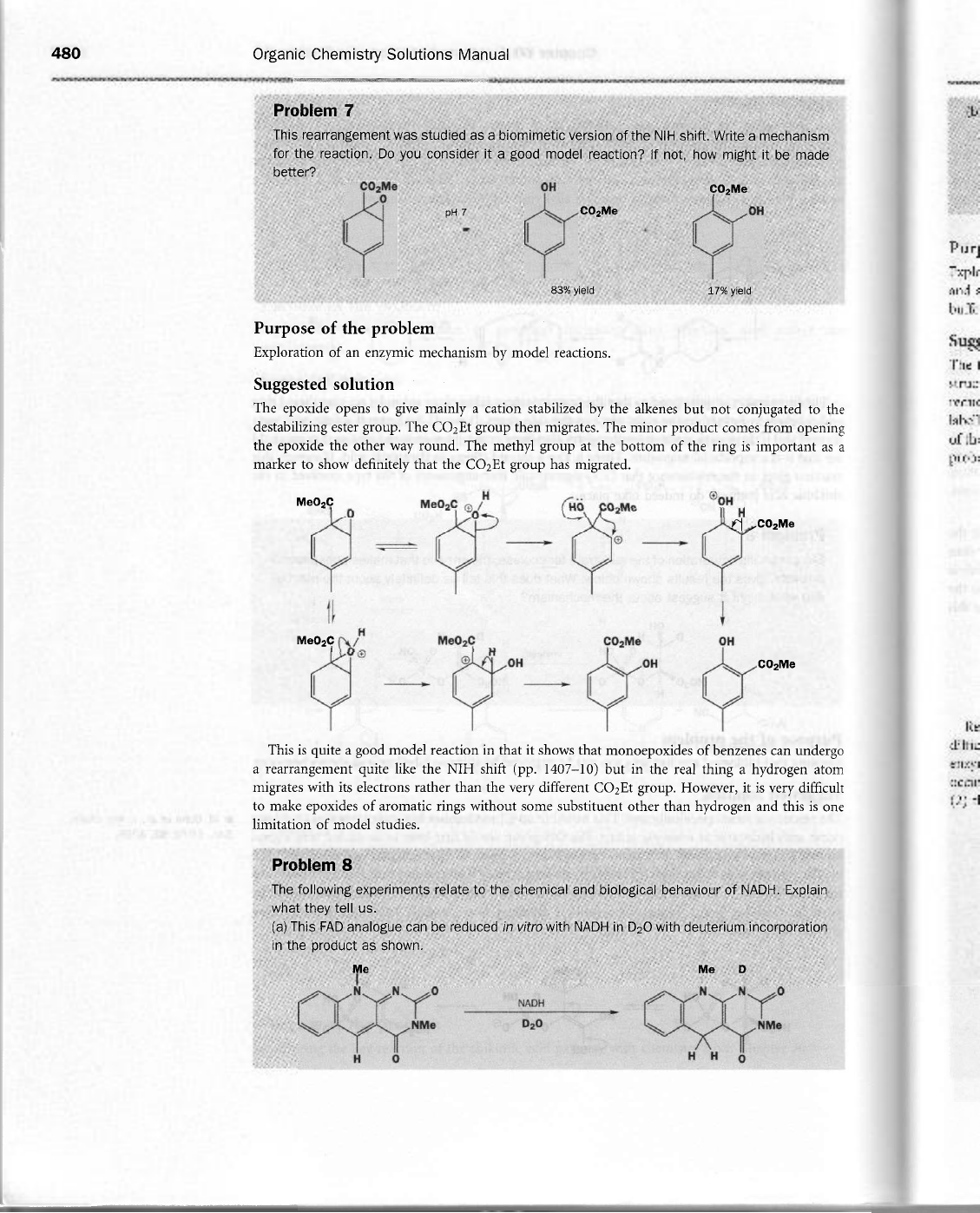 480 Organic Chemistry Solutions Manual Problem 7 This rearrangement was studied as a biomimetic version of the NIH shift. Write a mechanism for the reaction. Do you consider it a good model reaction? If not, how might it be made better? CO₂Me OH CO₂Me 0 pH 7 CO₂Me Purj 83% yield 17% yield and Purpose of the problem Exploration of an enzymic mechanism by model reactions. The Suggested solution The epoxide opens to give mainly a cation stabilized by the alkenes but not conjugated to the labell destabilizing ester group. The group then migrates. The minor product comes from opening the epoxide the other way round. The methyl group at the bottom of the ring is important as a of lb: marker to show definitely that the CO₂Et group has migrated. H MeO₂C OH 0 CO₂Me 0 H CO₂Me + H MeO₂C CO₂Me H oH CO₂Me Re This is quite a good model reaction in that it shows that monoepoxides of benzenes can undergo a rearrangement quite like the NIH shift (pp. 1407-10) but in the real thing a hydrogen atom migrates with its electrons rather than the very different CO₂Et group. However, it is very difficult to make epoxides of aromatic rings without some substituent other than hydrogen and this is one (2) limitation of model studies. Problem 8 The following experiments relate to the chemical and biological behaviour of NADH. Explain what they tell us. (a) This FAD analogue can be reduced in vitro with NADH in D₂O with deuterium incorporation in the product as shown. Me Me D N N 0 N N NADH NMe D₂O NMe H 0 H H