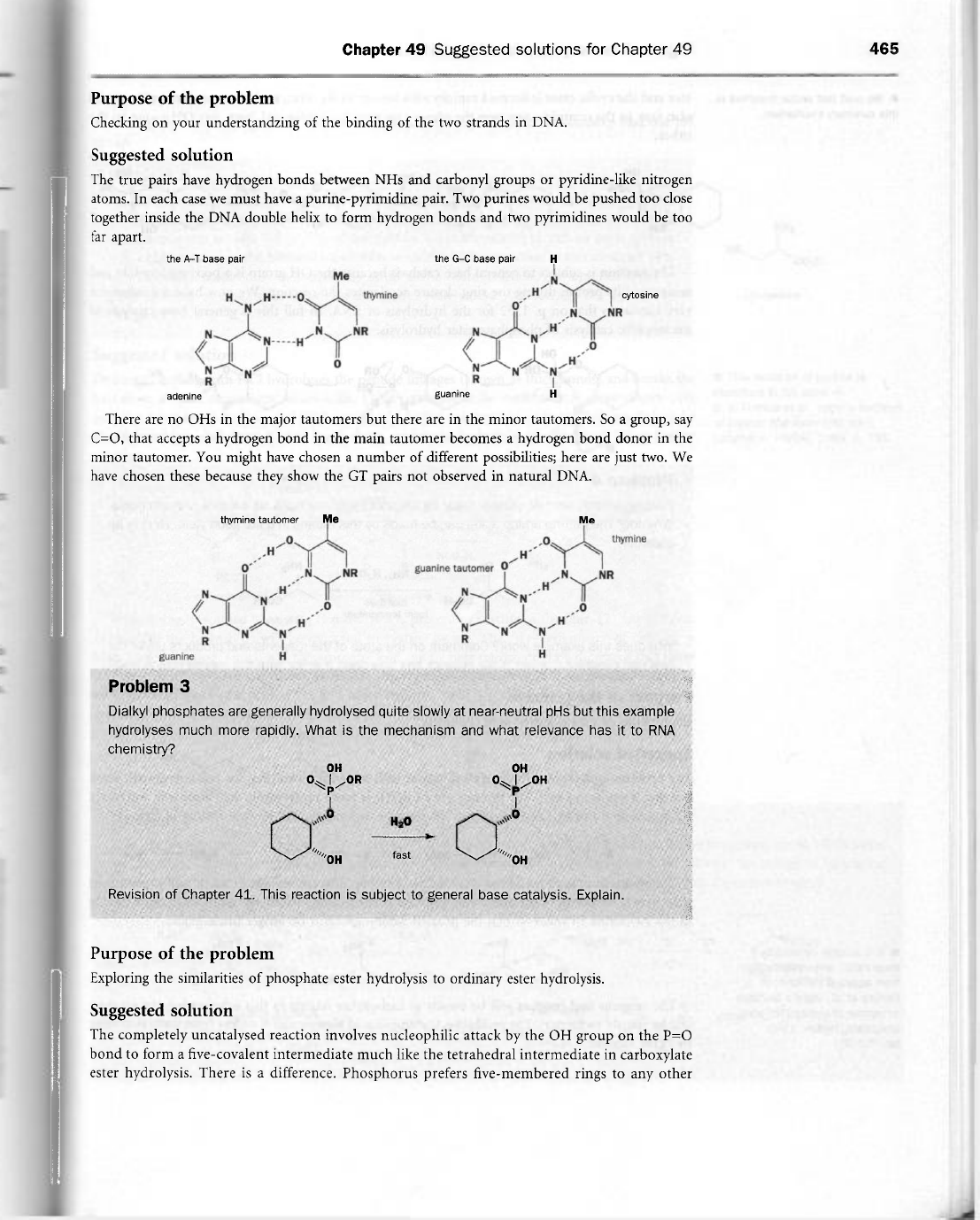 Chapter 49 Suggested solutions for Chapter 49 465 Purpose of the problem Checking on your understandzing of the binding of the two strands in DNA. Suggested solution The true pairs have hydrogen bonds between NHs and carbonyl groups or pyridine-like nitrogen atoms. In each case we must have a purine-pyrimidine pair. Two purines would be pushed too close together inside the DNA double helix to form hydrogen bonds and two pyrimidines would be too far apart. the A-T base pair the G-C base pair H Me N H thymine H H cytosine N N NR N N NR N H N H N 0 0 H N N N N N R R adenine guanine H There are no OHs in the major tautomers but there are in the minor tautomers. So a group, say C=O, that accepts a hydrogen bond in the main tautomer becomes a hydrogen bond donor in the minor tautomer. You might have chosen a number of different possibilities; here are just two. We have chosen these because they show the GT pairs not observed in natural DNA. thymine tautomer Me Me 0 thymine H H 0 NR guanine tautomer N N NR N H H N N N 0 0 H H N N N N N N R R guanine H H Problem 3 Dialkyl phosphates are generally hydrolysed quite slowly at near-neutral pHs but this example hydrolyses much more rapidly. What is the mechanism and what relevance has it to RNA chemistry? 0 OR P P OH fast OH Revision of Chapter 41. This reaction is subject to general base catalysis. Explain. Purpose of the problem Exploring the similarities of phosphate ester hydrolysis to ordinary ester hydrolysis. Suggested solution The completely uncatalysed reaction involves nucleophilic attack by the OH group on the bond to form a five-covalent intermediate much like the tetrahedral intermediate in carboxylate ester hydrolysis. There is a difference. Phosphorus prefers five-membered rings to any other