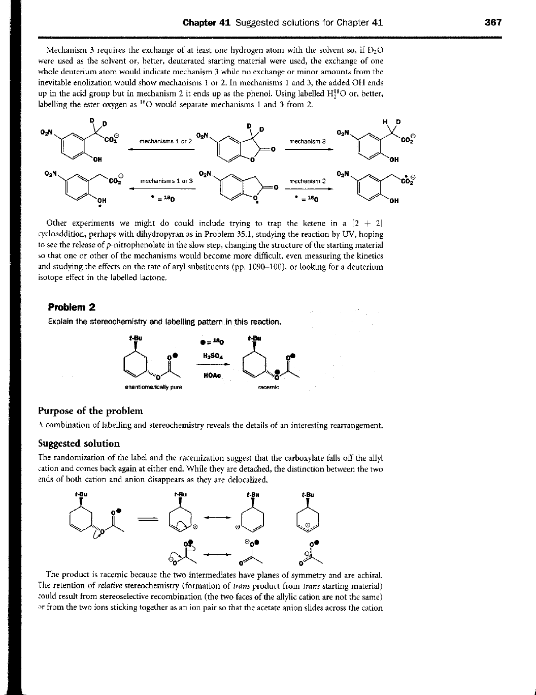Chapter 41 Suggested solutions for Chapter 41 367 Mechanism 3 requires the exchange of at least one hydrogen atom with the solvent so, if D₂O were used as the solvent or, better, deuterated starting material were used, the exchange of one whole deuterium atom would indicate mechanism 3 while no exchange or minor amounts from the inevitable enolization would show mechanisms 1 or 2. In mechanisms 1 and 3, the added OH ends up in the acid group but in mechanism 2 it ends up as the phenol. Using labelled or, better, labelling the ester oxygen as would separate mechanisms 1 and 3 from 2. D D H D D D mechanisms 1 or 2 mechanism 3 0 OH 0 OH CO₂ mechanisms 1 or 3 mechanism 2 0 OH = 0 = 180 OH Other experiments we might do could include trying to trap the ketene in a [2 + cycloaddition, perhaps with dihydropyran as in Problem 35.1, studying the reaction by UV, hoping to see the release of p-nitrophenolate in the slow step, changing the structure of the starting material so that one or other of the mechanisms would become more difficult, even measuring the kinetics and studying the effects on the rate of aryl substituents (pp. 1090-100), or looking for a deuterium isotope effect in the labelled lactone. Problem 2 Explain the stereochemistry and labelling pattern in this reaction. t-Bu = 180 t-Bu 0 HOAc 0 enantiomerically pure racemic Purpose of the problem A combination of labelling and stereochemistry reveals the details of an interesting rearrangement. Suggested solution The randomization of the label and the racemization suggest that the carboxylate falls off the allyl cation and comes back again at either end. While they are detached, the distinction between the two ends of both cation and anion disappears as they are delocalized. t-Bu t-Bu t-Bu t-Bu 0 + 0 0 0 0 0 The product is racemic because the two intermediates have planes of symmetry and are achiral. The retention of relative stereochemistry (formation of trans product from trans starting material) could result from stereoselective recombination (the two faces of the allylic cation are not the same) or from the two ions sticking together as an ion pair so that the acetate anion slides across the cation