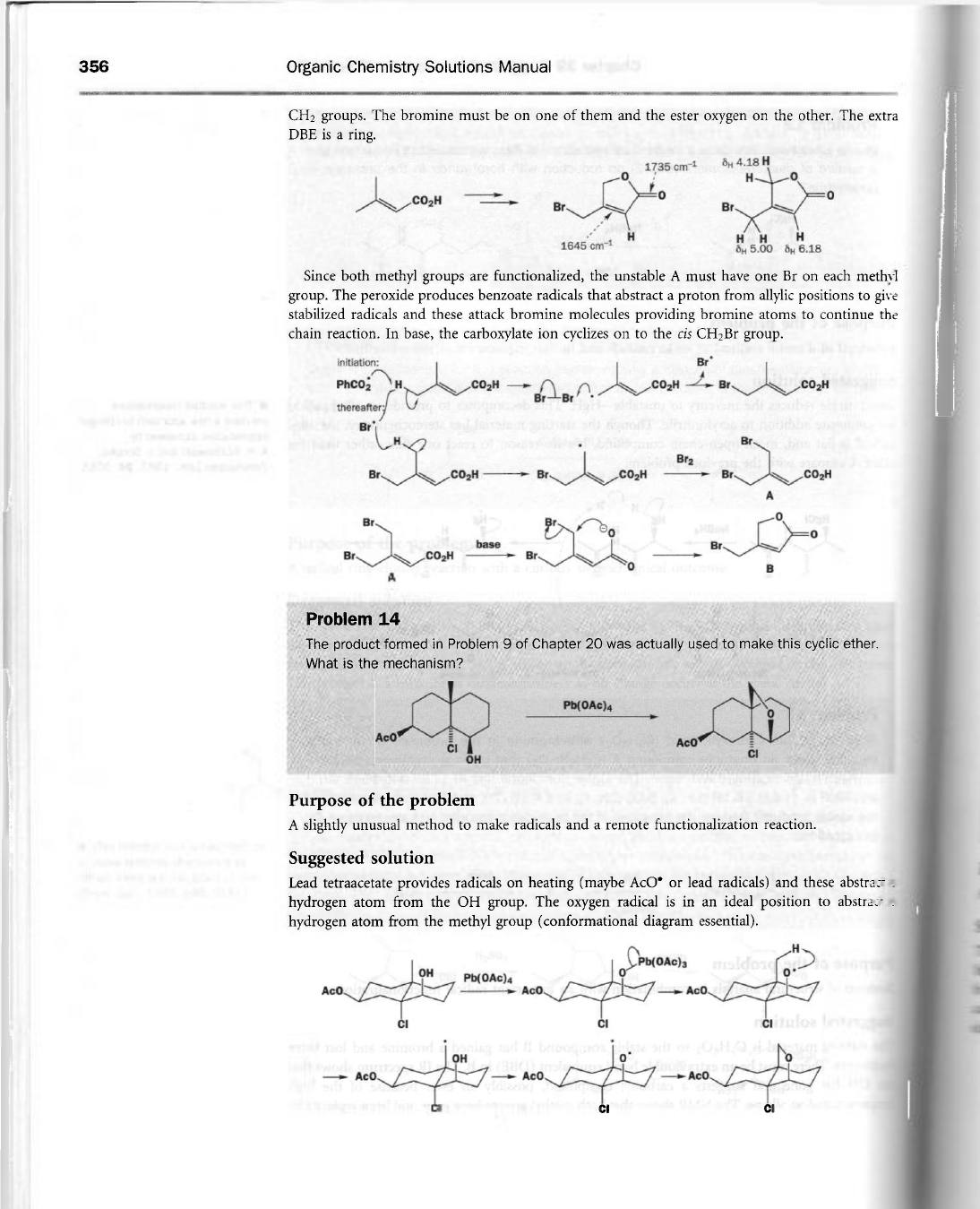 356 Organic Chemistry Solutions Manual CH₂ groups. The bromine must be on one of them and the ester oxygen on the other. The extra DBE is a ring. 1735 cm⁻¹ 4.18 H 0 H 0 CO₂H 0 0 Br Br H H H H 1645 cm 5.00 6.18 Since both methyl groups are functionalized, the unstable A must have one Br on each methyl group. The peroxide produces benzoate radicals that abstract a proton from allylic positions to give stabilized radicals and these attack bromine molecules providing bromine atoms to continue the chain reaction. In base, the carboxylate ion cyclizes on to the cis CH₂Br group. initiation: PhCO₂ H CO₂H CO₂H Br CO₂H Br Br thereafter: Br H Br Br₂ Br CO₂H Br CO₂H Br CO₂H A 0 Br Br 0 base Br Br CO₂H Br 0 B A Problem 14 The product formed in Problem 9 of Chapter 20 was actually used to make this cyclic ether. What is the mechanism? 0 AcO AcO CI CI OH Purpose of the problem A slightly unusual method to make radicals and a remote functionalization reaction. Suggested solution Lead tetraacetate provides radicals on heating (maybe or lead radicals) and these abstract hydrogen atom from the OH group. The oxygen radical is in an ideal position to abstract hydrogen atom from the methyl group (conformational diagram essential). H 0 0 AcO AcO AcO CI CI CI 0 AcO AcO AcO CI CI CI
