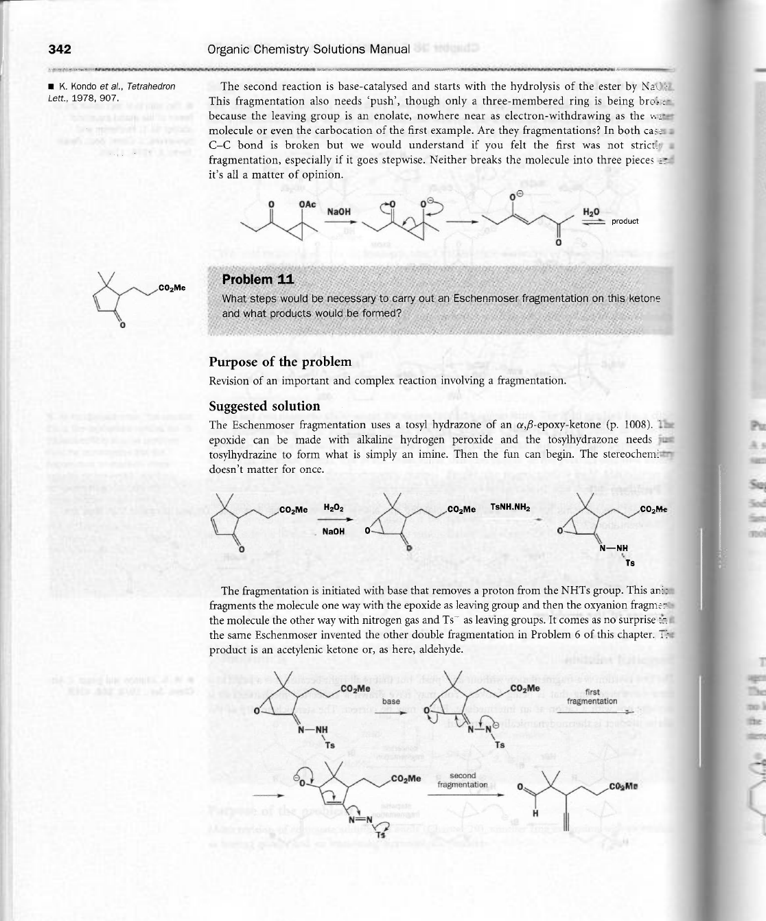 342 Organic Chemistry Solutions Manual K. Kondo et al., Tetrahedron The second reaction is base-catalysed and starts with the hydrolysis of the ester by Lett., 1978, 907. This fragmentation also needs 'push', though only a three-membered ring is being brok because the leaving group is an enolate, nowhere near as electron-withdrawing as the molecule or even the carbocation of the first example. Are they fragmentations? In both C-C bond is broken but we would understand if you felt the first was not strictly fragmentation, especially if it goes stepwise. Neither breaks the molecule into three pieces it's all a matter of opinion. 0 0 0 NaOH product 0 Problem 11 CO₂Me What steps would be necessary to carry out an Eschenmoser fragmentation on this ketone and what products would be formed? 0 Purpose of the problem Revision of an important and complex reaction involving a fragmentation. Suggested solution The Eschenmoser fragmentation uses a tosyl hydrazone of an α,β-epoxy-ketone (p. 1008). The epoxide can be made with alkaline hydrogen peroxide and the tosylhydrazone needs just tosylhydrazine to form what is simply an imine. Then the fun can begin. The doesn't matter for once. CO₂Me CO₂Me TsNH.NH₂ NaOH 0 0 D N-NH Ts The fragmentation is initiated with base that removes a proton from the NHTs group. This fragments the molecule one way with the epoxide as leaving group and then the oxyanion the molecule the other way with nitrogen gas and Ts⁻ as leaving groups. It comes as no surprise the same Eschenmoser invented the other double fragmentation in Problem 6 of this chapter. The product is an acetylenic ketone or, as here, aldehyde. CO₂Me first base fragmentation 0 0 N-NH N-N Ts Ts CO₂Me second 0 fragmentation 0 H N=N Ts