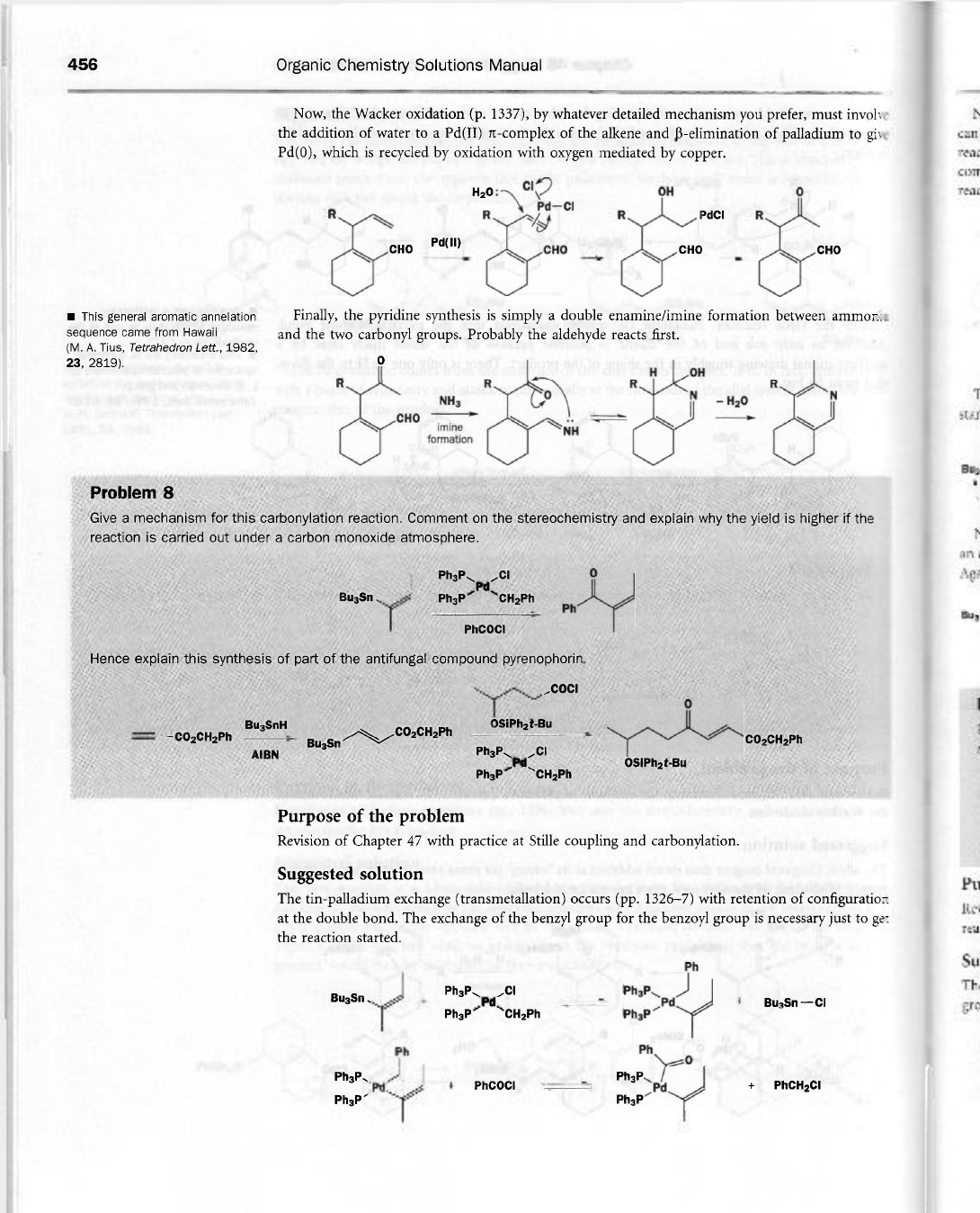 456 Organic Chemistry Solutions Manual Now, the Wacker oxidation (p. 1337), by whatever detailed mechanism you prefer, must involv N the addition of water to a Pd(II) π-complex of the alkene and of palladium to give can Pd(0), which is recycled by oxidation with oxygen mediated by copper. CI read R R R R CHO Pd(II) CHO CHO CHO This general aromatic annelation Finally, the pyridine synthesis is simply a double enamine/imine formation between sequence came from Hawaii and the two carbonyl groups. Probably the aldehyde reacts first. (M. A. Tius, Tetrahedron Lett., 1982, 23, 2819). 0 H OH R R R R 0 N N T - CHO imine NH formation Problem 8 Give a mechanism for this carbonylation reaction. Comment on the stereochemistry and explain why the yield is higher if the reaction is carried out under a carbon monoxide atmosphere. N an Ph₃P CI 0 Pd Bu₃Sn Ph₃P CH₂Ph Ph PhCOCI Hence explain this synthesis of part of the antifungal compound COCI 0 I OSiPh₂t-Bu CO₂CH₂Ph CO₂CH₂Ph Bu₃Sn CO₂CH₂Ph AIBN Ph₃P CI Pd OSIPh₂t-Bu Ph₃P CH₂Ph Purpose of the problem Revision of Chapter 47 with practice at Stille coupling and carbonylation. Suggested solution Pu The tin-palladium exchange (transmetallation) occurs (pp. 1326-7) with retention of configuration at the double bond. The exchange of the benzyl group for the benzoyl group is necessary just to get the reaction started. Ph Ph₃P CI Ph₃P The Pd Pd CI Ph₃P CH₂Ph Ph₃P gro Ph Ph 0 Pd PhCOCI Pd + Ph₃P Ph₃P
