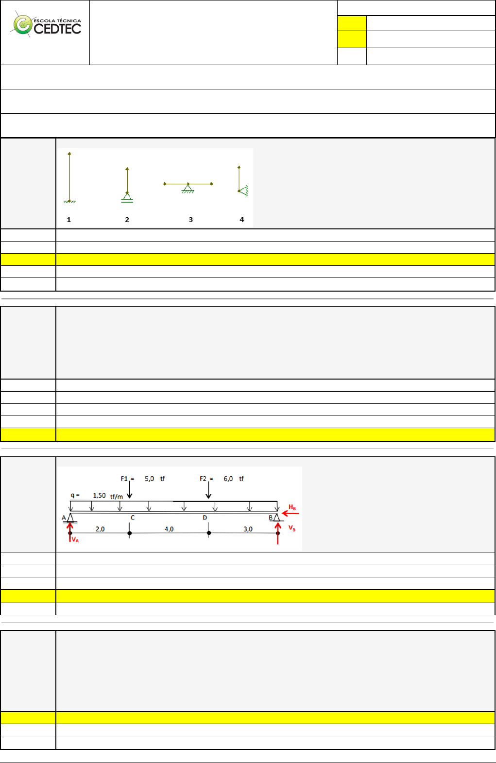 Pincel Atômico - 30/10/2025 18:22:23 1/2 KAIO CRISTHIAN DE OLIVEIRA AMORIM Exercício Caminho do Conhecimento - Etapa 2 (17711) Atividade finalizada em 28/10/2025 20:00:26 (5364858 / 2) LEGENDA Resposta correta na questão # Resposta correta - Questão Anulada X Resposta selecionada pelo Aluno Disciplina: ESTRUTURAS - LAJES [1960993] - Avaliação com 4 questões, com o peso total de 13,00 pontos [capítulos - 101] Turma: Curso Técnico: Edificações - Grupo: EAD - 09/25 - EAD EDI [187383] Aluno(a): 91853754 - KAIO CRISTHIAN DE OLIVEIRA AMORIM - Respondeu 2 questões corretas, obtendo um total de 6,50 pontos como nota [350292_73853] Questão 001 Indique o tipo de apoio das figuras abaixo na ordem que elas aparecem: 2° Gênero, 1° Gênero, 1° Gênero e 3° Gênero 3° Gênero, 2° Gênero, 1° Gênero e 1° Gênero 3° Gênero, 1° Gênero, 2° Gênero e 2° Gênero 3° Gênero, 2° Gênero, 1° Gênero e 2° Gênero X 1° Gênero, 2° Gênero, 3° Gênero e 3° Gênero [350290_73859] Questão 002 Avalie as afirmações abaixo: I - As estruturas hipoestáticas são aquelas que não possuem as condições mínimas de manutenção do equilíbrio estático diante da solicitação de qualquer carregamento. Este tipo de estrutura PODE ser projetada, por serem admissíveis para as construções devido à sua ESTABILIDADE. II - Estruturas Hiperestáticas possuem reserva de segurança, apresentando portando condições além das necessárias para manter o equilíbrio estático. Caso haja, o rompimento de um de seus vínculos, a estrutura manterá a sua estaticidade. III – Nas estruturas hipoestáticas, o número de reações de apoio é maior que número de equações de equilíbrio. Com base nos seus conhecimentos, a(s) afirmação(ções) verdadeira(s) é(são): Todas são verdadeiras I e III II e III Nenhuma é verdadeira X Somente a II [350290_73848] Questão 003 As reações de apoio na estrutura abaixo, Hb, Va e Vb valem, respectivamente: 12,6 tf; 11,6 tf; 0 tf 11,9 tf; 0 tf; 12,6 tf 20,6 tf; 11,6 tf; 15,9 tf X 0 tf; 12,6 tf; 11,9 tf 12,1 tf; 20,1 tf; 15,5 tf [350291_73849] Questão 004 Marque a alternativa CORRETA: ( ) O vínculo de primeiro grau impede apenas dois movimentos; o movimento no sentido horizontal e vertical (cortante e normal), podendo formar duas reações. ( ) A estrutura estática possui reserva de segurança, apresentando portando condições além das necessárias para manter o equilíbrio estático. Caso haja, o rompimento de um de seus vínculos, a estrutura manterá a sua estaticidade. ( ) Nas estruturas hipoestáticas, o número de reações de apoio > número de equações de equilíbrio ( ) As estruturas hiperestáticas são aquelas que não possuem as condições mínimas de manutenção do equilíbrio estático diante da solicitação de qualquer carregamento. Este tipo de estrutura NÃO pode ser projetada, por serem inadmissíveis para as construções devido à sua INSTABILIDADE. F – F – F – F V – V – F – F X F – V – F – V Pincel Atômico - 30/10/2025 18:22:23 2/2 V – V – F – V V – F – V – V
