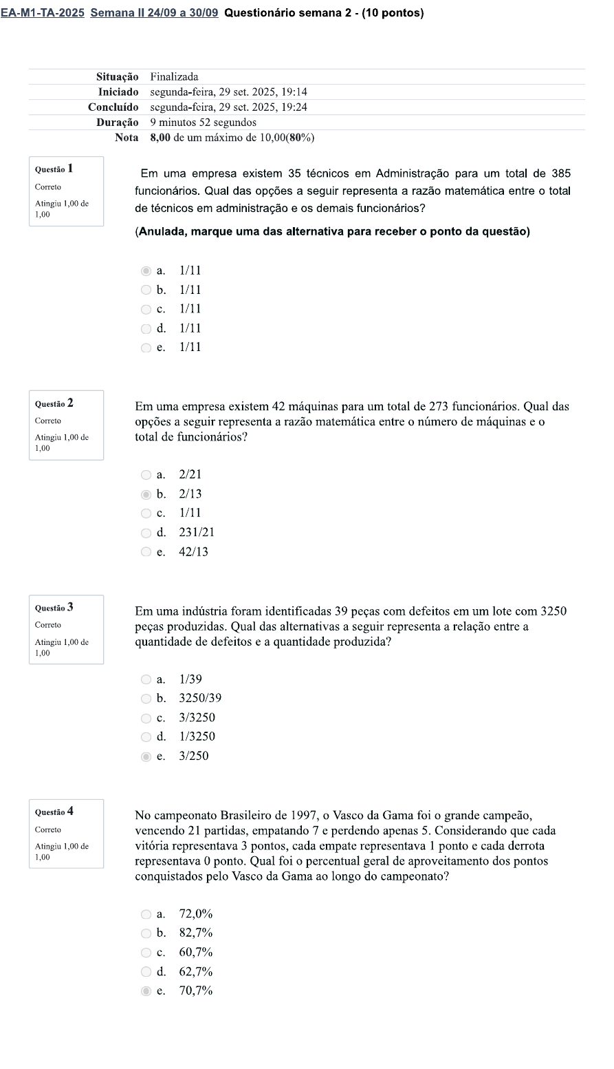 EA-M1-TA-2025 Semana II 24/09 a 30/09 Questionário semana 2 (10 pontos) Situação Finalizada Iniciado segunda-feira, 29 set. 2025, 19:14 Concluído segunda-feira, 29 set. 2025, 19:24 Duração 9 minutos 52 segundos Nota 8,00 de um máximo de 10,00(80%) Questão 1 Em uma empresa existem 35 técnicos em Administração para um total de 385 Correto funcionários. Qual das opções a seguir representa a razão matemática entre o total Atingiu 1,00 de de técnicos em administração e os demais funcionários? 1,00 (Anulada, marque uma das alternativa para receber ponto da questão) a. 1/11 b. 1/11 1/11 d. 1/11 e. 1/11 Questão 2 Em uma empresa existem 42 máquinas para um total de 273 funcionários. Qual das Correto opções a seguir representa a razão matemática entre o número de máquinas e o Atingiu 1,00 de total de funcionários? 1,00 a. 2/21 b. 2/13 1/11 d. 231/21 e. 42/13 Questão 3 Em uma indústria foram identificadas 39 peças com defeitos em um lote com 3250 Correto peças produzidas. Qual das alternativas a seguir representa a relação entre a Atingiu 1,00 de quantidade de defeitos e a quantidade produzida? 1,00 a. 1/39 b. 3250/39 3/3250 d. 1/3250 e. 3/250 Questão 4 No campeonato Brasileiro de 1997, o Vasco da Gama foi o grande campeão, Correto vencendo 21 partidas, empatando 7 e perdendo apenas 5. Considerando que cada Atingiu 1,00 de vitória representava 3 pontos, cada empate representava 1 ponto e cada derrota 1,00 representava 0 ponto. Qual foi o percentual geral de aproveitamento dos pontos conquistados pelo Vasco da Gama ao longo do campeonato? a. 72,0% b. 82,7% c. 60,7% d. 62,7% e. 70,7%Questão 5 Qual das opções a seguir representa 3% na forma fracionária? Correto Atingiu 1,00 de 1,00 a. 0,03 b. 3/1000 3/100 d. 0,3% e. 3/10 Questão 6 Qual das opções a seguir representa 5% na forma centesimal? Incorreto Atingiu 0,00 de 1,00 a. 0,5 b. 0,5% 0,05% d. 0,05 e. 5/100 Questão 7 Um fornecedor está oferecendo a mesma matéria-prima em duas condições de Correto pagamento distintas. A vista cada caixa com 100 peças sai a R$ 80,00. A mesma Atingiu 1,00 de matéria-prima a prazo tem um acréscimo de 5% sobre o valor à vista. 1,00 Considerando que a empresa esteja disposta a gastar R$ 1680,00, quantas caixas ela conseguiria comprar a vista e a prazo? a. 20 caixas a vista e 19 caixas a prazo. b. 19 caixas a vista e 20 caixas a prazo. 18 caixas a prazo e 20 caixas à vista. d. 21 caixas a vista e 19 caixas a prazo. e. 21 caixas a vista e 20 caixas a prazo. Questão 8 Um motociclista planeja realizar uma viagem cujo destino fica a 500 km de sua Incorreto casa. Sua moto consome 4 litros de gasolina para cada 100 km rodados e o tanque Atingiu 0,00 de da moto tem capacidade para 22 litros. Pelo mapa, observou que no trajeto da 1,00 viagem o último posto disponível para reabastecimento, chamado Estrela, fica a 75 km do seu destino. Ele pretende partir com o tanque da moto cheio e planeja fazer somente duas paradas para reabastecimento, uma na ida e outra na volta, ambas no posto Estrela. No reabastecimento para a viagem de ida, deve considerar também combustível suficiente para se deslocar por 200 km em seu destino. A quantidade mínima de combustível, em litros, que esse motociclista deve reabastecer no posto Estrela na viagem de ida, que seja suficiente para fazer o segundo reabastecimento, é de: a. 15 litros. b. 12 litros. 18 litros. d. 21 litros. e. 9 litros. Questão 9 Uma empresa de confecção utiliza 13 metros de tecido para produzir 5 camisetas. Correto Quantas camisetas podem ser produzidas com 2210 metros de tecido? Atingiu 1,00 de 1,00 a. 800 camisetas b. 650 camisetas 750 camisetas d. 700 camisetas e. 850 camisetasQuestão 10 Uma empresa possui 3 sócios: Ronã, Diego e Thiago. Ronã possui 50% das ações Correto da empresa, Diego possui 30% das ações e Thiago possui 20% das ações. Em Atingiu 1,00 de determinado mês, o lucro dessa empresa foi de R$ 250.000,00, ao qual será 1,00 dividido aos 3 sócios de forma proporcional às ações que possuem. Qual a parcela de lucro que ficará com o Diego? a. R$ 30.000,00 b. R$ 7.500,00 c. R$ 150.000,00 d. R$ 80.000,00 e. R$ 75.000,00