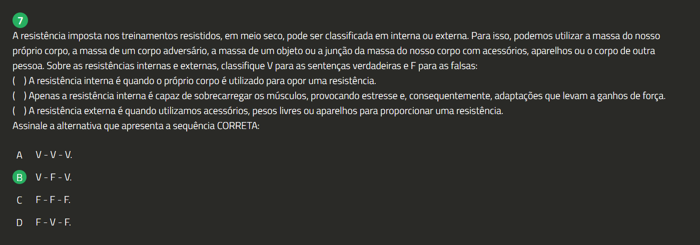 7 A resistência imposta nos treinamentos resistidos, em meio seco, pode ser classificada em interna ou externa. Para isso, podemos utilizar a massa do nosso próprio corpo, a massa de um corpo adversário, a massa de um objeto ou a junção da massa do nosso corpo com acessórios, aparelhos ou 0 corpo de outra pessoa. Sobre as resistências internas e externas, classifique V para as sentenças verdadeiras e F para as falsas: A resistência interna é quando próprio corpo é utilizado para opor uma resistência. ( ) Apenas a resistência interna é capaz de sobrecarregar músculos, provocando estresse e, consequentemente, adaptações que levam a ganhos de força. A resistência externa é quando utilizamos acessórios, pesos livres ou aparelhos para proporcionar uma resistência. Assinale a alternativa que apresenta a sequência CORRETA: A F-F-F. D F-V-F.