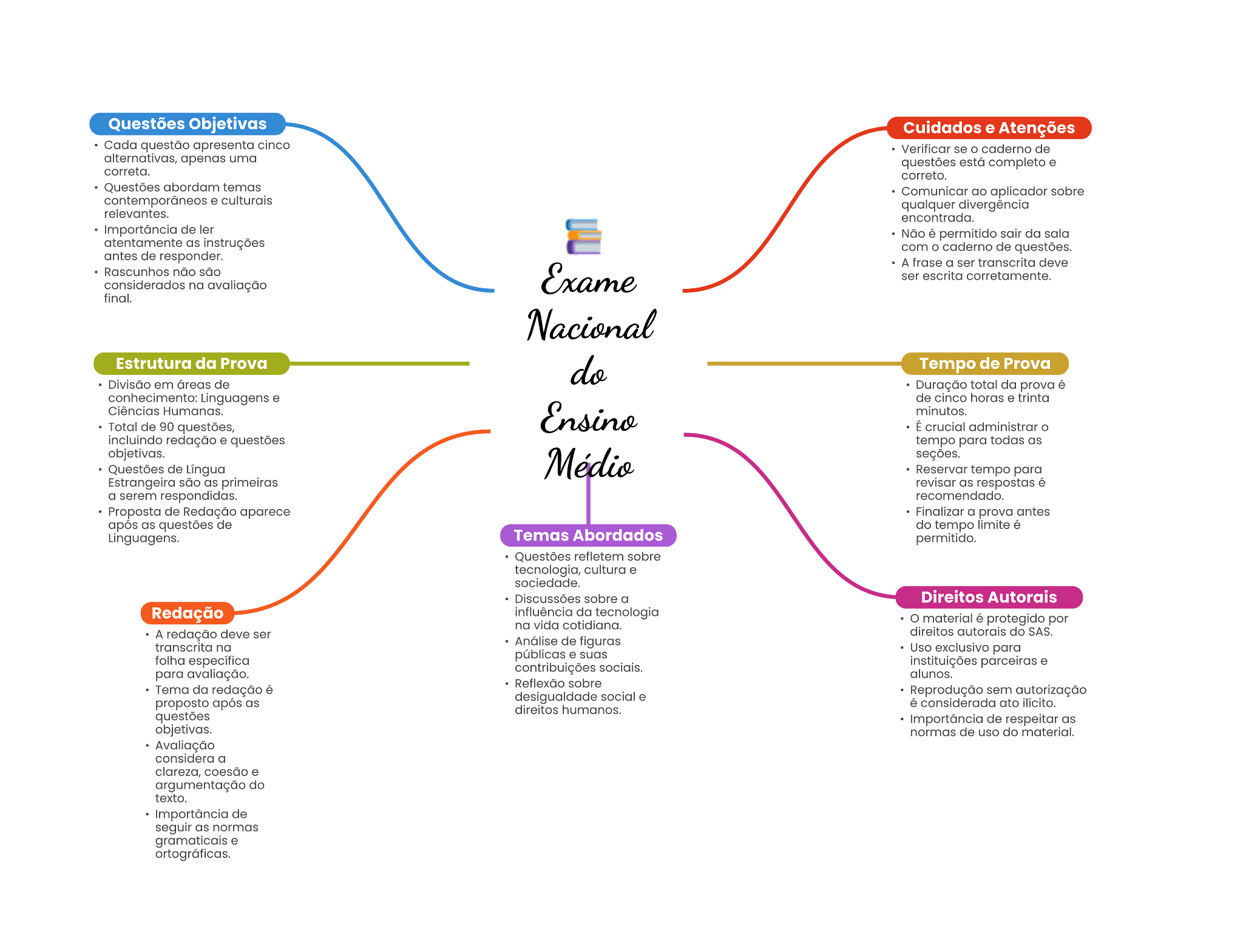 Questões Objetivas Cuidados e Atenções Cada questão apresenta cinco Verificar cademo de alternativas, uma questões está completo . correto. Questões abordam temas Comunicar aplicador sobre . culturals qualquer divergência relevantes. encontrada. de Não permitido sair da sala atentamente as instruções com cademo de questões. de responder. A frase a ser transcrita não escrita considerados na avaliação final. Estrutura da Prova Tempo de Prova Divisão de Duração total da prova é conhecimento: Linguagens de cinco trinto Ciências minutos. Total de 90 questões, É crucial administrar o redação questões tempo para objetivos. seções. Questões de Lingua Reservor tempo para Estrangeira são primeiras revisor as a serem respondida. recomendado. Proposta de Redação aparece Finalizar a prova após as questões de do tempo limite Temas Abordados permitido. Questões refletern sobre cultura sociedade. Discussões sobre a Direitos Autorais Redação influência da tecnologia na vida cotidiana. material é protegido por A redação deve direitos do SAS. transcrita na de folha específica públicas Uso para contribuições instituições parceiras para avaliação. alunos. Tema da redação Reflexão sobre proposto após as desigualdade social . Reprodução sem autorização considerada ato direitos questões importância de respeitar as normas de uso do material. Avallação considera a clareza, e argumentação do Importância de seguir as normas ortográficas.