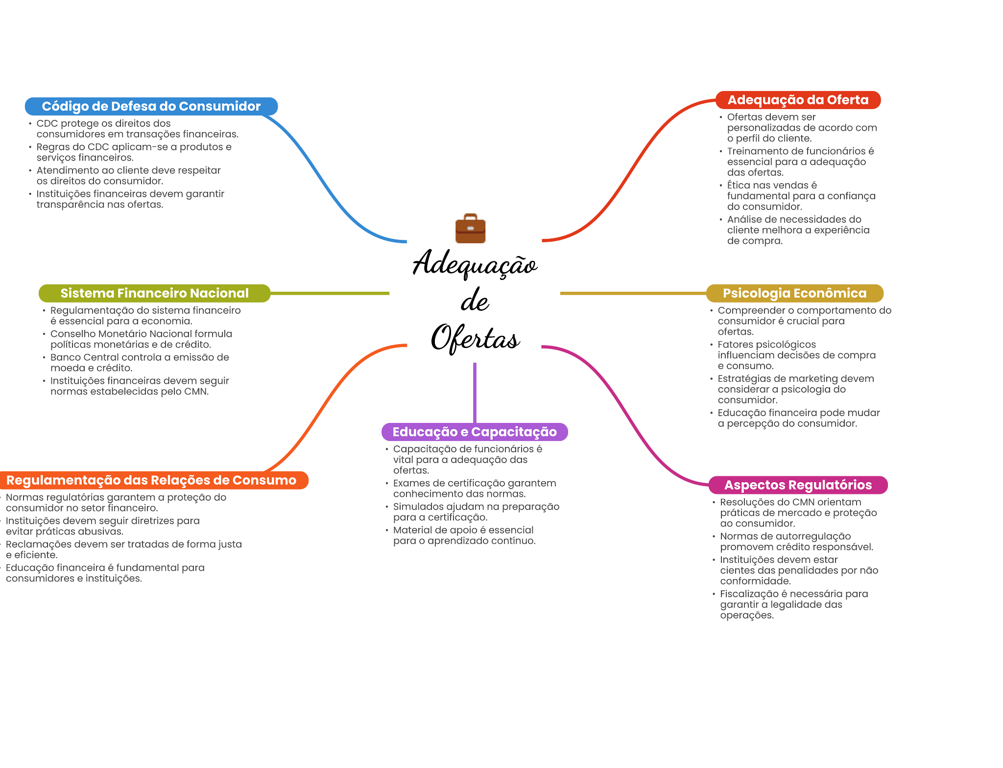 Código de Defesa do Consumidor Adequação da Oferta Ofertas devem ser CDC protege direitos dos consumidores em transações personalizadas de acordo com perfil do clienta. Regras do CDC produtos Treinamento de funcionários serviços financeiros. essencial para a adequação Atendimento do cliente deve das direitos do consumidor. Ética nas vendas financeiras devem garantir fundamental para a transparência nas ofertas. do consumidor. de necessidades do cliente a experiência de compra. Sistema Financeiro Nacional Psicologia Econômica Regulamentação do sistema financeiro Compreender comportamento do 6 essencial para a economia. consumidor é crucial para Conselho Nacional formula politicas monetárias de crédito. Fatores Banco Central controla a emissão de decisões de compra orédito. financeiras devem seguir Estratégias de marketing devern normas pelo CMN. considerar a do consumidor. Educação financeira pode mudar a percepção do consumidor. Educação e Capacitação Capacitação de funcionários vital para a adequação dos Regulamentação das Relações de Consumo de certificação garantem Aspectos Regulatórios Normas regulatórias garantem a proteção do conhecimento das normas. consumidor no setor financeiro. Simulados ajudam na preparação Resoluções do CMN devem seguir diretrizes para para de mercado . proteção consumidor. práticas Material de é essencial para o Normas de autorregulação devern ser tratadas de forma justa promovem crédito responsável. instituições estar Educação financeira fundamental para cientes dos por não consumidores conformidade. Fiscalização é para garantir a legalidade operações.