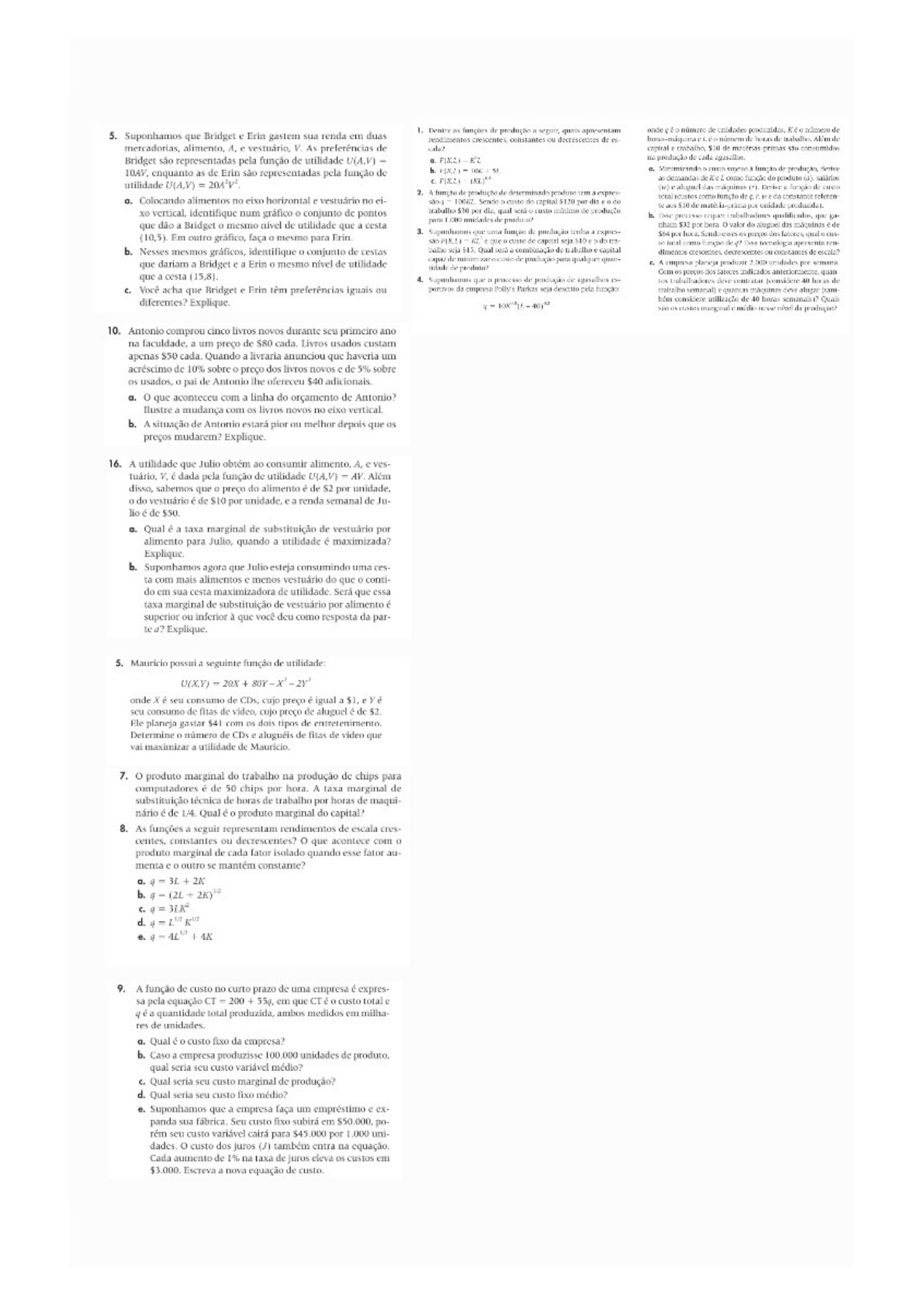 1. Dentre as de produção a apresentam onde número de unidades 0 de 5. Suponhamos que Bridget e Erin gastem sua renda em duas rendimentos crescentes, constantes ou decrescentes de de mercadorias, alimento, e vestuário, V. As preferências de $10 de sto consumidos Bridget são representadas pela função de utilidade 0. produção de cada agasalho. 10AV, enquanto as de Erin são representadas pela função de função de utilidade U(A,V) demandas de do salários (w) das de 2. de de determinado produto a expres- a. alimentos no eixo horizontal e vestuário no ei- total como de da constante referen- Sendo custo do capital $120 do de unidade vertical, identifique num gráfico 0 conjunto de pontos trabalho $30 qual será custo mínimo de produção de b. que que dão a Bridget o mesmo de utilidade que à cesta $32 por o valor do aluguel das de 3. que uma tenha (10,5). Em outro gráfico, faça o mesmo para Erin. $64 qual cus- que do capital seja do to como de b. Nesses mesmos gráficos, identifique conjunto de cestas seja Qual combinação de e capital decrescentes ou constames de escala? de que dariam a Bridget e a Erin mesmo nível de utilidade c. A unidades por de produto? Com preços dos indicados quan que a cesta (15,8). 4. que de de los 40 de Você acha que Bridget e Erin têm preferências iguais ou da empresa Polly's Parkas seja descrito trabalho deve diferentes? Explique. considere utilização de 40 horas semanais marginal 10. Antonio comprou cinco livros novos durante ano na faculdade, a um preço de cada. Livros usados custam apenas cada. Quando a livraria anunciou que haveria um acréscimo de 10% sobre o preço dos livros novos e de 5% sobre os usados, pai de Antonio lhe ofereceu $40 adicionais. o que aconteceu com a linha do orçamento de Antonio? Ilustre a mudança com livros novos no eixo vertical. b. A situação de Antonio estará pior ou melhor depois que os preços mudarem? Explique. 16. A utilidade que Julio obtém ao consumir alimento, A, e ves- tuário, é dada pela função de utilidade AV. Além disso, sabemos que preço do alimento é de por unidade, do vestuário é de $10 por unidade, e a renda semanal de Ju- lio é de a. Qual é a taxa marginal de substituição de vestuário por alimento para Julio, quando a utilidade é maximizada? Explique. b. Suponhamos agora que Julio esteja consumindo uma ces- ta com mais alimentos e menos vestuário do que conti- do em sua cesta maximizadora de utilidade. Será que essa taxa marginal de substituição de vestuário por alimento é superior ou inferior à que você deu como resposta da par- te Explique. 5. possui a seguinte função de utilidade: onde é seu consumo de CDs, cujo preço é igual a seu consumo de fitas de cujo preço de aluguel é de Ele planeja gastar $41 com os dois tipos de entretenimento. Determine o número de CDs e aluguéis de fitas de video que vai maximizar utilidade de 7. o produto marginal do trabalho na produção de chips para computadores é de 50 chips por hora. A taxa marginal de substituição técnica de horas de trabalho por horas de maqui- nário de Qual é produto marginal do capital? 8. As funções a seguir representam rendimentos de escala cres- centes, constantes ou decrescentes? o que acontece com produto marginal de cada fator isolado quando esse fator au- menta e o outro se mantém constante? 9. A função de custo no curto prazo de uma empresa é expres- sa pela equação CT em que CT o custo total e é a quantidade total produzida, ambos medidos em milha- res de unidades. Qual é custo da empresa? b. Caso a empresa produzisse 100.000 unidades de produto, qual seria seu custo variável médio? c. Qual seria seu custo marginal de produção? d. Qual seria seu custo fixo médio? e. Suponhamos que a empresa faça um empréstimo e ex- panda sua Seu custo fixo subirá em $50.000, po- rém seu custo variável cairá para $45.000 por 1.000 uni- dades. o custo dos juros (J) também entra na equação. Cada aumento de 1% na taxa de juros eleva os custos em Escreva a nova equação de custo.