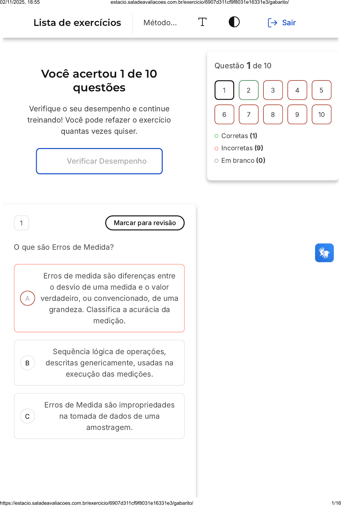 Você acertou 1 de 10 questões Verifique o seu desempenho e continue treinando! Você pode refazer o exercício quantas vezes quiser. Verificar Desempenho A B C 1 Marcar para revisão O que são Erros de Medida? Erros de medida são diferenças entre o desvio de uma medida e o valor verdadeiro, ou convencionado, de uma grandeza. Classifica a acurácia da medição. Sequência lógica de operações, descritas genericamente, usadas na execução das medições. Erros de Medida são impropriedades na tomada de dados de uma amostragem. Questão 1 de 10 Corretas (1) Incorretas (9) Em branco (0) 1 2 3 4 5 6 7 8 9 10 Lista de exercícios Método… Sair 02/11/2025, 18:55 estacio.saladeavaliacoes.com.br/exercicio/6907d311cf9f8031e16331e3/gabarito/ https://estacio.saladeavaliacoes.com.br/exercicio/6907d311cf9f8031e16331e3/gabarito/ 1/16 D E Erros de medida são diferenças entre o valor medido e o valor verdadeiro, ou convencionado, de uma grandeza. Quanto mais acurada uma medida, menor seu erro. Quanto menor o erro de medida, menor a distância entre o valor medido e o valor de referência ou convencionado da grandeza medida. Erros de Medida são grandezas específicas submetidas à medição. Resposta incorreta Opa! A alternativa correta é a letra D. Confira o gabarito comentado! Gabarito Comentado Erros de medida são as diferenças entre o valor obtido em uma medição e o valor verdadeiro ou convencionado da grandeza que está sendo medida. A acurácia de uma medida está diretamente relacionada ao erro de medida: quanto mais acurada for a medida, menor será o erro. Portanto, quando o erro de medida é pequeno, isso significa que a distância entre o valor medido e o valor de referência ou convencionado da grandeza medida é pequena. Isso é o que a alternativa D expressa corretamente. 2 Marcar para revisão O que são Algarismos Significativos? 02/11/2025, 18:55 estacio.saladeavaliacoes.com.br/exercicio/6907d311cf9f8031e16331e3/gabarito/ https://estacio.saladeavaliacoes.com.br/exercicio/6907d311cf9f8031e16331e3/gabarito/ 2/16 A B C Algarismos significativos são os algarismos representativos que compõem o valor de uma incerteza, excluindo-se os zeros à esquerda, nos indicam a precisão dessa medida, onde o último algarismo representado é incerto. Zeros à direita são significativos. Algarismos significativos são os algarismos representativos que compõem o valor de uma grandeza, excluindo-se os zeros à esquerda, nos indicam a precisão dessa medida, onde o último algarismo representado é incerto. Zeros à direita são significativos. Algarismos significativos são os algarismos representativos que compõem o valor do erro de uma medida, excluindo-se os zeros à esquerda, nos indicam a precisão dessa medida, onde o último algarismo representado é incerto. Zeros à direita são significativos. 02/11/2025, 18:55 estacio.saladeavaliacoes.com.br/exercicio/6907d311cf9f8031e16331e3/gabarito/ https://estacio.saladeavaliacoes.com.br/exercicio/6907d311cf9f8031e16331e3/gabarito/ 3/16 D E Algarismos significativos são os algarismos representativos que compõem o valor do desvio de uma medida, excluindo-se os zeros à esquerda, nos indicam a precisão dessa medida, onde o último algarismo representado é incerto. Zeros à direita são significativos. Algarismos significativos são os algarismos representativos que compõem o valor de uma estimativa, excluindo-se os zeros à esquerda, nos indicam a precisão dessa medida, onde o último algarismo representado é incerto. Zeros à direita são significativos. Resposta correta Parabéns, você selecionou a alternativa correta. Confira o gabarito comentado! Gabarito Comentado Os algarismos significativos são os dígitos de um número que carregam informações sobre a precisão. Eles incluem todos os dígitos, exceto: os zeros à esquerda, que apenas definem a posição do ponto decimal; e os zeros à direita de um número sem um ponto decimal, que podem ser arbitrários. Portanto, a alternativa correta é a B, que afirma que os algarismos significativos são os algarismos representativos que compõem o valor de uma grandeza, excluindo-se os zeros à esquerda, indicando a precisão dessa medida, onde o último algarismo 02/11/2025, 18:55 estacio.saladeavaliacoes.com.br/exercicio/6907d311cf9f8031e16331e3/gabarito/ https://estacio.saladeavaliacoes.com.br/exercicio/6907d311cf9f8031e16331e3/gabarito/ 4/16 A B C D E representado é incerto. Zeros à direita são significativos. 3 Marcar para revisão Na Grécia Antiga, berço de grande parte do pensamento ocidental, os filósofos desempenharam um papel fundamental ao promover a racionalidade e o pensamento livre. Entre esses pensadores, um se destacou não apenas por suas contribuições para a compreensão do mundo natural, mas também por sua abordagem pioneira e racional em meio a um contexto dominado por mitos e crenças. Marque a alternativa que indica esse filósofo. Sócrates. Platão. Aristóteles. Pitágoras. Tales de Mileto. Resposta incorreta Opa! A alternativa correta é a letra E. Confira o gabarito comentado! Gabarito Comentado 02/11/2025, 18:55 estacio.saladeavaliacoes.com.br/exercicio/6907d311cf9f8031e16331e3/gabarito/ https://estacio.saladeavaliacoes.com.br/exercicio/6907d311cf9f8031e16331e3/gabarito/ 5/16 A B Antiga, período classificado entre os anos 700 a.C. e 250 d.C. O primeiro filósofo grego a propor a racionalidade e o pensamento livre como formas de compreender os fenômenos universais da natureza foi Tales de Mileto (624-546 a.C.). 4 Marcar para revisão Desde tempos imemoriais, os seres humanos têm buscado medir e compreender o mundo que os cerca. Uma das habilidades mais essenciais é a medição do tempo, permitindo que as atividades sejam organizadas e coordenadas. Sobre a medição do tempo, analise as asserções I e II. I - A medição do tempo é uma habilidade humana que se desenvolveu recentemente, e as unidades de medida de tempo, como horas, minutos e 
