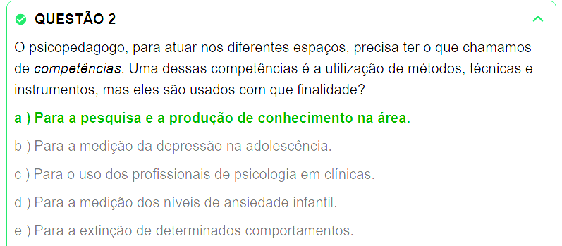 QUESTÃO 2 psicopedagogo, para atuar nos diferentes espaços, precisa ter 0 que chamamos de competências. Uma dessas competências é a utilização de métodos, técnicas e instrumentos, mas eles são usados com que finalidade? a ) Para a pesquisa e a produção de conhecimento na área. b) Para a medição da depressão na adolescência. Para O uso dos profissionais de psicologia em clínicas. d) Para a medição dos níveis de ansiedade infantil. e ) Para a extinção de determinados comportamentos.