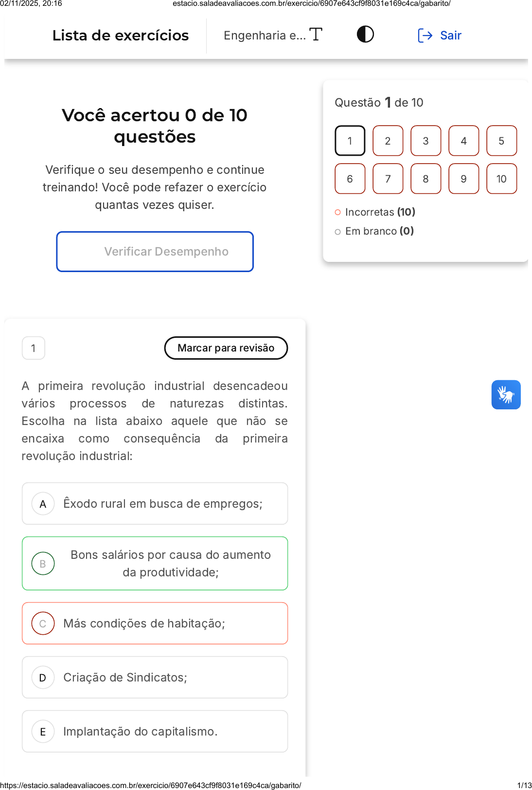 Você acertou 0 de 10 questões Verifique o seu desempenho e continue treinando! Você pode refazer o exercício quantas vezes quiser. Verificar Desempenho A B C D E 1 Marcar para revisão A primeira revolução industrial desencadeou vários processos de naturezas distintas. Escolha na lista abaixo aquele que não se encaixa como consequência da primeira revolução industrial: Êxodo rural em busca de empregos; Bons salários por causa do aumento da produtividade; Más condições de habitação; Criação de Sindicatos; Implantação do capitalismo. Questão 1 de 10 Incorretas (10) Em branco (0) 1 2 3 4 5 6 7 8 9 10 Lista de exercícios Engenharia e… Sair 02/11/2025, 20:16 estacio.saladeavaliacoes.com.br/exercicio/6907e643cf9f8031e169c4ca/gabarito/ https://estacio.saladeavaliacoes.com.br/exercicio/6907e643cf9f8031e169c4ca/gabarito/ 1/13 A B C Resposta incorreta Opa! A alternativa correta é a letra B. Confira o gabarito comentado! Gabarito Comentado A alternativa B, que menciona "bons salários por causa do aumento da produtividade", não é uma consequência da primeira revolução industrial. Na verdade, apesar do aumento da produtividade, os salários não eram bons. Os trabalhadores eram submetidos a longas jornadas de trabalho, baixos salários e condições precárias. Isso ocorreu porque a mão de obra era abundante e, portanto, barata, e porque não havia regulamentações trabalhistas para proteger os trabalhadores. 2 Marcar para revisão Obras de engenharia quando bem realizadas tendem a superar sua expectativa de vida útil, muitas vezes, sobrevivendo as intempéries, mesmo não estando exercendo a função para a qual foram construídas. Um exemplo de construções deste tipo é a(o): Torre Eiffel em Paris. Estátua de Liberdade em Nova York. Aqueduto em Roma. 02/11/2025, 20:16 estacio.saladeavaliacoes.com.br/exercicio/6907e643cf9f8031e169c4ca/gabarito/ https://estacio.saladeavaliacoes.com.br/exercicio/6907e643cf9f8031e169c4ca/gabarito/ 2/13 D E Estrada de ferro do trem bala em Tokio. Edifício Burj Khalifa em Dubai. Resposta incorreta Opa! A alternativa correta é a letra C. Confira o gabarito comentado! Gabarito Comentado Os aquedutos romanos são exemplos de obras de engenharia que resistiram ao tempo e as suas funções. Gigantescos e extensos estes aquedutos foram inteligentemente construídos para suprir as necessidades de água para a cidade de Roma. As demais opções apresentam obras de engenharia que são muito ou relativamente atuais, mas nada comparado com as obras milenares dos romanos. 3 Marcar para revisão Para nossos futuros netos que seja diferente do que encontramos no meio ambiente poluído nos dias de hoje. Com relação a esse tema, analise as seguintes asserções: I. Remodelar processos antigos são oportunidades de inovação. PORQUE II. O meio ambiente está cobrando o preço por tanto descaso com a poluição, como por 02/11/2025, 20:16 estacio.saladeavaliacoes.com.br/exercicio/6907e643cf9f8031e169c4ca/gabarito/ https://estacio.saladeavaliacoes.com.br/exercicio/6907e643cf9f8031e169c4ca/gabarito/ 3/13 A B C D E exemplo, o aumento da temperatura do planeta. Analisando as asserções realizadas acima, assinale a opção que representa a correta razão entre elas. A asserção I está correta e a asserção II é uma justificativa da asserção I. A asserção I está correta e a asserção II está correta, mas não é uma justificativa da asserção I. A asserção I está correta e a asserção II está incorreta. A asserção I está incorreta e a asserção II está correta. Ambas as asserções estão incorretas. Resposta incorreta Opa! A alternativa correta é a letra A. Confira o gabarito comentado! Gabarito Comentado I - Correta: Os processos antigos devem ser revistos com o olhar do impacto ambiental, transformando-se em novas oportunidades de inovação. II - Correta: A poluição atmosférica causada pela industrialização, pelos transportes e pela geração de energia; a poluição dos corpos hídricos causada pela falta de saneamento, pelos resíduos sólidos e efluentes; a contaminação do 02/11/2025, 20:16 estacio.saladeavaliacoes.com.br/exercicio/6907e643cf9f8031e169c4ca/gabarito/ https://estacio.saladeavaliacoes.com.br/exercicio/6907e643cf9f8031e169c4ca/gabarito/ 4/13 A B solo e do lençol freático, todas essas modificações impõem um reposicionamento do equilíbrio dos sistemas do planeta, trazendo consequências indesejáveis a todos e que também impactam negativamente o desenvolvimento. 4 Marcar para revisão O crescimento econômico de um ramo está enraizado na inovação tecnológica do seu segmento. Com relação a esse tema, analise as seguintes asserções: I. Uma inovação tecnologia necessariamente não precisa estar associada a resolução de um problema. PORQUE II. Um produto ou processo novo também é uma maneira de inovar. Analisando as asserções realizadas acima, assinale a opção que representa a correta razão entre elas. A asserção I está correta e a asserção II é uma justificativa da asserção I. A asserção I está correta e a asserção II está correta, mas não é uma justificativa da asserção I. 02/11/2025, 20:16 estacio.saladeavaliacoes.com.br/exercicio/6907e643cf9f8031e169c4ca/gabarito/ https://estacio.saladeavaliacoes.com.br/exercicio/6907e643cf9f8031e169c4ca/gabarito/ 5/13 C D E A asserção I está correta e a asserção II está incorreta. A asserção I está incorreta e a asserção II está correta. Ambas as asserções estão incorretas. Resposta incorreta Opa! A alternativa correta é a letra D. Confira o gabarito comentado! Gabarito Comentado I - Incorreta: Para ser considerado uma inovação tecnológica, a iniciativa deve estar associada a resolução de um problema. II - Correta: Pode ser um produto ou um processo, ou seja, especificar uma nova forma de se fazer alguma coisa também é inovar. 5 Marcar para revisão No período inicial da Idade Média, a Europa experime