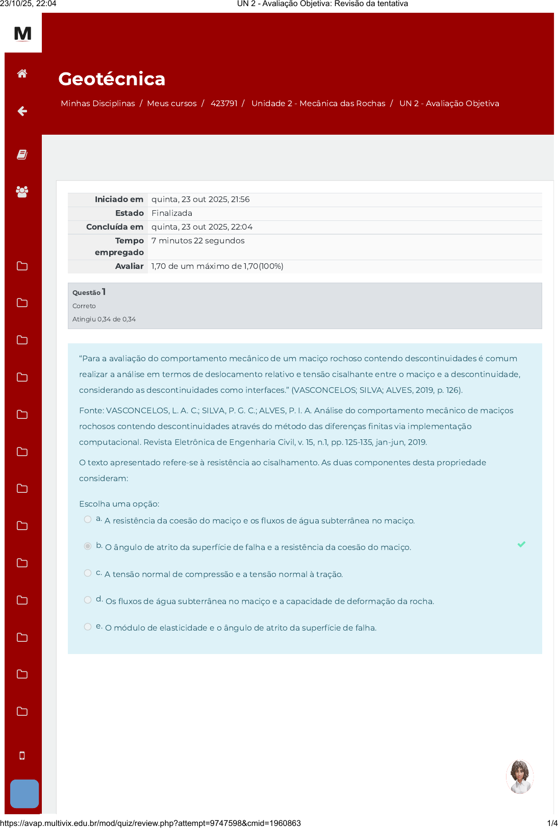 Minhas Disciplinas / Meus cursos / 423791 / Unidade 2 - Mecânica das Rochas / UN 2 - Avaliação Objetiva Geotécnica Iniciado em quinta, 23 out 2025, 21:56 Estado Finalizada Concluída em quinta, 23 out 2025, 22:04 Tempo empregado 7 minutos 22 segundos Avaliar 1,70 de um máximo de 1,70(100%) Questão 1 Correto Atingiu 0,34 de 0,34 “Para a avaliação do comportamento mecânico de um maciço rochoso contendo descontinuidades é comum realizar a análise em termos de deslocamento relativo e tensão cisalhante entre o maciço e a descontinuidade, considerando as descontinuidades como interfaces.” (VASCONCELOS; SILVA; ALVES, 2019, p. 126). Fonte: VASCONCELOS, L. A. C.; SILVA, P. G. C.; ALVES, P. I. A. Análise do comportamento mecânico de maciços rochosos contendo descontinuidades através do método das diferenças finitas via implementação computacional. Revista Eletrônica de Engenharia Civil, v. 15, n.1, pp. 125-135, jan-jun, 2019. O texto apresentado refere-se à resistência ao cisalhamento. As duas componentes desta propriedade consideram: Escolha uma opção: a. A resistência da coesão do maciço e os fluxos de água subterrânea no maciço. b. O ângulo de atrito da superfície de falha e a resistência da coesão do maciço.  c. A tensão normal de compressão e a tensão normal à tração. d. Os fluxos de água subterrânea no maciço e a capacidade de deformação da rocha. e. O módulo de elasticidade e o ângulo de atrito da superfície de falha.                    23/10/25, 22:04 UN 2 - Avaliação Objetiva: Revisão da tentativa https://avap.multivix.edu.br/mod/quiz/review.php?attempt=9747598&cmid=1960863 1/4 https://avap.multivix.edu.br/my/ https://avap.multivix.edu.br/course/view.php?id=36297 https://avap.multivix.edu.br/course/view.php?id=36297§ion=3 https://avap.multivix.edu.br/mod/quiz/view.php?id=1960863 https://avap.multivix.edu.br/my/ https://avap.multivix.edu.br/course/view.php?id=36297 https://avap.multivix.edu.br/user/index.php?id=36297 https://avap.multivix.edu.br/course/view.php?id=36297§ion=1 https://avap.multivix.edu.br/course/view.php?id=36297§ion=2 https://avap.multivix.edu.br/course/view.php?id=36297§ion=3 https://avap.multivix.edu.br/course/view.php?id=36297§ion=4 https://avap.multivix.edu.br/course/view.php?id=36297§ion=5 https://avap.multivix.edu.br/course/view.php?id=36297§ion=6 https://avap.multivix.edu.br/course/view.php?id=36297§ion=7 https://avap.multivix.edu.br/course/view.php?id=36297§ion=8 https://avap.multivix.edu.br/course/view.php?id=36297§ion=9 https://avap.multivix.edu.br/course/view.php?id=36297§ion=10 https://avap.multivix.edu.br/course/view.php?id=36297§ion=11 https://avap.multivix.edu.br/course/view.php?id=36297§ion=12 https://avap.multivix.edu.br/course/view.php?id=36297§ion=13 https://avap.multivix.edu.br/hooks/portal/ https://avap.multivix.edu.br/mod/page/view.php?id=1252%2F%22%20target%3D%22_blank https://avap.multivix.edu.br/ https://avap.multivix.edu.br/ https://avap.multivix.edu.br/ https://avap.multivix.edu.br/ https://avap.multivix.edu.br/ Questão 2 Correto Atingiu 0,34 de 0,34 Marques e Vargas Jr (1994) salientam a importância da caracterização mineralógica na identificação de argilo- minerais e qualquer outra substância que possa causar expansão ou contração da rocha. “Os componentes mineralógicos foram identificados a partir de ensaios de difratometria de raios X e de análise petrográfica por lâminas delgadas, no intuito de prever o comportamento do material perante fatores externos e de identificar as principais características que influenciam seu comportamento geomecânico.” (LOPES et al., 2007, p. 72). Fontes: LOPES, M. C.; LANA, M. S.; RIBEIRO, L. F. M.; SILVA, C. H. C. Comportamento geotécnico de rochas brandas na mina Córrego do Sítio, Santa Bárbara (MG). Revista Escola de Minas (REM). v. 60, n. 3, set. 2007. MARQUES, E.A.G.,VARGAS JR, E.A. Weatherability and alteration studies of some shales and siltstones from the Recôncavo sedimentary basin. In: INTERNATIONAL IAEG CONGRESS, 7. Rotterdam. 1994. O texto apresentado refere-se a um sistema de classificação de maciços rochosos, que é: Escolha uma opção: a. Classificação de Mohr-Coulomb. b. Classificação litológica.  c. Classificação de Terzaghi. d. Classificação estrutural. e. Classificação de Young.                    23/10/25, 22:04 UN 2 - Avaliação Objetiva: Revisão da tentativa https://avap.multivix.edu.br/mod/quiz/review.php?attempt=9747598&cmid=1960863 2/4 https://avap.multivix.edu.br/my/ https://avap.multivix.edu.br/course/view.php?id=36297 https://avap.multivix.edu.br/user/index.php?id=36297 https://avap.multivix.edu.br/course/view.php?id=36297§ion=1 https://avap.multivix.edu.br/course/view.php?id=36297§ion=2 https://avap.multivix.edu.br/course/view.php?id=36297§ion=3 https://avap.multivix.edu.br/course/view.php?id=36297§ion=4 https://avap.multivix.edu.br/course/view.php?id=36297§ion=5 https://avap.multivix.edu.br/course/view.php?id=36297§ion=6 https://avap.multivix.edu.br/course/view.php?id=36297§ion=7 https://avap.multivix.edu.br/course/view.php?id=36297§ion=8 https://avap.multivix.edu.br/course/view.php?id=36297§ion=9 https://avap.multivix.edu.br/course/view.php?id=36297§ion=10 https://avap.multivix.edu.br/course/view.php?id=36297§ion=11 https://avap.multivix.edu.br/course/view.php?id=36297§ion=12 https://avap.multivix.edu.br/course/view.php?id=36297§ion=13 https://avap.multivix.edu.br/hooks/portal/ https://avap.multivix.edu.br/mod/page/view.php?id=1252%2F%22%20target%3D%22_blank https://avap.multivix.edu.br/ https://avap.multivix.edu.br/ https://avap.multivix.edu.br/ https://avap.multivix.edu.br/ https://avap.multivix.edu.br/ Questão 3 Correto Atingiu 0,34 de 0,34 Questão 4 Correto Atingiu 0,34 de 0,34 “Para a testemunhagem, um barrilete é fixado na haste de perfuração. Uma broca de testemunhagem é fixada na parte inferior do barrilete. O elemento cortante na broca pod