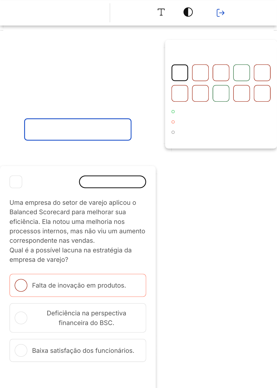 financeiras desenvolvidas". O controle estratégico tem como finalidade ampliar o conhecimento de todos os participantes sobre o ambiente, negociar e integrar as questões estratégicas entre as áreas, monitorar e acompanhar os resultados e avaliar a estratégia no que se refere à consistência e atualidade. No entanto, assegurar o reconhecimento de apenas atividades financeiras desenvolvidas não é uma finalidade do controle estratégico, pois este deve considerar todas as atividades da organização, não apenas as financeiras. A B C D E 9 Marcar para revisão São características do controle tático, EXCETO: Controle orçamentário Tarefas individuais Mensuração dos resultados Contabilidade de custos Ações corretivas Resposta incorreta Opa! A alternativa correta é a letra B. Confira o gabarito comentado! Gabarito Comentado O controle tático é um tipo de controle que se concentra em monitorar as atividades de curto prazo dentro de uma organização. Isso inclui o controle orçamentário, a mensuração dos resultados, a contabilidade de custos e a implementação de ações corretivas. No entanto, as tarefas individuais não são consideradas uma característica do controle tático, pois este se concentra A B C D E mais em atividades de grupo e departamentais do que em tarefas individuais. Portanto, a alternativa "Tarefas individuais" é a única que não é uma característica do controle tático. 10 Marcar para revisão Um banco está revisando seu controle estratégico após enfrentar desafios na implementação de novas estratégias. Qual deve ser a principal preocupação na revisão do controle estratégico deste banco? Maximização do controle sobre todas as operações Eliminação de todos os processos inovadores Enfoque exclusivo na redução de custos Equilíbrio entre controle e capacidade de inovação Foco somente na expansão de mercado Resposta incorreta Opa! A alternativa correta é a letra D. Confira o gabarito comentado! Gabarito Comentado Para o banco, a principal preocupação na revisão do controle estratégico deve ser encontrar um equilíbrio entre manter um nível adequado de controle e permitir a capacidade de inovação. Isso é crucial para implementar novas estratégias eficazmente e responder a mudanças do mercado.financeiras desenvolvidas". O controle estratégico tem como finalidade ampliar o conhecimento de todos os participantes sobre o ambiente, negociar e integrar as questões estratégicas entre as áreas, monitorar e acompanhar os resultados e avaliar a estratégia no que se refere à consistência e atualidade. No entanto, assegurar o reconhecimento de apenas atividades financeiras desenvolvidas não é uma finalidade do controle estratégico, pois este deve considerar todas as atividades da organização, não apenas as financeiras. A B C D E 9 Marcar para revisão São características do controle tático, EXCETO: Controle orçamentário Tarefas individuais Mensuração dos resultados Contabilidade de custos Ações corretivas Resposta incorreta Opa! A alternativa correta é a letra B. Confira o gabarito comentado! Gabarito Comentado O controle tático é um tipo de controle que se concentra em monitorar as atividades de curto prazo dentro de uma organização. Isso inclui o controle orçamentário, a mensuração dos resultados, a contabilidade de custos e a implementação de ações corretivas. No entanto, as tarefas individuais não são consideradas uma característica do controle tático, pois este se concentra A B C D E mais em atividades de grupo e departamentais do que em tarefas individuais. Portanto, a alternativa "Tarefas individuais" é a única que não é uma característica do controle tático. 10 Marcar para revisão Um banco está revisando seu controle estratégico após enfrentar desafios na implementação de novas estratégias. Qual deve ser a principal preocupação na revisão do controle estratégico deste banco? Maximização do controle sobre todas as operações Eliminação de todos os processos inovadores Enfoque exclusivo na redução de custos Equilíbrio entre controle e capacidade de inovação Foco somente na expansão de mercado Resposta incorreta Opa! A alternativa correta é a letra D. Confira o gabarito comentado! Gabarito Comentado Para o banco, a principal preocupação na revisão do controle estratégico deve ser encontrar um equilíbrio entre manter um nível adequado de controle e permitir a capacidade de inovação. Isso é crucial para implementar novas estratégias eficazmente e responder a mudanças do mercado.
