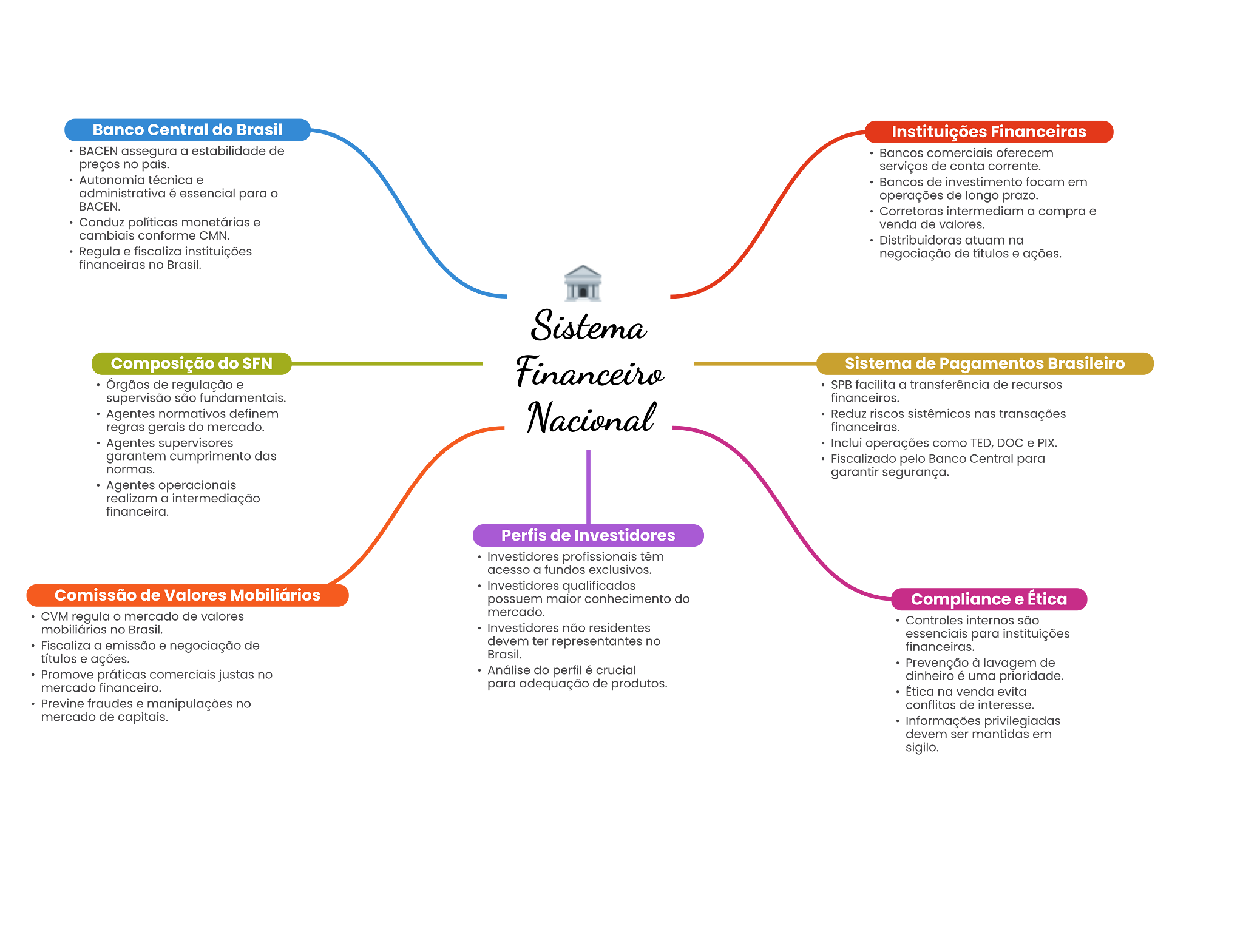 Banco Central do Brasil Instituições Financeiras BACEN assegura a estabilidade de Bancos oferecem preços no país. serviços de conta corrente. Autonomia técnica Bancos de investimento focam em administrativa essencial para o operações de longo prazo. BACEN, Corretoras a compra Conduz venda de valores. conforme CMN. atuam na Regula fiscaliza de ações. no Brasil. Composição do SFN Sistema de Pagamentos Brasileiro Órgãos de regulação SPB facilita a transferência de recursos são normativos definem Reduz riscos nas transações regras do mercado. financeiras. Agentes supervisores operações como TED, DOC . PIX. garantem cumprimento das Fiscalizado pelo Banco Central para normas. garantir segurança. a intermediação financeira. Perfis de Investidores têm acesso a fundos exclusivos. qualificados Comissão de Valores Mobiliários conhecimento do Compliance e Ética CVM regula mercado de valores mercado. são mobiliários no não residentes a emissão negociação de devem ter representantes no essenciale para instituições financeiros. ações. Brasil. do perfil é crucial Prevenção à lavagem de Promove práticas no para adequação de produtos. dinheiro é uma prioridade. mercado financeiro. Ética na venda evita fraudes manipulações no de interesse. mercado de capitals. devem ser em