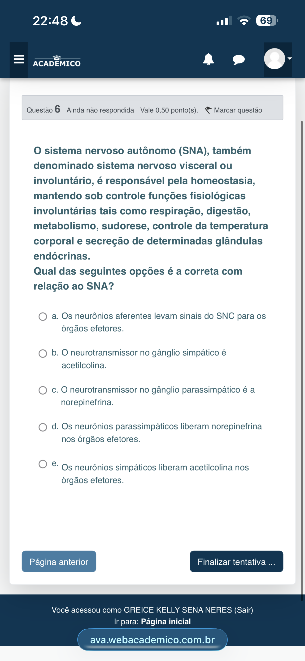 22:48 69 ACADEMICO Questão 6 Ainda não respondida Vale 0,50 ponto(s). Marcar questão sistema nervoso autônomo (SNA), também denominado sistema nervoso visceral ou involuntário, é responsável pela homeostasia, mantendo sob controle funções fisiológicas involuntárias tais como respiração, digestão, metabolismo, sudorese, controle da temperatura corporal e secreção de determinadas glândulas endócrinas. Qual das seguintes opções é a correta com relação ao SNA? a. Os neurônios aferentes levam sinais do SNC para os órgãos efetores. b. neurotransmissor no gânglio simpático é acetilcolina. neurotransmissor no gânglio parassimpático é a norepinefrina. d. Os neurônios parassimpáticos liberam norepinefrina nos órgãos efetores. e. Os neurônios simpáticos liberam acetilcolina nos órgãos efetores. Página anterior Finalizar tentativa Você acessou como GREICE KELLY SENA NERES (Sair) Ir para: Página inicial ava.webacademico.com.br