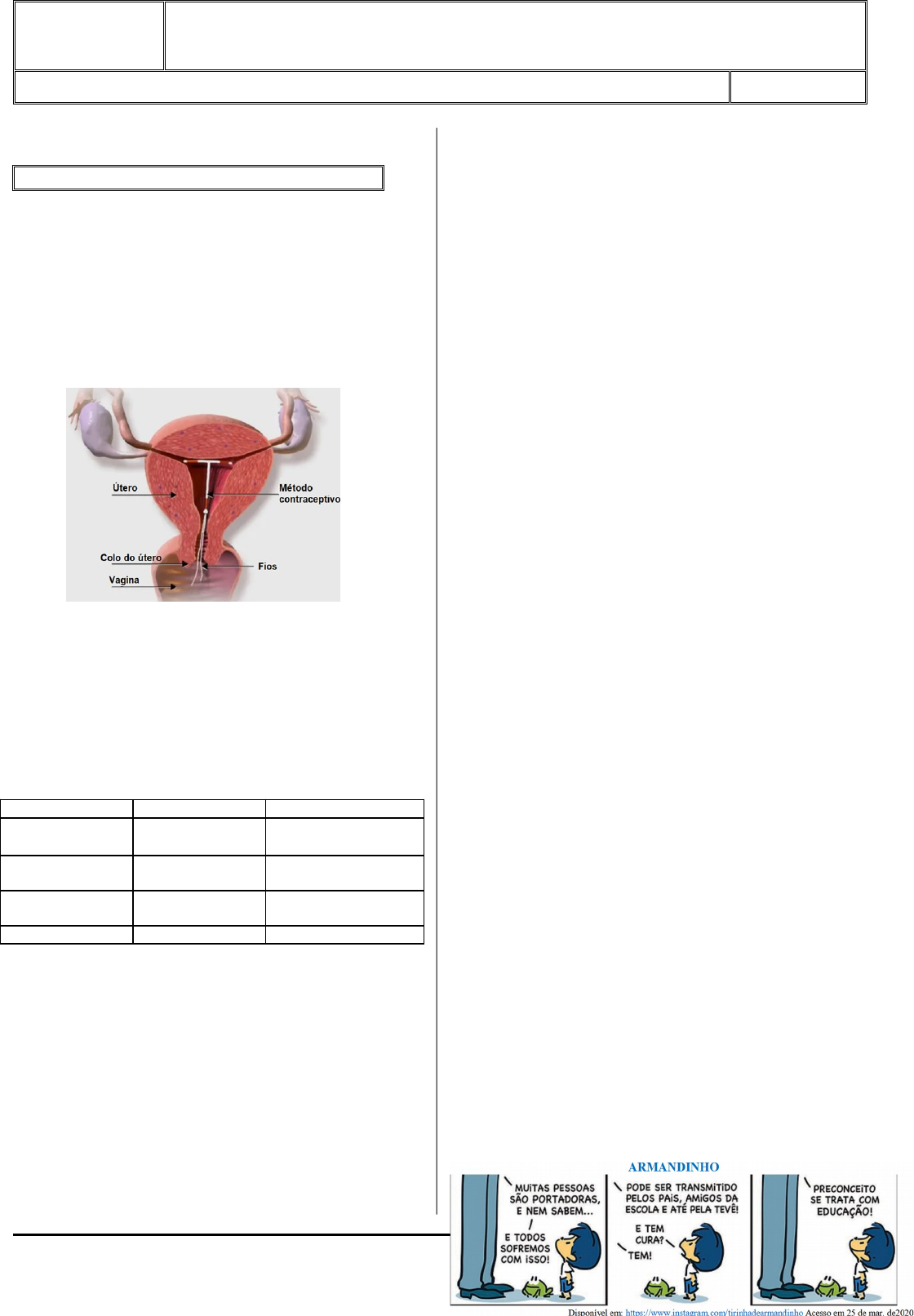 AVALIAÇÕES – I TRIMESTRE ALUNO (A): TURMA: 8º ano EREF DESEMBARGADOR CARLOS XAVIER PAES BARRETTO DISCIPLINA CIÊNCIAS QUESTÃO 1 (D042_CN) Leia o texto abaixo sobre um determinado método contraceptivo. “É um método contraceptivo de longa duração que consiste num pequeno dispositivo em forma de "T" ou "Y" inserido dentro do útero. Ele é um dos métodos anticoncepcionais mais eficazes disponíveis, com taxas de sucesso superiores a 99%. Ele ode ser de cobre, prata ou hormonal e age impedindo que o óvulo seja fertilizado ou impedindo que o espermatozoide atinja o óvulo” O método contraceptivo que possui o princípio de ação descrito nesse texto é denominado: A) DIU B) espermicida C) laqueadura D) preservativo QUESTÃO 2 (D042_CN) Observe a tabela a seguir com alguns métodos contraceptivos e suas características: Método Tipo Eficácia média (%) Camisinha (preservativo) Barreira 85–98 Pílula anticoncepcional Hormonal 91–99 DIU de cobre Dispositivo intrauterino 99 Coito interrompido Comportamental 73 Com base na tabela, assinale a alternativa correta: A) O método comportamental é o mais eficaz e protege contra ISTs. B) O DIU de cobre é o único método que protege contra infecções sexualmente transmissíveis. C) A camisinha apresenta alta eficácia e também protege contra ISTs. D) A pílula anticoncepcional é o único método 100% eficaz. QUESTÃO 3 (D042_CN) Uma das formas mais confiáveis de prevenção de ISTs, especialmente em relações casuais ou com múltiplos parceiros, é: A) Utilizar anticoncepcionais hormonais B) Fazer coito interrompido C) Uso consistente e correto de preservativo D) Banhos após relações QUESTÃO 4 (D042_CN) Em qual cenário a pílula do dia seguinte é recomendada? A) Como método contraceptivo diário B) Após esquecer método anticoncepcional contínuo C) Repositora de hormônios para uso mensal D) Substituto da camisinha QUESTÃO 5 (D042_CN) Sobre os métodos contraceptivos, marque com V ou F as afirmativas abaixo: ( ) A camisinha, além de prevenir uma gravidez não planejada, protege o casal de todas as doenças sexualmente transmissíveis. ( ) Coito interrompido é o método de contracepção que consiste na retirada do pênis da vagina antes da ejaculação, a fim de impedir a deposição de sêmen no interior da mesma. ( ) Qualquer mulher pode utilizar o método da tabelinha para evitar a concepção, sendo bastante eficaz quanto a este objetivo. ( ) A laqueadura, em alguns casos, pode ser revertida. ( ) pílulas anticoncepcionais, além de prevenir a gravidez, são também utilizadas no tratamento de acnes, endometriose, cólica e síndrome dos ovários policísticos. Sobre os métodos contraceptivos, marque a alternativa correta quanto à sequência (A, B, C, D, E): A) V – V – F – V – V B) V – F – V – V – F C) F – V – F – V – V D) V – V – V – F – V QUESTÃO 6 (D050_CN) Fungos podem ser parasitas causadores de doenças em plantas e animais. Em mulheres, por exemplo, é muito comum a manifestação do fungo Candida albicans agente causador da doença: A) HPV B) histoplasmose C) gonorreia D) candidíase QUESTÃO 7 (D050_CN) O HPV é uma IST causada por vírus. Há mais de 100 tipos diferentes de vírus causadores dessa doença. Um dos principais sintomas é a presença de verrugas genitais. Um dos maiores riscos em relação à infecção por alguns tipos de HPV é: A) a tendência ao câncer do colo do útero. B) a destruição de linfócitos T. C) a hipertensão. D) a infertilidade. QUESTÃO 8 (D040) (D050_CN) Leia a tirinha abaixo e responda as questões a seguir: O personagem Armandinho está conversando com um adulto sobre um problema comum que deve ser combatido por todos: o preconceito. Às vezes, pessoas com AIDS ou IST’s não querem revelar que têm a doença ou infecção por medo de sofrer discriminação. Qual é uma consequência negativa do medo de discriminação por pessoas com HIV ou IST’s? A) Maior adesão ao tratamento médico B) Maior qualidade de vida C) Dificuldade em procurar ajuda médica D) Aumento do número de pessoas diagnosticadas QUESTÃO 9 (D050_CN) O que define uma infecção sexualmente transmissível (IST)? A) Uma doença que se transmite pelo ar B) Uma infecção transmitida pelo contato sexual, incluindo oral, anal ou vaginal C) Uma condição só transmitida por sangue D) Uma doença exclusivamente sintomática QUESTÃO 10 (D050_CN) Leia no texto abaixo as características de cada fase de uma determinada doença. As fases descritas nesse texto caracterizam a doença denominada: A) AIDS. B) Gonorreia. C) Herpes. D) Sífilis. Bom Desempenho! Gabarito 1. A 2. C 3. C 4. B 5. C 6. D 7. A 8. C 9. B 10. D image1.png image2.png image3.png