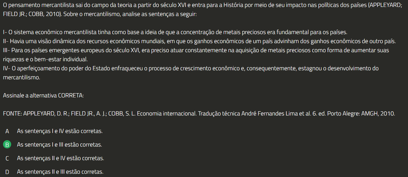 0 pensamento mercantilista sai do campo da teoria a partir do século XVI e entra para a História por meio de seu impacto nas políticas dos países (APPLEYARD; FIELD JR.; 2010). Sobre 0 mercantilismo, analise as sentenças a seguir: 0 sistema econômico mercantilista tinha como base a ideia de que a concentração de metais preciosos era fundamental para países. II- Havia uma visão dinâmica dos recursos econômicos mundiais, em que OS ganhos econômicos de um país advinham dos ganhos econômicos de outro país. III- Para países emergentes europeus do século XVI, era preciso atuar constantemente na aquisição de metais preciosos como forma de aumentar suas riquezas e 0 bem-estar individual. IV- 0 aperfeiçoamento do poder do Estado enfraqueceu 0 processo de crescimento econômico e, consequentemente, estagnou 0 desenvolvimento do mercantilismo. Assinale a alternativa CORRETA: FONTE: APPLEYARD, D. R.; FIELD JR., J.; COBB, S. L. Economia internacional. Tradução técnica André Fernandes Lima et al. 6. ed. Porto Alegre: AMGH, 2010. A As sentenças le IV estão corretas. As sentenças e III estão corretas. As sentenças e IV estão corretas. D As sentenças e III estão corretas.