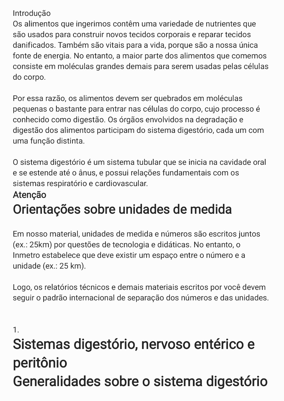 Introdução Os alimentos que ingerimos contêm uma variedade de nutrientes que são usados para construir novos tecidos corporais e reparar tecidos danificados. Também são vitais para a vida, porque são a nossa única fonte de energia. No entanto, a maior parte dos alimentos que comemos consiste em moléculas grandes demais para serem usadas pelas células do corpo. Por essa razão, os alimentos devem ser quebrados em moléculas pequenas bastante para entrar nas células do corpo, cujo processo é conhecido como digestão. Os órgãos envolvidos na degradação e digestão dos alimentos participam do sistema digestório, cada um com uma função distinta. sistema digestório é um sistema tubular que se inicia na cavidade oral e se estende até ânus, e possui relações fundamentais com os sistemas respiratório e cardiovascular. Atenção Orientações sobre unidades de medida Em nosso material, unidades de medida e números são escritos juntos (ex.: 25km) por questões de tecnologia e didáticas. No entanto, Inmetro estabelece que deve existir um espaço entre número e a unidade (ex.: 25 km). Logo, os relatórios técnicos e demais materiais escritos por você devem seguir padrão internacional de separação dos números e das unidades. 1. Sistemas digestório, nervoso entérico e peritônio Generalidades sobre sistema digestóriosistema digestório tem duas subdivisões anatômicas: trato digestório e os órgãos acessórios. trato é composto por um tubo musculomembranoso que se estende da boca ao ânus, que mede cerca de 5m de comprimento in vivo, mas, devido à perda de tônus muscular na morte, normalmente, tem cerca de 9m de comprimento no cadáver. É também conhecido como canal alimentar. Note na imagem a seguir que baço está representado, porém, não possui papel no sistema digestório, somente relações anatômicas. Cavidade oral língua esôfago baço fígado estômago vesícula biliar pâncreas intestino grosso intestino apêndice delgado vermiforme reto ânus Elementos do sistema digestório. Pertencem ao sistema digestório a boca, a faringe, esôfago, estômago, intestino delgado (dividido em duodeno, jejuno e íleo) e o intestino grosso. Parte dele, estômago e os intestinos, constitui trato gastrointestinal (TGI). Os órgãos acessórios, na parte proximal (boca), são os dentes, a língua e as glândulas salivares. Na cavidade abdominal, os anexos são fígado, a vesícula biliar e pâncreas. Os dentes auxiliam na decomposição física (mecânica) dos alimentos; a língua auxilia na mastigação e na deglutição. Curiosidade Os outros órgãos digestivos acessórios, entretanto, nunca entram emcontato direto com os alimentos: eles produzem ou armazenam secreções que fluem para trato gastrointestinal por meio de ductos e auxiliam na decomposição química dos alimentos. sistema digestório é sistema orgânico que processa os alimentos, extrai os nutrientes e elimina os resíduos. Ele faz por meio de algumas etapas: Ingestão Processo que envolve levar os alimentos sólidos e líquidos à boca. Secreção As células das paredes do TGI e órgãos digestivos acessórios secretam água, ácidos, tampões e enzimas para lúmen do trato. Mistura e propulsão As contrações e relaxamentos alternados do músculo liso nas paredes do TGI misturam alimentos e secreções e os movem em direção ao ânus. Essa capacidade do TGI de misturar e mover material ao longo de seu comprimento é chamada de motilidade. Digestão Trata-se de processos mecânicos ou químicos que visam quebrar em pequenas moléculas os alimentos ingeridos. Na digestão mecânica, os dentes cortam e trituram alimento antes deste ser deglutido. Em seguida, os músculos lisos do estômago e do intestino delgado movimentam alimento para auxiliar no processo. Como resultado, as moléculas dos alimentos se dissolvem e se misturam às enzimas digestivas. Na digestão química, as moléculas dos alimentos são quebradas em moléculas menores. As enzimas digestivas produzidas pelas glândulas salivares, língua, estômago, pâncreas e intestino delgado aceleram essas reações. Algumas substâncias presentes nos alimentos podem ser absorvidas sem digestão química, como vitaminas, íons, colesterol e água. Absorção Refere-se à passagem de fluidos, íons e produtos da digestão para a corrente sanguínea.Defecação Resíduos, substâncias e/ou frações indigestíveis dos alimentos, bactérias, células eliminadas do revestimento do TGI e materiais digeridos que não foram absorvidos em sua jornada pelo trato digestório deixam corpo pelo ânus, em um processo chamado defecação, que os elimina por meio das fezes. A parede do trato digestório, desde a parte inferior (1/3) do esôfago até canal anal, tem mesmo arranjo estrutural de tecidos em quatro camadas, a saber: Mucosa Submucosa Muscular Serosa A mucosa é revestimento interno do trato gastrointestinal, composta por uma camada de epitélio em contato direto com conteúdo do TGI, uma camada de tecido conjuntivo chamada de lâmina própria e uma fina camada de músculo liso (muscular da mucosa). Na lâmina própria, há a presença predominante de aglomerados de tecidos linfáticos, denominados de tecido linfático associado à mucosa (MALT, a sigla em inglês). Exemplo Temos as placas de Peyer no íleo, a terceira porção do intestino delgado. A muscular da mucosa forma vilosidades que criam uma maior superfície de contato com alimento, seja para a digestão, seja para a absorção. A submucosa consiste em tecido conjuntivo que liga a túnica mucosa à túnica muscular. Ela contém muitos vasos sanguíneos e linfáticos que recebem moléculas de alimento absorvidas. Também localizada na submucosa está uma extensa rede de neurônios conhecida como plexo submucoso (plexo de Auerbach). A submucosa também pode conter glândulas e tecido linfático. A túnica muscular da boca, faringe e partes superior e média do esôfagocontém músc