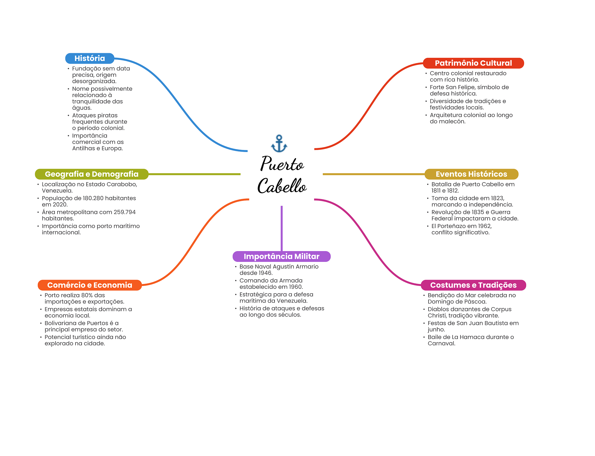História Patrimônio Cultural Fundação sem data precisa, origem Centro colonial restaurado desorganizada. com rica história. Nome possivelmente Forte San Felipe, símbolo de relacionado à defesa histórica. tranquilidade das Diversidade de tradições e águas. festividades locais. Ataques piratas Arquitetura colonial ao longo frequentes durante do malecón. período colonial. Importância comercial com as Antilhas e Europa. Puerto Geografia e Demografia Eventos Históricos Localização no Estado Carabobo, Cabello Batalla de Puerto Cabello em Venezuela. 1811 e 1812. População de 180.280 habitantes Toma da cidade em 1823, em 2020. marcando a independência. Área metropolitana com 259.794 Revolução de 1835 e Guerra habitantes. Federal impactaram a cidade. Importância como porto marítimo El Porteñazo em 1962, internacional. conflito significativo. Importância Militar Base Naval Agustín Armario desde 1946. Comando da Armada Comércio e Economia estabelecido em 1960. Costumes e Tradições Porto realiza 80% das Estratégica para a defesa Bendição do Mar celebrada no importações e exportações. marítima da Venezuela. Domingo de Páscoa. Empresas estatais dominam a História de ataques e defesas Diablos danzantes de Corpus economia local. ao longo dos séculos. Christi, tradição vibrante. Bolivariana de Puertos é a Festas de San Juan Bautista em principal empresa do setor. junho. Potencial turístico ainda não Baile de La Hamaca durante O explorado na cidade. Carnaval.