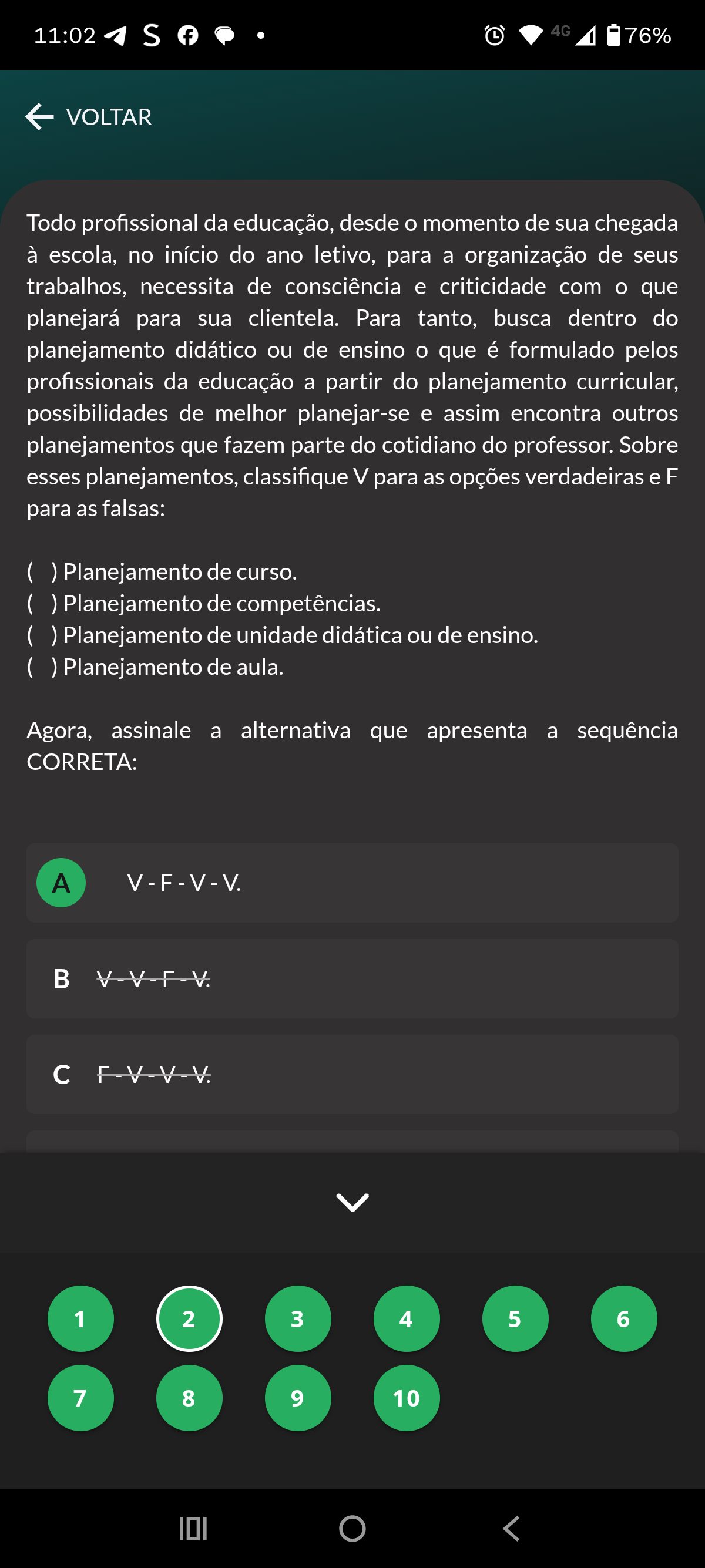 11:02 S f 4G 76% VOLTAR Todo profissional da educação, desde momento de sua chegada à escola, no início do ano letivo, para a organização de seus trabalhos, necessita de consciência e criticidade com o que planejará para sua clientela. Para tanto, busca dentro do planejamento didático ou de ensino que é formulado pelos profissionais da educação a partir do planejamento curricular, possibilidades de melhor planejar-se e assim encontra outros planejamentos que fazem parte do cotidiano do professor. Sobre esses planejamentos, classifique V para as opções verdadeiras e F para as falsas: ( ) Planejamento de curso. ( ) Planejamento de competências. Planejamento de unidade didática ou de ensino. Planejamento de aula. Agora, assinale a alternativa que apresenta a sequência CORRETA: A V-F-V-V. V-V-F-V. c F-V-V-V. 1 2 3 4 5 6 7 8 9 10