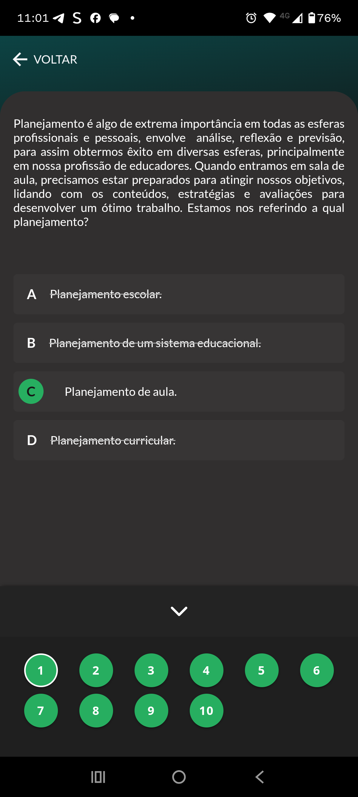 11:01 S f 4G 76% VOLTAR Planejamento é algo de extrema importância em todas as esferas profissionais e pessoais, envolve análise, reflexão e previsão, para assim obtermos êxito em diversas esferas, principalmente em nossa profissão de educadores. Quando entramos em sala de aula, precisamos estar preparados para atingir nossos objetivos, lidando com os conteúdos, estratégias e avaliações para desenvolver um ótimo trabalho. Estamos nos referindo a qual planejamento? Planejamento escolar. Planejamento de um sistema educacional. Planejamento de aula. D Planejamento curricular. 1 2 3 4 5 6 7 8 9 10