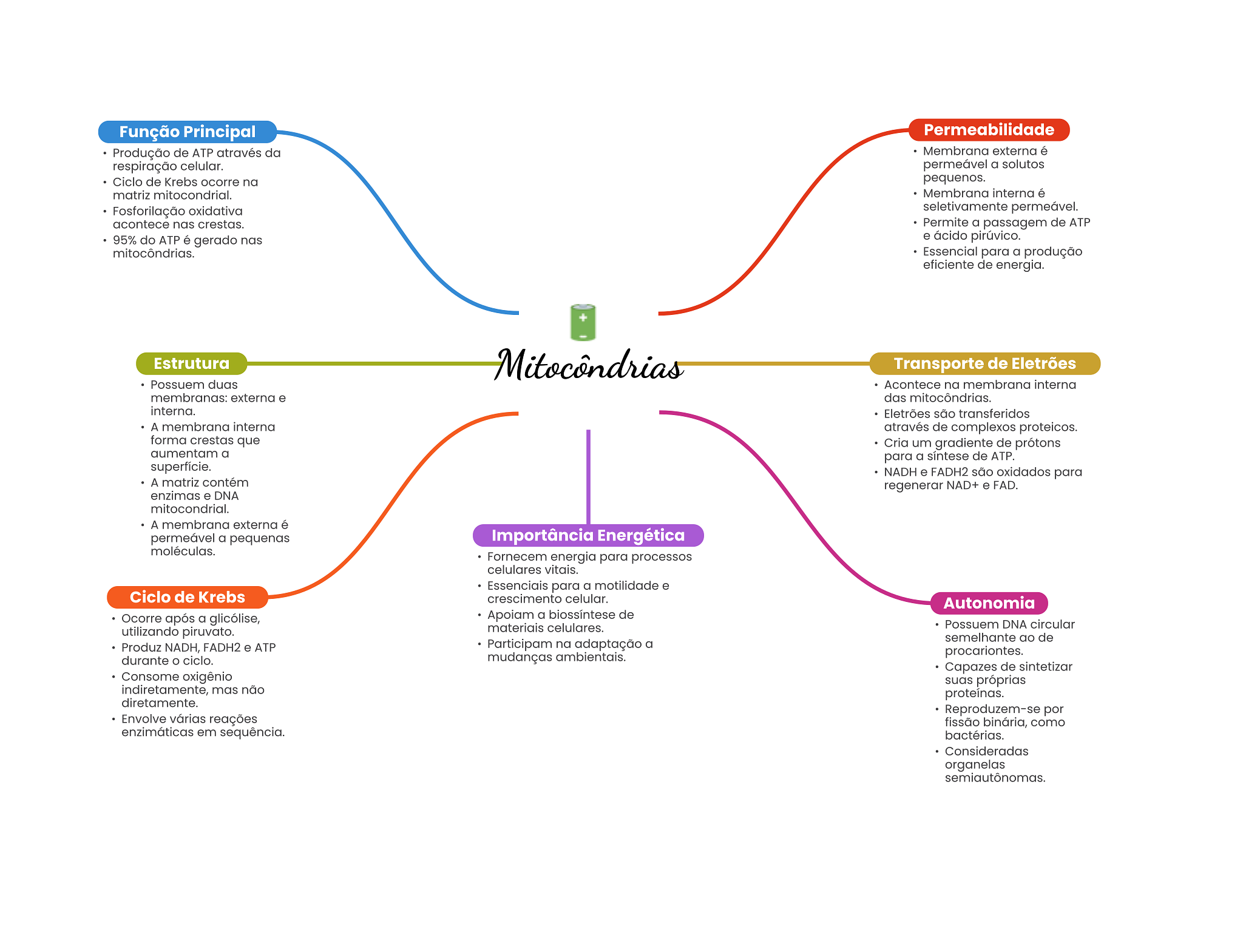 Função Principal Permeabilidade Produção de ATP através da Membrana externa é respiração celular. permeável a solutos Ciclo de Krebs ocorre na pequenos. matriz mitocondrial. Membrana interna é Fosforilação oxidativa seletivamente permeável. acontece nas crestas. Permite a passagem de ATP 95% do ATP é gerado nas e ácido pirúvico. mitocôndrias. Essencial para a produção eficiente de energia. Estrutura Transporte de Eletrões Possuem duas Acontece na membrana interna membranas: externa e das mitocôndrias. interna. Eletrões são transferidos A membrana interna através de complexos proteicos. forma crestas que Cria um gradiente de prótons aumentam a para a síntese de ATP. superfície. NADH e FADH2 são oxidados para A matriz contém regenerar NAD+ e FAD. enzimas e DNA mitocondrial. A membrana externa é permeável a pequenas Importância Energética moléculas. Fornecem energia para processos celulares vitais. Essenciais para a motilidade e Ciclo de Krebs crescimento celular. Autonomia Ocorre após a glicólise, Apoiam a biossíntese de utilizando piruvato. materiais celulares. Possuem DNA circular semelhante ao de Produz NADH, FADH2 e ATP Participam na adaptação a durante O ciclo. mudanças ambientais. procariontes. Capazes de sintetizar Consome oxigênio suas próprias indiretamente, mas não proteínas. diretamente. Reproduzem-se por Envolve várias reações fissão binária, como enzimáticas em sequência. bactérias. Consideradas organelas