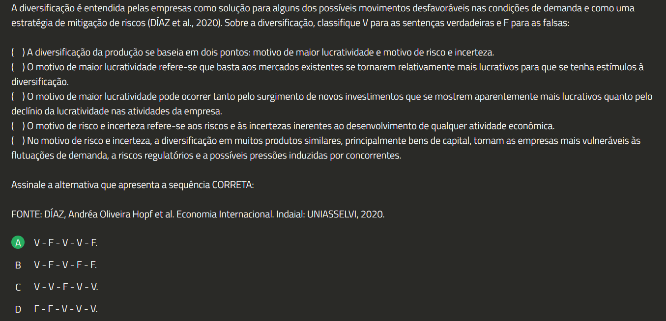 A diversificação é entendida pelas empresas como solução para alguns dos possíveis movimentos desfavoráveis nas condições de demanda e como uma estratégia de mitigação de riscos (DÍAZ et al., 2020). Sobre a diversificação, classifique V para as sentenças verdadeiras e F para as falsas: A diversificação da produção se baseia em dois pontos: motivo de maior lucratividade e motivo de risco e incerteza. 0 motivo de maior lucratividade refere-se que basta aos mercados existentes se tornarem relativamente mais lucrativos para que se tenha estímulos à diversificação. 0 motivo de maior lucratividade pode ocorrer tanto pelo surgimento de novos investimentos que se mostrem aparentemente mais lucrativos quanto pelo declínio da lucratividade nas atividades da empresa. ( ) 0 motivo de risco e incerteza refere-se aos riscos e às incertezas inerentes ao desenvolvimento de qualquer atividade econômica. No motivo de risco e incerteza, a diversificação em muitos produtos similares, principalmente bens de capital, tornam as empresas mais vulneráveis às flutuações de demanda, a riscos regulatórios e a possíveis pressões induzidas por concorrentes. Assinale a alternativa que apresenta a sequência CORRETA: FONTE: DÍAZ, Andréa Oliveira Hopf et al. Economia Internacional. Indaial: UNIASSELVI, 2020. A V-F-V-V-F. B V-F-V-F-F. V-V-F-V-V. D F-F-V-V-V.