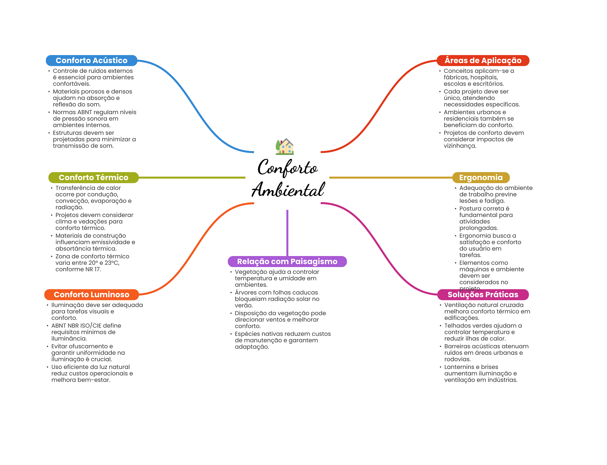 Conforto Acústico Áreas de Aplicação Controle de ruídos externos Conceitos aplicam-se a é essencial para ambientes fábricas, hospitais, confortáveis. escolas e escritórios. Materiais porosos e densos Cada projeto deve ser ajudam na absorção e único, atendendo reflexão do som. necessidades específicas. Normas ABNT regulam níveis Ambientes urbanos e de pressão sonora em residenciais também se ambientes internos. beneficiam do conforto. Estruturas devem ser Projetos de conforto devem projetadas para minimizar a considerar impactos de transmissão de som. vizinhança. Conforto Conforto Térmico Ergonomia Transferência de calor Ambiental Adequação do ambiente ocorre por condução, de trabalho previne convecção, evaporação e lesões e fadiga. radiação. Postura correta é Projetos devem considerar fundamental para clima e vedações para atividades conforto térmico. prolongadas. Materiais de construção Ergonomia busca a influenciam emissividade e satisfação e conforto absortância térmica. do usuário em Zona de conforto térmico tarefas. varia entre 20° e 23°C, Relação com Paisagismo Elementos como conforme NR 17. Vegetação ajuda a controlar máquinas e ambiente temperatura e umidade em devem ser ambientes. considerados no projeto Conforto Luminoso Árvores com folhas caducas Soluções Práticas bloqueiam radiação solar no deve ser adequada verão. Ventilação natural cruzada para tarefas visuais e Disposição da vegetação pode melhora conforto térmico em conforto. direcionar ventos e melhorar edificações. ABNT NBR ISO/CIE define conforto. Telhados verdes ajudam a requisitos mínimos de Espécies nativas reduzem custos controlar temperatura e iluminância. de manutenção e garantem reduzir ilhas de calor. Evitar ofuscamento e adaptação. Barreiras acústicas atenuam garantir uniformidade na ruídos em áreas urbanas e iluminação é crucial. rodovias. Uso eficiente da luz natural Lanternins e brises reduz custos operacionais e aumentam iluminação e melhora bem-estar. ventilação em indústrias.