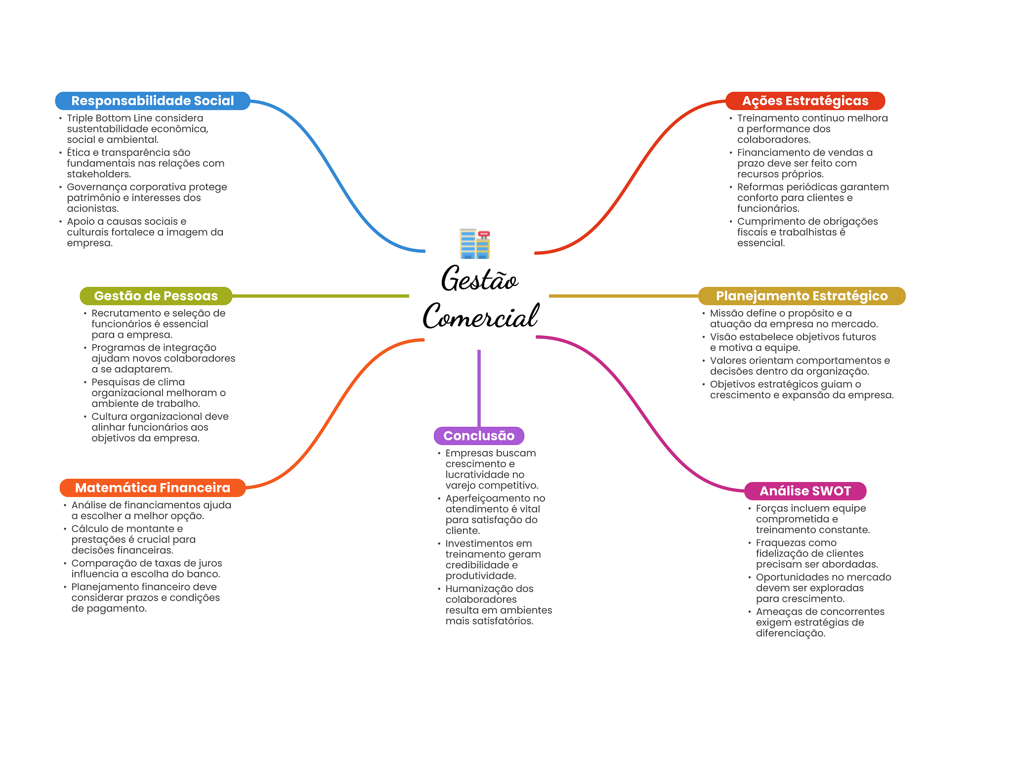 Responsabilidade Social Ações Estratégicas Triple Bottom Line considera Treinamento contínuo melhora sustentabilidade econômica, a performance dos social e ambiental. colaboradores. Ética e transparência são Financiamento de vendas a fundamentais nas relações com prazo deve ser feito com stakeholders. recursos próprios. Governança corporativa protege Reformas periódicas garantem patrimônio e interesses dos conforto para clientes e acionistas. funcionários. Apoio a causas sociais e Cumprimento de obrigações culturais fortalece a imagem da fiscais e trabalhistas é empresa. essencial. Gestão Gestão de Pessoas Planejamento Estratégico Recrutamento e seleção de funcionários é essencial Comercial Missão define propósito e a atuação da empresa no mercado. para a empresa. Visão estabelece objetivos futuros Programas de integração e motiva a equipe. ajudam novos colaboradores Valores orientam comportamentos e a se adaptarem. decisões dentro da organização. Pesquisas de clima Objetivos estratégicos guiam O organizacional melhoram crescimento e expansão da empresa. ambiente de trabalho. Cultura organizacional deve alinhar funcionários aos objetivos da empresa. Conclusão Empresas buscam crescimento e lucratividade no Matemática Financeira varejo competitivo. Análise SWOT Aperfeiçoamento no Análise de financiamentos ajuda atendimento é vital Forças incluem equipe a escolher a melhor opção. para satisfação do comprometida e Cálculo de montante e cliente. treinamento constante. prestações é crucial para Investimentos em Fraquezas como decisões financeiras. treinamento geram fidelização de clientes Comparação de taxas de juros credibilidade e precisam ser abordadas. influencia a escolha do banco. produtividade. Oportunidades no mercado Planejamento financeiro deve Humanização dos devem ser exploradas considerar prazos e condições colaboradores para crescimento. de pagamento. resulta em ambientes Ameaças de concorrentes mais satisfatórios. exigem estratégias de diferenciação.