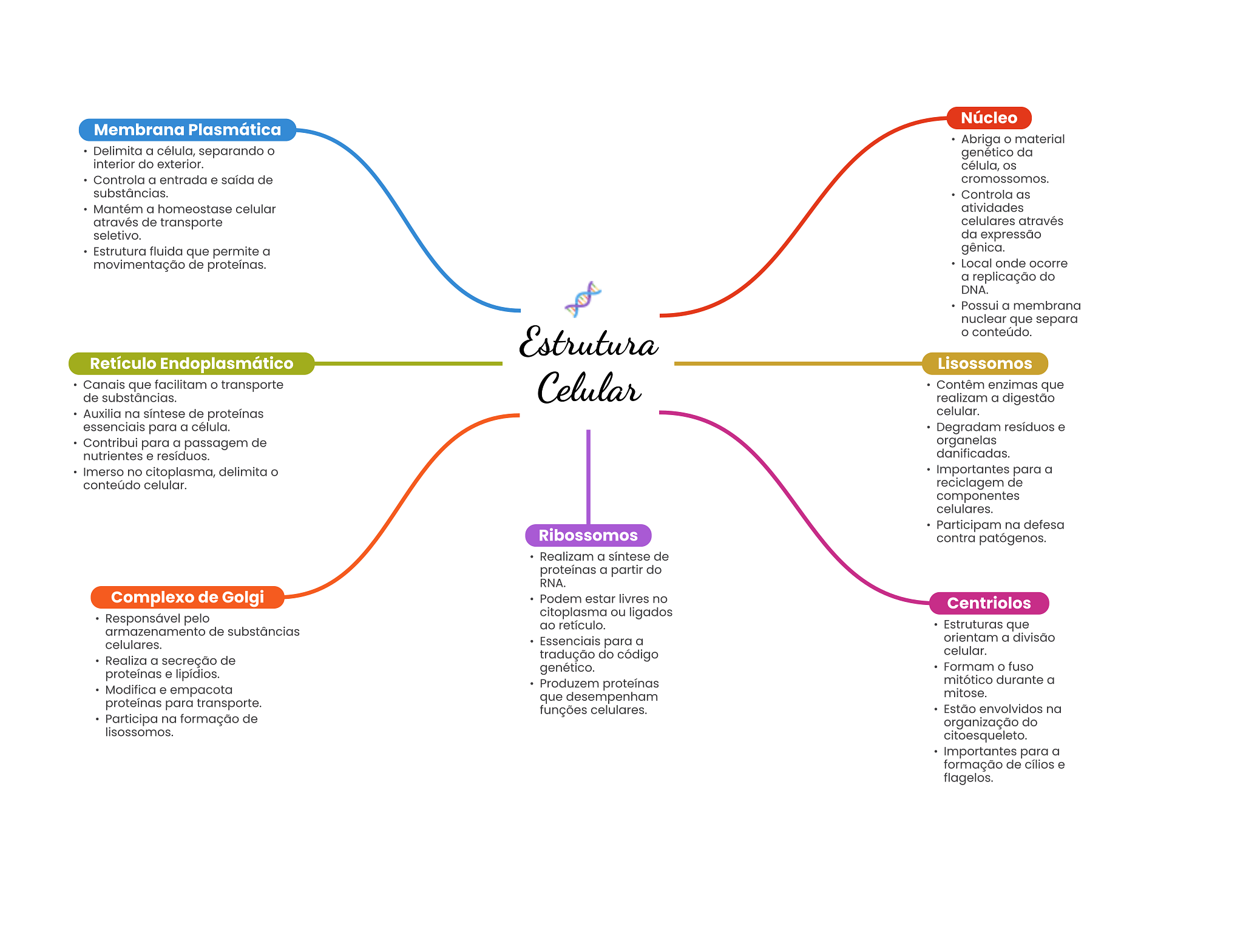 Núcleo Membrana Plasmática Abriga material Delimita a célula, separando genético da interior do exterior. célula, os Controla a entrada e saída de cromossomos. substâncias. Controla as Mantém a homeostase celular atividades através de transporte celulares através seletivo. da expressão Estrutura fluida que permite a gênica. movimentação de proteínas. Local onde ocorre a replicação do DNA. Possui a membrana nuclear que separa Estrutura conteúdo. Retículo Endoplasmático Lisossomos Canais que facilitam transporte de substâncias. Celular Contêm enzimas que realizam a digestão Auxilia na síntese de proteínas celular. essenciais para a célula. Degradam resíduos e Contribui para a passagem de organelas nutrientes e resíduos. danificadas. Imerso no citoplasma, delimita Importantes para a conteúdo celular. reciclagem de componentes celulares. Participam na defesa Ribossomos contra patógenos. Realizam a síntese de proteínas a partir do RNA. Complexo de Golgi Podem estar livres no Centriolos Responsável pelo citoplasma ou ligados ao retículo. armazenamento de substâncias Estruturas que celulares. Essenciais para a orientam a divisão tradução do código celular. Realiza a secreção de genético. Formam fuso proteínas e lipídios. Produzem proteínas mitótico durante a Modifica e empacota proteínas para transporte. que desempenham mitose. funções celulares. Estão envolvidos na Participa na formação de organização do lisossomos. citoesqueleto. Importantes para a formação de cílios e flagelos.