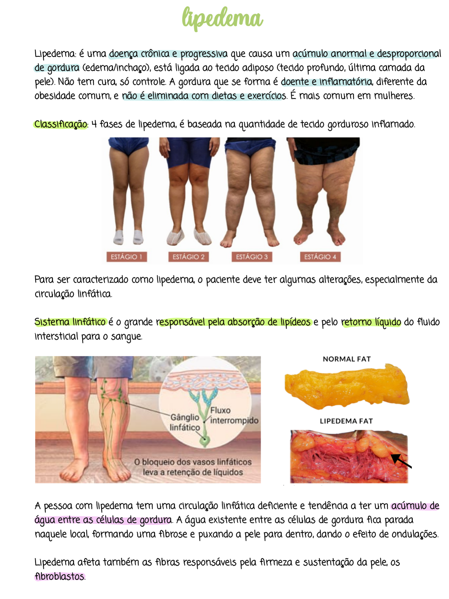 lipedema Lipedema: é uma doença crônica e progressiva que causa um acúmulo anormal e desproporcional de gordura (edema/inchaço), está ligada ao tecido adiposo (tecido profundo, última camada da pele). Não tem cura, controle. A gordura que se forma é doente e inflamatória, diferente da obesidade comum, e não é eliminada com dietas e exercícios. É mais comum em mulheres. Classificação: 4 fases de lipedema, é baseada na quantidade de tecido gorduroso inflamado. ESTÁGIO 1 ESTÁGIO 2 ESTÁGIO 3 ESTÁGIO 4 Para ser caracterizado como lipedema, paciente deve ter algumas alterações, especialmente da circulação linfática. Sistema linfático é grande responsável pela absorção de lipídeos e pelo retorno líquido do fluido intersticial para sangue. NORMAL FAT Fluxo Gânglio interrompido LIPEDEMA FAT linfático bloqueio dos vasos linfáticos leva a retenção de líquidos A pessoa com lipedema tem uma circulação linfática deficiente e tendência a ter um acúmulo de água entre as células de gordura. A água existente entre as células de gordura parada naquele local, formando uma fibrose e puxando a pele para dentro, dando efeito de ondulações. Lipedema afeta também as fibras responsáveis pela e sustentação da pele, fibroblastos.lipedema e lipedema é uma condição específica que afeta a distribuição de gordura no corpo, e não está diretamente relacionado ao peso corporal total. RESISTENTE À DIETA RESPONDE À DIETA E EXERCÍCIOS E EXERCÍCIOS PARTE SUPERIOR PARTE SUPERIOR MAIS FINA IGUALMENTE CHEIA BRAÇOS PODEM BRAÇOS SER AFETADOS NÃO AFETADOS DOR AUSÊNCIA GENERALIZADA DE DOR HEMATOMAS AUSÊNCIA DE SEM EXPLICAÇÃO HEMATOMAS JOELHOS JOELHOS VOLUMOSOS VISÍVEIS NÓDULOS DUROS AUSÊNCIA DE NÓDULOS TORNOZELOS INCHADOS TORNOZELOS BEM E DOLORIDOS FORMADOS E AFINADOS cirurgia é a única opção detratamento? Não. Existem tratamentos conservadores eflcazes, como a associação de terapia de compressão, dieta adequada, exercícios e drenagem. meias de compressão: Podem ajudar a reduzir inchaço e melhorar a circulação, aliviando sintomas. papel da dieta: Uma dieta anti inflamatória ajuda Beterraba Açafrão Folhas verdes Mirtilos Salmão a controlar sintomas e manter um peso saudável. Brócolis Aipo Nozes castanhas Repolho chinês Abacaxi Gengibre Linhaça Semente de chia Óleo de Caldo de ossolipedema obesidade Joelho varo (desvio para fora). Joelho valgo (desvio para dentro). Ausência das "bananinhas" Presença de "bananinhas" de Sinal de garrote: presença de depressão gordura) na face interna das coxas. na transição entre tornozelo e pé - Adipose distribuída de forma mais uniforme. característico e diagnóstico. Possui resposta melhor à dieta e exercícios. Sinal de cacifo: pode estar presente (mas é mais comum no linfedema). Afeta geralmente ambos membros linfedema inferiores, de forma simétrica, com Geralmente unilateral. preservação dos pés. Início gradual, com inchaço visível e progressivo. Não responde bem à dieta ou exercícios Pode apresentar sinal de cacifo positivo. isoladamente. Causado por acúmulo de linfa no tecido subcutâneo. Dor ao toque, hematomas frequentes e Presença de espessamento da pele em estágios mais sensação de peso. avançados. Lipedema Obesidade Linfedema tratamento lipedema: Lipedema Tipo 1 e 2: Casos iniciais podem ser tratados exclusivamente por fisioterapeutas. mais avançados requerem equipe multidisciplinar. Avaliar grau de inflamação (palpação, dor, fibroses). Intervenção lipolítica inicial Drenagem linfática manual 2x por semana Exercício aeróbico leve melhora retorno linfático e queima de gordura Hidroterapia indicada para aliviar peso articular e facilitar movimentos. Endermologia / Vacuoterapia: Sucção leve e cuidadosa notar vermelhidão, trocar de área para não danificar O tecido.ultrassom: Ultrassom cavitacional: excelente efeito anti-inflamatório. Frequência: 10 a 30 Hz 10 Hz: estimula liberação de (ação lipolítica). 30 Hz: melhora flacidez e promove drenagem. Cabeçote: 1 MHz adipometria > 2,5 cm. 3 MHz adipometria