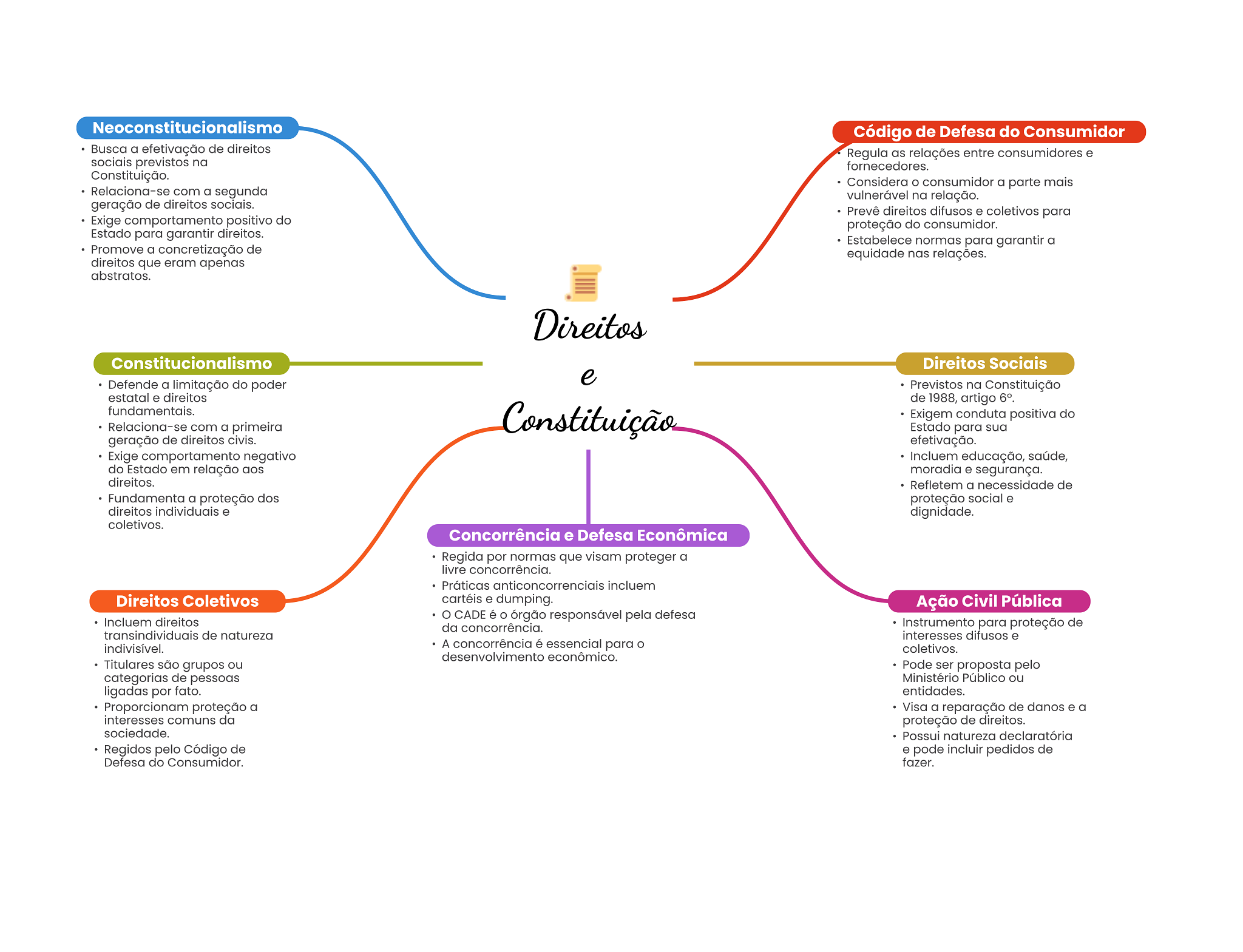 Neoconstitucionalismo Código de Defesa do Consumidor Busca a efetivação de direitos Regula as relações entre consumidores e sociais previstos na fornecedores. Constituição. Considera O consumidor a parte mais Relaciona-se com a segunda vulnerável na relação. geração de direitos sociais. Prevê direitos difusos e coletivos para Exige comportamento positivo do proteção do consumidor. Estado para garantir direitos. Estabelece normas para garantir a Promove a concretização de equidade nas relações. direitos que eram apenas abstratos. Direitos Constitucionalismo Direitos Sociais e Defende a limitação do poder Previstos na Constituição estatal e direitos de 1988, artigo 6°. fundamentais. Relaciona-se com a primeira Constituição Exigem conduta positiva do Estado para sua geração de direitos civis. efetivação. Exige comportamento negativo Incluem educação, saúde, do Estado em relação aos moradia e segurança. direitos. Refletem a necessidade de Fundamenta a proteção dos proteção social e direitos individuais e dignidade. coletivos. Concorrência e Defesa Econômica Regida por normas que visam proteger a livre concorrência. Práticas anticoncorrenciais incluem Direitos Coletivos cartéis e dumping. Ação Civil Pública CADE é O órgão responsável pela defesa Incluem direitos da concorrência. Instrumento para proteção de transindividuais de natureza interesses difusos e indivisível. A concorrência é essencial para O coletivos. desenvolvimento econômico. Titulares são grupos ou Pode ser proposta pelo categorias de pessoas Ministério Público ou ligadas por fato. entidades. Proporcionam proteção a Visa a reparação de danos e a interesses comuns da proteção de direitos. sociedade. Possui natureza declaratória Regidos pelo Código de e pode incluir pedidos de Defesa do Consumidor. fazer.