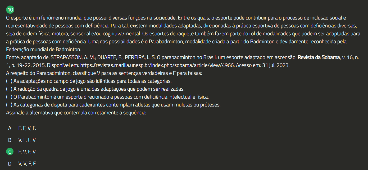 10 0 esporte é um fenômeno mundial que possui diversas funções na sociedade. Entre quais, 0 esporte pode contribuir para 0 processo de inclusão social e representatividade de pessoas com deficiência. Para tal, existem modalidades adaptadas, direcionadas à prática esportiva de pessoas com deficiências diversas, seja de ordem física, motora, sensorial e/ou cognitiva/mental. Os esportes de raquete também fazem parte do rol de modalidades que podem ser adaptadas para a prática de pessoas com deficiência. Uma das possibilidades é Parabadminton, modalidade criada a partir do Badminton e devidamente reconhecida pela Federação mundial de Badminton. Fonte: adaptado de: STRAPASSON, M.; DUARTE, E.; PEREIRA, L.S. 0 parabadminton no Brasil: um esporte adaptado em ascensão. Revista da Sobama, V. 16, n. 1, 19-22, 2015. Disponível em: Acesso em: 31 jul. 2023. A respeito do Parabadminton, classifique V para as sentenças verdadeiras e F para falsas: As adaptações no campo de jogo são idênticas para todas as categorias. A redução da quadra de jogo é uma das adaptações que podem ser realizadas. 0 Parabadminton é um esporte direcionado à pessoas com deficiência intelectual e física. As categorias de disputa para cadeirantes contemplam atletas que usam muletas ou próteses. Assinale a alternativa que contempla corretamente a sequência: A F,F,V,F. B V,F,F,V. F,V,F,V. D V,V,F,F.