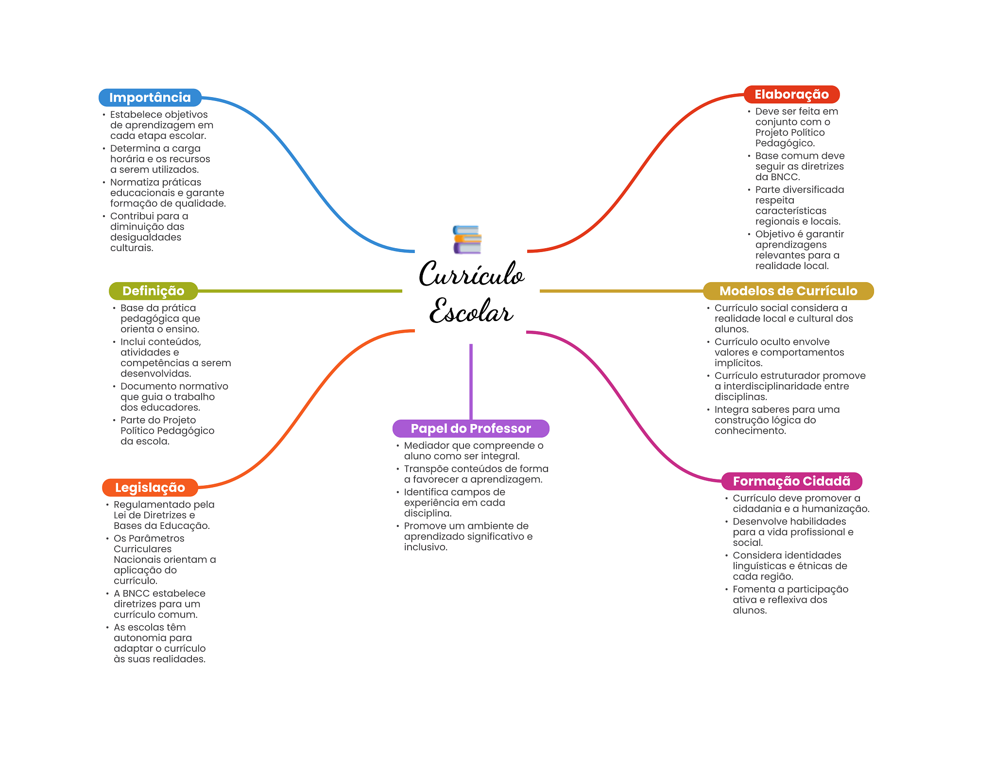 Importância Elaboração Estabelece objetivos Deve ser feita em de aprendizagem em conjunto com cada etapa escolar. Projeto Político Determina a carga Pedagógico. horária e os recursos Base comum deve a serem utilizados. seguir as diretrizes da BNCC. Normatiza práticas educacionais e garante Parte diversificada formação de qualidade. respeita características Contribui para a diminuição das regionais e locais. desigualdades Objetivo é garantir culturais. aprendizagens relevantes para a Currículo realidade local. Definição Modelos de Currículo Base da prática pedagógica que Escolar Currículo social considera a realidade local e cultural dos orienta ensino. alunos. Inclui conteúdos, Currículo oculto envolve atividades e valores e comportamentos competências a serem implícitos. desenvolvidas. Currículo estruturador promove Documento normativo a entre que guia trabalho disciplinas. dos educadores. Integra saberes para uma Parte do Projeto construção lógica do Político Pedagógico Papel do Professor conhecimento. da escola. Mediador que compreende aluno como ser integral. Transpõe conteúdos de forma a favorecer a aprendizagem. Legislação Formação Cidadã Identifica campos de Regulamentado pela experiência em cada Currículo deve promover a disciplina. cidadania e a humanização. Lei de Diretrizes e Desenvolve habilidades Bases da Educação. Promove um ambiente de aprendizado significativo e para a vida profissional e Os Parâmetros social. Curriculares inclusivo. Nacionais orientam a Considera identidades aplicação do linguísticas e étnicas de currículo. cada região. A BNCC estabelece Fomenta a participação diretrizes para um ativa e reflexiva dos currículo comum. alunos. As escolas têm autonomia para adaptar currículo às suas realidades.
