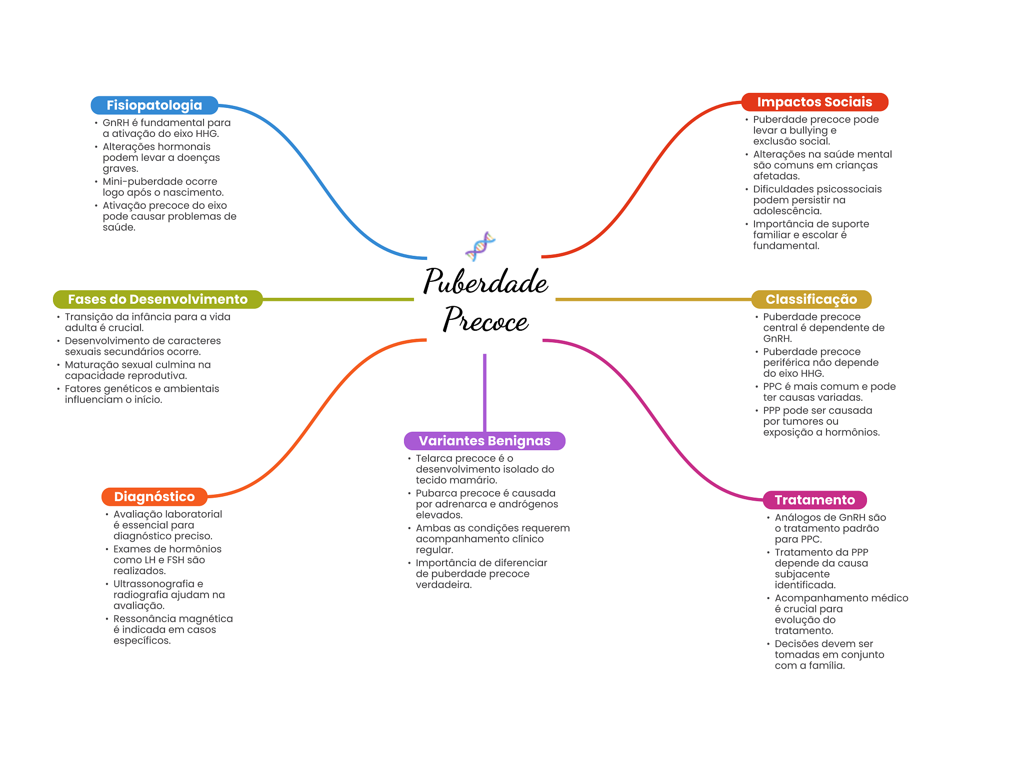 Fisiopatologia Impactos Sociais GnRH é fundamental para Puberdade precoce pode a ativação do eixo HHG. levar a bullying e exclusão social. Alterações hormonais podem levar a doenças Alterações na saúde mental graves. são comuns em crianças afetadas. Mini-puberdade ocorre logo após nascimento. Dificuldades psicossociais Ativação precoce do eixo podem persistir na adolescência. pode causar problemas de saúde. Importância de suporte familiar e escolar é fundamental. Puberdade Fases do Desenvolvimento Classificação Transição da infância para a vida Precoce Puberdade precoce adulta é crucial. central é dependente de Desenvolvimento de caracteres GnRH. sexuais secundários ocorre. Puberdade precoce Maturação sexual culmina na periférica não depende capacidade reprodutiva. do eixo HHG. Fatores genéticos e ambientais PPC é mais comum e pode influenciam início. ter causas variadas. PPP pode ser causada por tumores ou exposição a hormônios. Variantes Benignas Telarca precoce é O desenvolvimento isolado do tecido mamário. Diagnóstico Pubarca precoce é causada por adrenarca e andrógenos Tratamento Avaliação laboratorial elevados. Análogos de GnRH são é essencial para Ambas as condições requerem tratamento padrão diagnóstico preciso. acompanhamento clínico para PPC. Exames de hormônios regular. Tratamento da PPP como LH e FSH são Importância de diferenciar depende da causa realizados. de puberdade precoce subjacente Ultrassonografia e verdadeira. identificada. radiografia ajudam na Acompanhamento médico avaliação. é crucial para Ressonância magnética evolução do é indicada em casos tratamento. específicos. Decisões devem ser tomadas em conjunto com a familia.