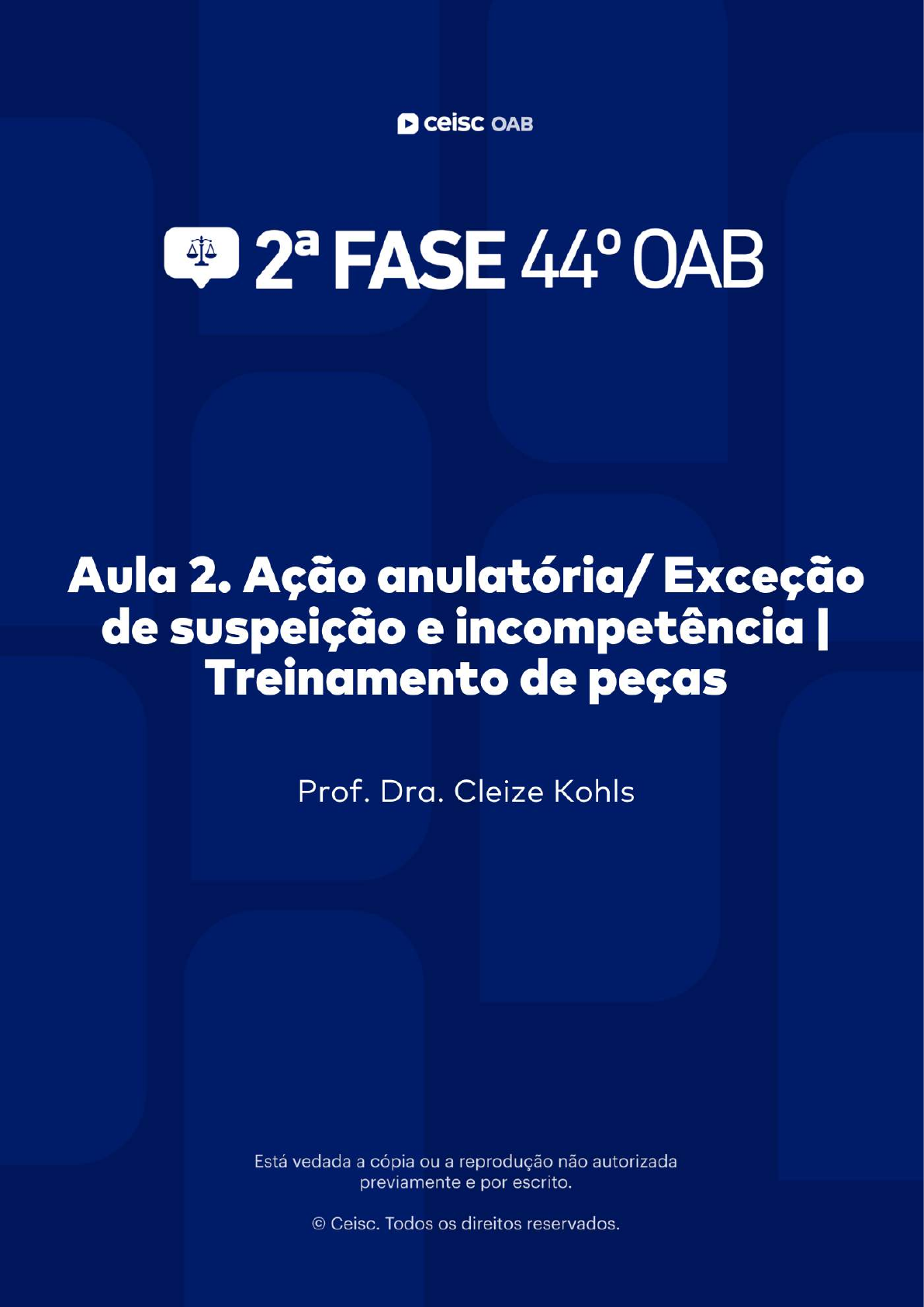 2ª Fase de Trabalho | 44º Exame de Ordem E-book Treinamento de Peças Autorais 1 2ª Fase de Trabalho | 44º Exame de Ordem E-book Treinamento de Peças Autorais 2 Olá, pessoal! Tudo bem? Parabéns, você está na segunda fase! Significa que você já percorreu uma boa parte do caminho. Nesse E-book vocês encontrarão as peças autorais que iremos resolver ao vivo na aula do dia: • 02/07: 2. Ação anulatória/ Exceção de suspeição e incompetência | Treinamento de peças. Espero que ele lhe seja útil. Estaremos juntos e tudo vai dar certo. Não esqueça que sua dedicação será recompensada. A sensação de ver o nome na lista não tem preço! Respira... Não pira... E olhe os artigos! Prof.ª Cleize | @prof.cleizekohls 2ª Fase de Trabalho | 44º Exame de Ordem E-book Treinamento de Peças Autorais 3 2ª FASE OAB | TRABALHO | 44º EXAME Treinamento de Peças Autorais Prof. Cleize Kohls SUMÁRIO Aula 02. Ação anulatória/ Exceção de suspeição e incompetência | Treinamento de peças............................................................................................................................................4 Ação Anulatória...........................................................................................................................4 Treinamento de Peça – Enunciado 1....................................................................................... 6 Resolução da Peça Prático – Profissional..........................................................................8 Exceções de suspeição, impedimento e competência...........................................................10 Treinamento de Peça – Enunciado 2........................................................................................14 Resolução da Peça Prático – Profissional...........................................................................16 Treinamento de Peça – Enunciado 3........................................................................................18 Resolução da Peça Prático – Profissional...........................................................................20 Olá, aluno(a). Este material de apoio foi organizado com base nas aulas do curso preparatório para a 2ª Fase do 44º Exame da OAB e deve ser utilizado como um roteiro para as respectivas aulas. Além disso, recomenda-se que o aluno assista as aulas acompanhado da legislação pertinente. Bons estudos, Equipe Ceisc. Atualizado em junho de 2025. 2ª Fase de Trabalho | 44º Exame de Ordem E-book Treinamento de Peças Autorais 4 Aula 02. Ação anulatória/ Exceção de suspeição e incompetência | Treinamento de peças Aula prevista para ocorrer ao vivo no dia 02/07/2025 1. Ação Anulatória Cabe quando se pretende a invalidação de um ato jurídico que não observou os requisitos de validade (art. 104 do CC), e também os atos praticados pelas partes no processo, mas que não sejam atos decisórios propriamente ditos. A ação anulatória busca desconstituir atos, pois eivados de vícios. São casos de cabimento: - De cláusula de convenção coletiva - De auto de infração - Atos de disposição de direitos homologados me juízo 1.1 Legitimidade: - Empregado e o empregador - ineficácia de cláusulas convencionadas - se houver vício de vontade ou defeito do negócio jurídico nos termos dos arts. 138 a 157 do Código Civil. - Ministério Público do Trabalho - art. 83 IV, LC 75/1993. 1.2 O que diz a legislação: No CPC: Art. 966, § 4º Os atos de disposição de direitos, praticados pelas partes ou por outros participantes do processo e homologados pelo juízo, bem como os atos homologatórios praticados no curso da execução, estão sujeitos à anulação, nos termos da lei. Na CLT, o Art. 611-A diz que: § 2º A inexistência de expressa indicação de contrapartidas recíprocas em convenção coletiva ou acordo coletivo de trabalho não ensejará sua nulidade por não caracterizar um vício do negócio jurídico. 2ª Fase de Trabalho | 44º Exame de Ordem E-book Treinamento de Peças Autorais 5 § 3º Se for pactuada cláusula que reduza o salário ou a jornada, a convenção coletiva ou o acordo coletivo de trabalho deverão prever a proteção dos empregados contra dispensa imotivada durante o prazo de vigência do instrumento coletivo. § 4º Na hipótese de procedência de ação anulatória de cláusula de convenção coletiva ou de acordo coletivo de trabalho, quando houver a cláusula compensatória, esta deverá ser igualmente anulada, sem repetição do indébito. § 5º da CLT. Os sindicatos subscritores de convenção coletiva ou de acordo coletivo de trabalho deverão participar, como litisconsortes necessários, em ação individual ou coletiva, que tenha como objeto a anulação de cláusulas desses instrumentos. A lei 6830/80 estabelece que: Art. 38 - A discussão judicial da Dívida Ativa da Fazenda Pública só é admissível em execução, na forma desta Lei, salvo as hipóteses de mandado de segurança, ação de repetição do indébito ou ação anulatória do ato declarativo da dívida, esta precedida do depósito preparatório do valor do débito, monetariamente corrigido e acrescido dos juros e multa de mora e demais encargos Orientação Jurisprudencial - OJ n. 129 do SDI2 do TST: Em se tratando de ação anulatória, a competência originária se dá no mesmo juízo em que praticado o ato supostamente eivado de vício. Exemplos – casos reconhecidos na jurisprudência: 1. Nulidade do auto de infração. lavratura fora do local de inspeção e fora do prazo. descumprimento da disposição contida no artigo 629, § 1º, da CLT. dupla visita. 2. Ação anulatória de auto de infração. dupla punição pelo mesmo fato gerador. nulidade verificada. 3. Ação anulatória. multa aplicada pela fiscalização do trabalho. auto de infração lavrado sem data, hora e assinatura do fiscal do trabalho. 4. Ação anulatória de auto de 
