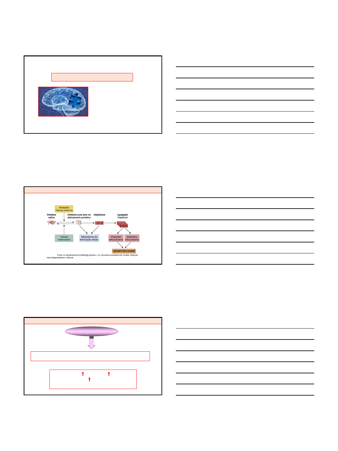 30/03/2025 1 DISTÚRBIOS NEURODEGENERATIVOS • DOENÇA DE PARKINSON • DOENÇA DE ALZHEIMER Doenças neurodegenerativas estão associadas a dobramentos proteicos errados. DISTÚRBIOS NEURODEGENERATIVOS Fonte: Adaptado de Rang & Dale: Farmacologia / H. P. Rang ... [et. al.]. 8. ed. - Rio de Janeiro : Elsevier, 2016. NEURODEGENERAÇÃO Perda progressiva e irreversível dos neurônios localizados em regiões específicas do cérebro. • Excitotoxicidade ( de glutamato e de Cálcio) • Estresse oxidativo ( radicais livres) • Apoptose (morte celular com ativação de proteases) DISTÚRBIOS NEURODEGENERATIVOS 1 2 3 30/03/2025 2 Doença de Parkinson (DP) – 3% da população com mais de 65 anos Doença de Alzheimer (DA) – cerca de 5% da população aos 65 anos e cerca de 90% ou mais aos 90 anos. • Patologias crônicas de desenvolvimento lento. • Pequena pré-disposição genética. • Etiologia: erros no dobramento de proteínas fisiológicas que tendem a agregar-se no SNC formando depósitos neurotóxicos. • Terapêutica: compensação da perda neuronal. DISTÚRBIOS NEURODEGENERATIVOS ➢ Encolhimento do cérebro e perda localizada de neurônios, principalmente no HIPOCAMPO E NA PARTE BASAL DO PROSENCÉFALO. ➢ Perda de NEURÔNIOS COLINÉRGICOS NO HIPOCAMPO E NO CÓRTEX FRONTAL: característica da doença (embora alterações em muitos sistemas transmissores). PATOGÊNESE DISTÚRBIOS NEURODEGENERATIVOS – DOENÇA DE ALZHEIMER SADIO DA CÉREBRO PATOGÊNESE DISTÚRBIOS NEURODEGENERATIVOS – DOENÇA DE ALZHEIMER • Dois aspectos microscópicos são característicos da doença: ➢ Placas amiloides extracelulares: depósitos extracelulares amorfos da proteína β- amiloide (conhecida como Aβ) ➢ Aglomerados neurofibrilares intraneuronais: filamentos de uma forma fosforilada de uma proteína associada ao microtúbulo (Tau). PLACAS SENIS Acúmulo de proteína beta (placas senis) EMARANHADOS DE NEUROFIBRILAS 4 5 6 30/03/2025 3 DISTÚRBIOS NEURODEGENERATIVOS – DOENÇA DE ALZHEIMER • As placas amiloides consistem em agregados de fragmentos Aβ do precursor da proteína amiloide (PPA), uma proteína normal da membrana neuronal, produzida pela ação das β e γ- secretases. • A DA está associada à formação excessiva de Aβ, resultando em neurotoxicidade. • A DA familial (rara) resulta de mutações no gene PPA ou nos genes da pré-senilina (envolvidos na função da γ-secretase), ambos causando aumento da formação de Aβ. • Mutações na lipoproteína ApoE4 aumentam o risco de desenvolvimento de DA, provavelmente por interferirem na depuração de Aβ. • Os agregados neurofibrilares compreendem agregados intracelulares de uma forma altamente fosforilada de uma proteína neuronal normal (Tau). A Tau hiperfosforilada e a Aβ atuam sinergicamente para causar a neurodegeneração. • Acredita-se que a perda de neurônios colinérgicos responda por muitas das deficiências de aprendizado e da memória na DA. Fonte: Adaptado de Rang & Dale: Farmacologia / H. P. Rang ... [et. al.]. 8. ed. - Rio de Janeiro : Elsevier, 2016. • Prevalência aumenta com a idade. • Prejuízo da memória recente e preservação da memória distante. • Comprometimento em utilizar objetos e instrumentos comuns. • Diminuição geral do tecido cerebral. • Morte: geralmente devido à complicações da imobilidade, como pneumonia e embolia pulmonar. DISTÚRBIOS NEURODEGENERATIVOS – DOENÇA DE ALZHEIMER • “A atividade da acetilcolinatransferase, o conteúdo de acetilcolina e o transporte de acetilcolinesterase e de colina no córtex e no hipocampo estão consideravelmente reduzidos na DA • A densidade dos receptores muscarínicos não está afetada, porém os receptores nicotínicos, particularmente no córtex, estão reduzidos. • A razão para a perda seletiva dos neurônios colinérgicos resultante da formação de Aβ não é conhecida. DISTÚRBIOS NEURODEGENERATIVOS – DOENÇA DE ALZHEIMER • Hipótese colinérgica” – perda de neurônios colinérgicos: deficiência cognitiva e perda de memória. Fonte: Adaptado de Rang & Dale: Farmacologia / H. P. Rang ... [et. al.]. 8. ed. - Rio de Janeiro : Elsevier, 2016. 7 8 9 30/03/2025 4 • Repetição da mesma pergunta várias vezes. • Falta de memória para acontecimentos recentes. • Dificuldade para dirigir automóvel e encontrar caminhos conhecidos. • Irritabilidade, agressividade, passividade, tendência ao isolamento. DISTÚRBIOS NEURODEGENERATIVOS – DOENÇA DE ALZHEIMER • Estágio 1 (forma inicial): Alterações na memória, personalidade e nas habilidades visuais e espaciais. • Estágio 2 (forma moderada): Dificuldade para falar, realizar tarefas simples e coordenar movimentos; agitação e insônia. • Estágio 3 (forma grave): Resistência à execução de tarefas diárias; incontinência urinária e fecal; dificuldade para comer; deficiência motora progressiva. • Estágio 4 (terminal): Restrição ao leito; dor à deglutição; infecções intercorrentes. DISTÚRBIOS NEURODEGENERATIVOS – DOENÇA DE ALZHEIMER TERAPÊUTICA INIBIDORES DA ENZIMA ACETILCOLINESTERASE (ACHE) BENEFÍCIO SINTOMÁTICO: MELHORA COGNITIVA Usados na doença de Alzheimer de leve a moderada. • TACRINA ➢ Hepatoxicidade; ➢ Cólicas abdominais, diarreia; ➢ Náuseas, vômitos; ➢ Anorexia • RIVASTIGMINA, GALANTAMINA E DONEPEZILA (T1/2 longa). ➢ efeitos colaterais menos graves e frequentes do que os observados com a Tacrina. DISTÚRBIOS NEURODEGENERATIVOS – DOENÇA DE ALZHEIMER 10 11 12 30/03/2025 5 RIVASTIGMINA ➢ Reações adversas •Muito comuns (ocorre em mais de 10% dos pacientes que utilizam este medicamento): se sentir enjoado (reações gastrintestinais tais como náusea), vômito, diarreia, tontura e perda de apetite. •Comuns (ocorre entre 1% e 10% dos pacientes que utilizam este medicamento): agitação, confusão, ansiedade, dor de cabeça, sonolência, dores de estômago, desconforto no estômago após as 