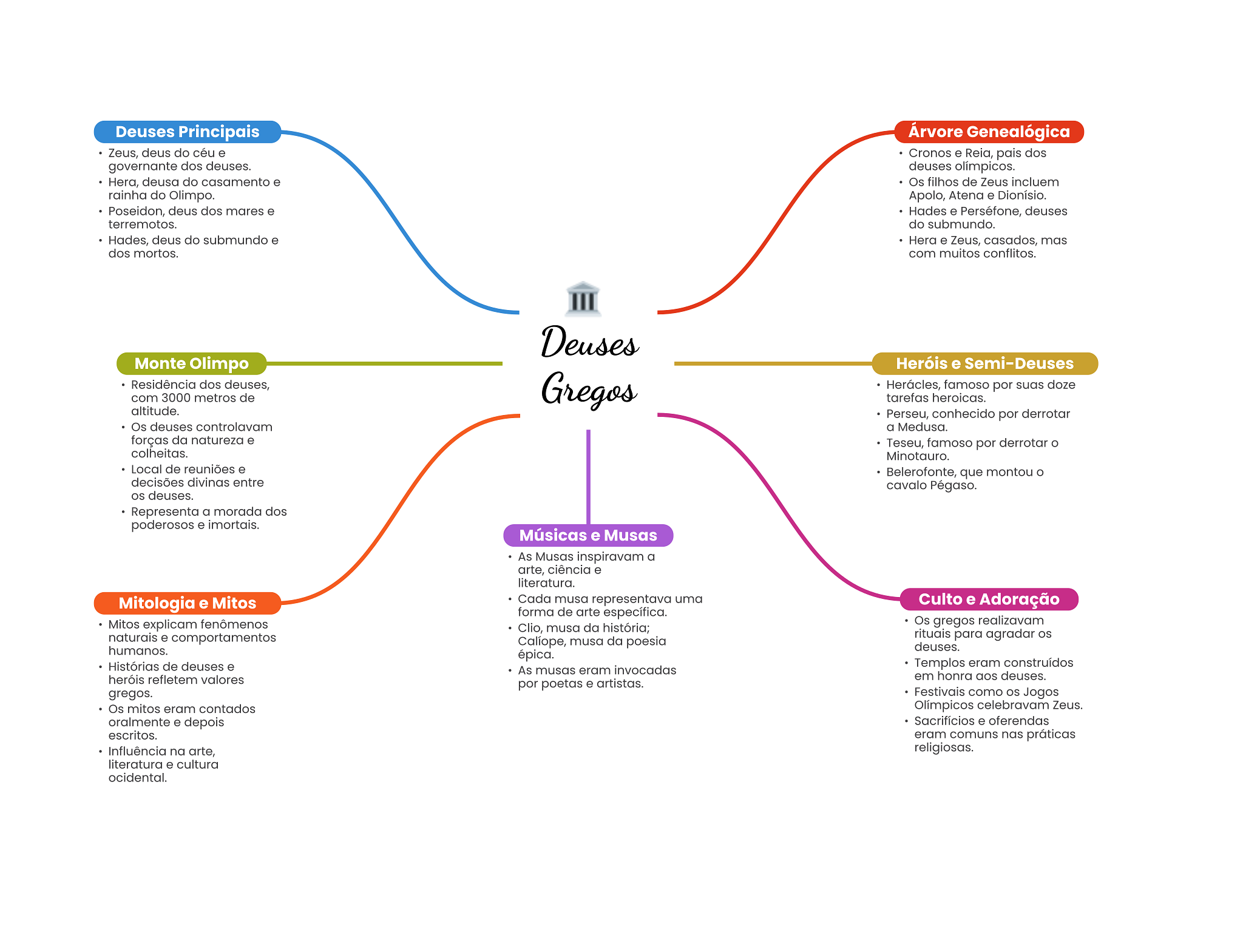 Deuses Principais Árvore Genealógica Zeus, deus do céu e Cronos e Reia, pais dos governante dos deuses. deuses olímpicos. Hera, deusa do casamento e Os filhos de Zeus incluem rainha do Olimpo. Apolo, Atena e Dionísio. Poseidon, deus dos mares e Hades e Perséfone, deuses terremotos. do submundo. Hades, deus do submundo e Hera e Zeus, casados, mas dos mortos. com muitos conflitos. Deuses Monte Olimpo Heróis e Semi-Deuses Residência dos deuses, com 3000 metros de Gregos Herácles, famoso por suas doze tarefas heroicas. altitude. Perseu, conhecido por derrotar Os deuses controlavam a Medusa. forças da natureza e Teseu, famoso por derrotar colheitas. Minotauro. Local de reuniões e Belerofonte, que montou decisões divinas entre cavalo Pégaso. OS deuses. Representa a morada dos poderosos e imortais. Músicas e Musas As Musas inspiravam a arte, ciência e literatura. Mitologia e Mitos Cada musa representava uma Culto e Adoração forma de arte específica. Mitos explicam fenômenos Os gregos realizavam Clio, musa da história; naturais e comportamentos rituais para agradar OS Calíope, musa da poesia humanos. deuses. épica. Histórias de deuses e Templos eram construídos As musas eram invocadas heróis refletem valores em honra aos deuses. por poetas e artistas. gregos. Festivais como Jogos Os mitos eram contados Olímpicos celebravam Zeus. oralmente e depois Sacrifícios e oferendas escritos. eram comuns nas práticas Influência na arte, religiosas. literatura e cultura ocidental.