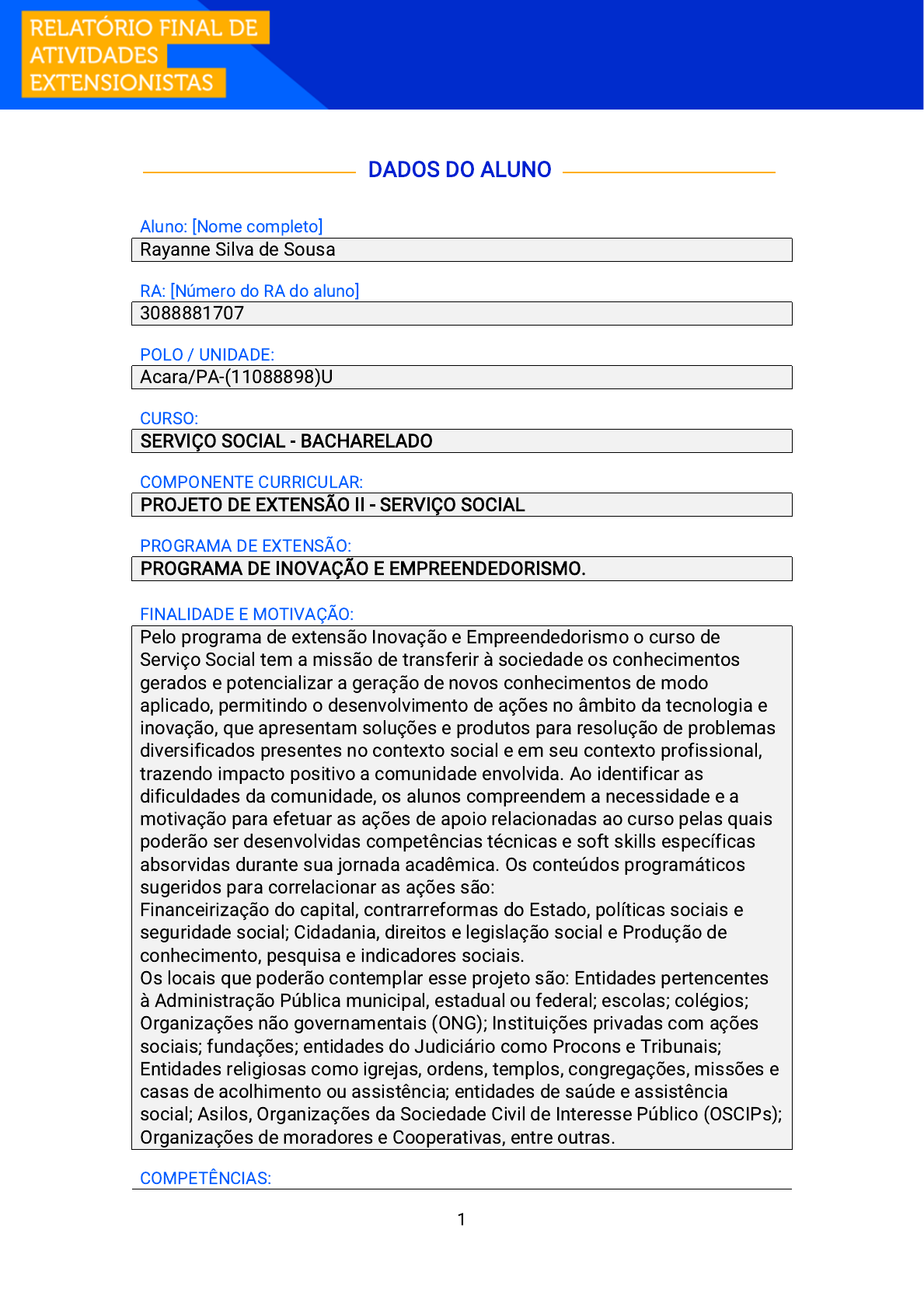 1 DADOS DO ALUNO: Aluno: [Nome completo] Rayanne Silva de Sousa RA: [Número do RA do aluno] 3088881707 POLO / UNIDADE: Acara/PA-(11088898)U CURSO: SERVIÇO SOCIAL - BACHARELADO COMPONENTE CURRICULAR: PROJETO DE EXTENSÃO II - SERVIÇO SOCIAL PROGRAMA DE EXTENSÃO: PROGRAMA DE INOVAÇÃO E EMPREENDEDORISMO. FINALIDADE E MOTIVAÇÃO: Pelo programa de extensão Inovação e Empreendedorismo o curso de Serviço Social tem a missão de transferir à sociedade os conhecimentos gerados e potencializar a geração de novos conhecimentos de modo aplicado, permitindo o desenvolvimento de ações no âmbito da tecnologia e inovação, que apresentam soluções e produtos para resolução de problemas diversificados presentes no contexto social e em seu contexto profissional, trazendo impacto positivo a comunidade envolvida. Ao identificar as dificuldades da comunidade, os alunos compreendem a necessidade e a motivação para efetuar as ações de apoio relacionadas ao curso pelas quais poderão ser desenvolvidas competências técnicas e soft skills específicas absorvidas durante sua jornada acadêmica. Os conteúdos programáticos sugeridos para correlacionar as ações são: Financeirização do capital, contrarreformas do Estado, políticas sociais e seguridade social; Cidadania, direitos e legislação social e Produção de conhecimento, pesquisa e indicadores sociais. Os locais que poderão contemplar esse projeto são: Entidades pertencentes à Administração Pública municipal, estadual ou federal; escolas; colégios; Organizações não governamentais (ONG); Instituições privadas com ações sociais; fundações; entidades do Judiciário como Procons e Tribunais; Entidades religiosas como igrejas, ordens, templos, congregações, missões e casas de acolhimento ou assistência; entidades de saúde e assistência social; Asilos, Organizações da Sociedade Civil de Interesse Público (OSCIPs); Organizações de moradores e Cooperativas, entre outras. COMPETÊNCIAS: 2 I - Planejar, negociar e executar projetos de cooperação e de internacionalização de diferentes tipos de organizações; II - Avaliar os reflexos da política e da economia internacionais sobre as dimensões nacional e regional; III - Utilizar instrumentalmente a língua inglesa. PERFIL DO EGRESSO: O perfil do egresso do curso de Serviço Social, idealizado pela IES proporciona a formação do profissional colaborativo e propositivo na mediação de conflitos, na busca de cooperação e na solução de problemas numa realidade diversificada e em transformação; analítico acerca de argumentos, de evidências, de discursos e de interpretações, com relação tanto a eventos e processos internacionais, quanto a abordagens, teorias e perspectivas em Relações Internacionais; diligente e criativo na pesquisa, na análise, na avaliação e na formulação de cenários e de projetos para atuação nas esferas nacional, regional e internacional. SOFT SKILLS (COMPETÊNCIAS SOCIOEMOCIONAIS): Análise e resolução de problemas Criatividade e inovação Liderança OBJETIVOS DE APRENDIZAGEM: O objetivo de aprendizagem do programa de extensão em Inovação e Empreendedorismo do curso de Serviço Social está relacionado ao fato de disseminar os conhecimentos multidisciplinares e transversais desenvolvidos no curso, com a finalidade de apoiar a comunidade no âmbito tecnológico, inovador e empreendedor explorando o Serviço Social, fomentando a geração de conhecimentos técnicos desenvolvidos nas ações e aprimorando das habilidades dos egressos. CONTEÚDOS: I - Financeirização do capital, contrarreformas do Estado, políticas sociais e seguridade social; II - Cidadania, direitos e legislação social; III - Produção de conhecimento, pesquisa e indicadores sociais. INDICAÇÕES BIBLIOGRÁFICAS: DORETO, Daniella Tech. [et al.]. Direitos humanos e legislação social. Porto Alegre: SAGAH, 2021. PAIVA, Maria Jeanne Gonzaga de...[et al.]. Capitalismo, trabalho e política social. São Paulo: Blucher, 2017. SAMPAIO, Helenara R.; KERNKAMP, Clarice da Luz. Indicadores sociais. Londrina: Editora e Distribuidora Educacional S.A., 2014. RELATÓRIO FINAL: 3 Aluno e Aluna, após realizar suas atividades de extensão, é necessário que você o formalize, enviando esse Relatório Final para ser avaliado junto ao seu Ambiente Virtual (AVA) e também para você poder comprovar sua atuação. Para o preenchimento, busque as anotações junto ao TEMPLATE PCDA para auxiliar na apresentação das atividades desenvolvidas. Todos os campos são de preenchimento obrigatório! DESCRIÇÃO DA AÇÃO COM RESULTADOS ALCANÇADOS Metas dos Objetivos de Desenvolvimento Sustentável (ODS) aderentes a este projeto: CAMPO OBRIGATÓRIO – busque no seu Template PDCA quais Metas você selecionou como aderentes ao seu projeto, conforme cada Objetivo de Desenvolvimento Sustentável (ODS) da Organização das Nações Unidas (ONU) que você explorou no seu planejamento. Liste as Metas selecionadas (pelo menos uma opção): ODS 16 - Paz, Justiça e Instituições Eficazes 16.7 Garantir a tomada de decisão responsiva, inclusiva, participativa e representativa em todos os níveis 16.9 Até 2030, fornece identidade legal para todos, incluindo o registro de nascimento 16.10 Assegurar o acesso público à informação e proteger as liberdades fundamentais, em conformidade com a legislação nacional e os acordos internacionais Local de realização da atividade extensionista: CAC- CENTRO DE ATENDIMENTO AO CIDADÃO Durante a ação: A execução do projeto foi dividida em três etapas teve como título o seguinte tema ouvir, intender e agir ao analisar a necessidade da população se chegou e elaboração desse projeto. Para você intender qual a necessidade de uma pessoa você tem que ouvi-la, mas não só isso também intender aquilo que se ouve para depois agir, o objetivo do projeto foi alcançar o máximo de pessoas possíveis e oferecer atendimento humani