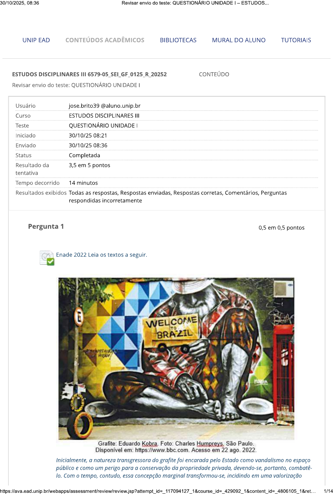 30/10/2025, 08:36 Revisar envio do teste: QUESTIONÁRIO UNIDADE I - ESTUDOS... UNIP EAD CONTEÚDOS ACADÊMICOS BIBLIOTECAS MURAL DO ALUNO TUTORIAIS ESTUDOS DISCIPLINARES III 6579-05_SEI_GF_0125_R_20252 CONTEÚDO Revisar envio do teste: QUESTIONÁRIO UNIDADE I Usuário jose.brito39 @aluno.unip.br Curso ESTUDOS DISCIPLINARES III Teste QUESTIONÁRIO UNIDADE I Iniciado 30/10/25 08:21 Enviado 30/10/25 08:36 Status Completada Resultado da 3,5 em 5 pontos tentativa Tempo decorrido 14 minutos Resultados exibidos Todas as respostas, Respostas enviadas, Respostas corretas, Comentários, Perguntas respondidas incorretamente Pergunta 1 0,5 em 0,5 pontos Enade 2022 Leia os textos a seguir. WELCOME TO BRAZIL Grafite: Eduardo Kobra. Foto: Charles Humpreys. São Paulo. Disponível em: https://www.bbc.com. Acesso em 22 ago. 2022. Inicialmente, a natureza transgressora do grafite foi encarada pelo Estado como vandalismo no espaço público e como um perigo para a conservação da propriedade privada, devendo-se, portanto, combatê- lo. Com tempo, contudo, essa concepção marginal transformou-se, incidindo em uma valorização 1/1430/10/2025, 08:36 Revisar envio do teste: QUESTIONÁRIO UNIDADE ESTUDOS... aceitável pelo Estado e positiva para a sociedade. Essa transição do grafite, de arte marginal para manifestação artística reconhecida e aceita, tem revelado aspectos importantes não somente para os profissionais do grafite, mas para a sociedade como um todo, pois incorpora a possibilidade de ele ser um produto artístico de valor cultural, econômico e ideológico. PIRES, M.; SANTOS, F.A. A cidade de São Paulo e suas dinâmicas: graffiti, Lei Cidade Limpa e publicidade urbana. Anais do Museu Paulista: História e Cultura Material. V. 26, São Paulo, 2018 (com adaptações). Considerando-se texto e a imagem apresentados, é correto afirmar que grafite consiste em uma: Resposta C. Selecionada: expressão cultural que problematiza os valores e as relações da sociedade com os espaços onde é produzida. Respostas: a. expressão popular associada à contestação e, por isso, não é reconhecido como arte. b. expressão convencional de hierarquias consolidadas ao longo do tempo e ainda presentes na sociedade. expressão cultural que problematiza os valores e as relações da sociedade com os espaços onde é produzida. d. intervenção urbana que traz prejuízos para a sociedade porque gera conflitos latentes entre diferentes classes sociais. e. intervenção estética realizada com propósito de embelezamento padronizado dos espaços urbanos pelo uso de cores intensas e contrastantes. Comentário da Resposta: resposta: A Alternativa incorreta. grafite é uma expressão popular associada à contestação e, por isso, foi, durante muito tempo, marginalizado. Hoje, esse ponto de vista alterou-se, e essa manifestação passou a ser compreendida como legítima modalidade artística. Alternativa incorreta. Como expressão artística associada à contestação de valores estabelecidos, o grafite contrapõe-se diretamente à expressão convencional das hierarquias sociais consolidadas ao longo do tempo. Alternativa correta. Há profunda correlação entre os grafites e os espaços urbanos onde eles estão inseridos. Nesse sentido, eles devem ser entendidos como manifestações artísticas que procuram problematizar os valores sociais vigentes e hegemônicos. D Alternativa incorreta. Como qualquer manifestação artística, os grafites contribuem para a reflexão e a interação social, na medida em que constituem uma forma de expressão que expõe as diversas tensões sociais latentes à espera de uma solução. E Alternativa incorreta. Há um senso estético imanente aos grafites, mas propósito dessas manifestações artísticas transcende conceito meramente visual e decorativo e estende-se a discussões em torno de questões mais proeminentes nas esferas socioeconômicas, culturais, étnicas, políticas etc. 2/1430/10/2025, 08:36 Revisar envio do teste: QUESTIONÁRIO UNIDADE - ESTUDOS... Pergunta 2 0 em 0,5 pontos Enade 2021 com adaptações Leia os textos e a seguir. Texto A hortaliça é feia ou estragada? ! Está estragada: estiver estiver estiver não E feia: do Embrapa em: Acesso em: 27 maio 2020. Texto Em alguns países da Europa, permite-se que um produto de menor valor estético seja comercializado. Estamos falando de um pepino deformado ou de uma cebola pequena, mas não de um produto contaminado com resíduos químicos ou agentes biológicos. No caso do Brasil, problema vai além da aparência, porque há hortaliças ruins contaminadas, murchas, machucadas que chegam às bancas para ser comercializadas. Mas, se nos dois contextos há perda de alimentos e preconceito em relação às hortaliças fora do padrão visual, mas boas para consumo, quais seriam as alternativas para evitar desperdício e melhorar a qualidade dos produtos? Para os pesquisadores do assunto, não adianta replicar a experiência europeia no Brasil, de exigir hortaliças esteticamente perfeitas, porque também teríamos produtos sendo desprezados ainda na etapa de produção. Não devemos passar de um mercado pouco exigente, que gera desperdício no varejo e nas residências, para um mercado exigente que gera perda no campo. A solução do problema é conscientizar os diversos elos da cadeia produtiva, especialmente varejistas e consumidores, para que sejam esclarecidos sobre quais aspectos da aparência das hortaliças comprometem a qualidade. Quanto maior a exigência do mercado por hortaliças de aparência perfeita, maior desperdício de alimentos. Por sua vez, quanto maior a exigência por hortaliças sem danos, causados pela falta de cuidado e pela falta de higiene, menor será a perda de alimentos e maior a qualidade da alimentação da população brasileira. Disponível em: https://www.embrapa.br/busca-de-noti cias/-/noticia/29626389/manuseio-c Acesso em: 27 maio 2020 (com adaptações). Considerando as informaçõ