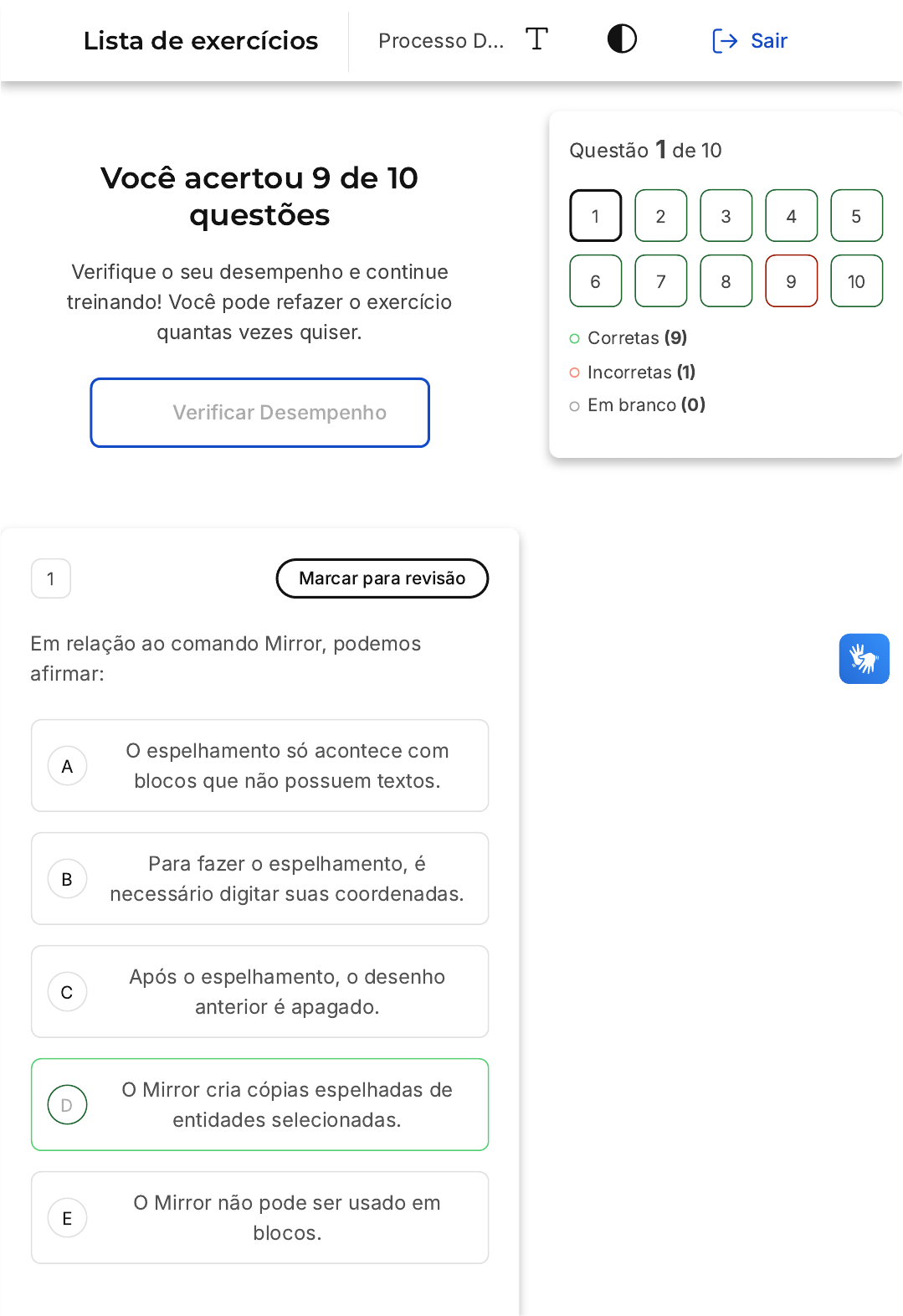 Você acertou 9 de 10 questões Verifique o seu desempenho e continue treinando! Você pode refazer o exercício quantas vezes quiser. Verificar Desempenho A B C D E 1 Marcar para revisão Em relação ao comando Mirror, podemos afirmar: O espelhamento só acontece com blocos que não possuem textos. Para fazer o espelhamento, é necessário digitar suas coordenadas. Após o espelhamento, o desenho anterior é apagado. O Mirror cria cópias espelhadas de entidades selecionadas. O Mirror não pode ser usado em blocos. Questão 1 de 10 Corretas (9) Incorretas (1) Em branco (0) 1 2 3 4 5 6 7 8 9 10 Lista de exercícios Processo D… Sair Resposta correta Parabéns, você selecionou a alternativa correta. Confira o gabarito comentado! Gabarito Comentado A alternativa correta é a D, que afirma que o comando Mirror cria cópias espelhadas de entidades selecionadas. Isso significa que, ao utilizar o comando Mirror, o programa irá gerar uma réplica do objeto selecionado, mas em uma orientação espelhada. As demais alternativas estão incorretas, pois o comando Mirror pode ser usado em qualquer tipo de entidade, incluindo blocos com textos, não é necessário digitar coordenadas para realizar o espelhamento e o desenho original não é apagado após o espelhamento. 2 Marcar para revisão No AutoCAD, alguns comandos permitem modificar a geometria dos objetos para facilitar a edição dos desenhos técnicos. Um desses comandos é utilizado para estender linhas até um limite especificado, garantindo o alinhamento correto dos elementos dentro do projeto. Com base nesse contexto, analise as alternativas a seguir e assinale a opção que corresponde corretamente ao comando utilizado para essa função. A B C D E Offset Block Layer Extend Line Resposta correta Parabéns, você selecionou a alternativa correta. Confira o gabarito comentado! Gabarito Comentado O comando Extend é utilizado para estender linhas até que encontrem outra entidade selecionada como limite. Esse comando facilita a edição dos desenhos ao ajustar automaticamente os elementos, garantindo um alinhamento preciso dentro do projeto. 3 Marcar para revisão No AutoCAD, alguns comandos permitem modificar a posição, o tamanho e a orientação dos objetos no desenho técnico. Há um comando específico que possibilita mover, rotacionar e escalonar um objeto de uma única A B C D E vez, garantindo eficiência no ajuste dos elementos gráficos. Com base nesse contexto, analise as alternativas a seguir e assinale a opção que corresponde corretamente ao comando utilizado para essa função. Move Scale Align Hatch Modify Resposta correta Parabéns, você selecionou a alternativa correta. Confira o gabarito comentado! Gabarito Comentado O comando Align permite mover, rotacionar e escalonar um objeto simultaneamente, garantindo que ele seja ajustado conforme os pontos de referência definidos pelo usuário. Isso torna o processo mais eficiente ao alinhar elementos em relação a outros no desenho técnico. A B C D E 4 Marcar para revisão No AutoCAD, os sistemas de coordenadas permitem a precisão na criação de desenhos técnicos. Uma das funcionalidades essenciais é a utilização do símbolo "@". Considerando esse contexto, analise as alternativas a seguir e assinale a correta. O uso do símbolo "@" é aplicado para coordenadas absolutas, sendo amplamente utilizado para georreferenciamento de pontos. Ao utilizar o comando Line, clicar em um ponto na tela e digitar @150correta Parabéns, você selecionou a alternativa correta. Confira o gabarito comentado! Gabarito Comentado O comando "Divide" é utilizado para marcar um elemento em um determinado número de segmentos iguais através de A B C pontos. Portanto, a alternativa correta é a E. As demais opções, "Units", "Line", "Scale" e "Block", são comandos com funções diferentes no contexto de programação e design gráfico. 9 Marcar para revisão (FCC / TRT - 11a Região (AM e RR) / Analista Judiciário - Arquitetura - 2012) Finalizado o desenho em AutoCAD, para exportar o projeto em PDF, deve-se clicar em: Impressão > Plotar > Impressora / Plotadora > PDF > tamanho do papel > o que plotar > janela > seleciona desenho > visualizar > ok > salvar em > nomear > salvar. Impressão > Plotar > Impressora / Plotadora / Publish to web PDF > tamanho do papel > o que plotar > janela > seleciona desenho > visualizar > ok > imprimir > ok. Menu > enviar > transmissão eletrônica > criar transmissão > selecionar arquivo > ok > salvar em > nomear > salvar. D E A B Impressão > Plotar > Impressora / Plotadora > PDF > tamanho do papel > o que plotar > janela > seleciona desenho > visualizar > ok > imprimir > ok. Salvar como > outros formatos > arquivos tipos > nomear > salvar. Resposta incorreta Opa! A alternativa correta é a letra A. Confira o gabarito comentado! Gabarito Comentado Para exportar um projeto em PDF, deve-se clicar em Impressão > Plotar > Impressora / Plotadora > PDF > tamanho do papel > o que plotar > janela > seleciona desenho > visualizar > ok > salvar em > nomear > salvar. 10 Marcar para revisão Em relação ao comando Measure, assinale a alternativa correta: Muito parecido com o Divide, porém, em vez de informar o número de segmentos a serem divididos, informa a dimensão dos segmentos. Não permite marcar elementos em curva, como círculos e arcos. C D E Não tem a opção de inserirmos blocos nos pontos marcados. Em polilinhas, só funciona em cada vetor separadamente. Funciona em blocos prontos, sem a necessidade de explodi-los. Resposta correta Parabéns, você selecionou a alternativa correta. Confira o gabarito comentado! Gabarito Comentado O comando Measure é muito semelhante ao comando Divide. No entanto, a principal diferença entre eles é que, enquanto o Divide solicita que você informe o número de segmentos em que deseja dividir uma linha, o Measure pede que você especifique a dimensão dos segmentos. Portanto, a alternativa A está correta, pois a